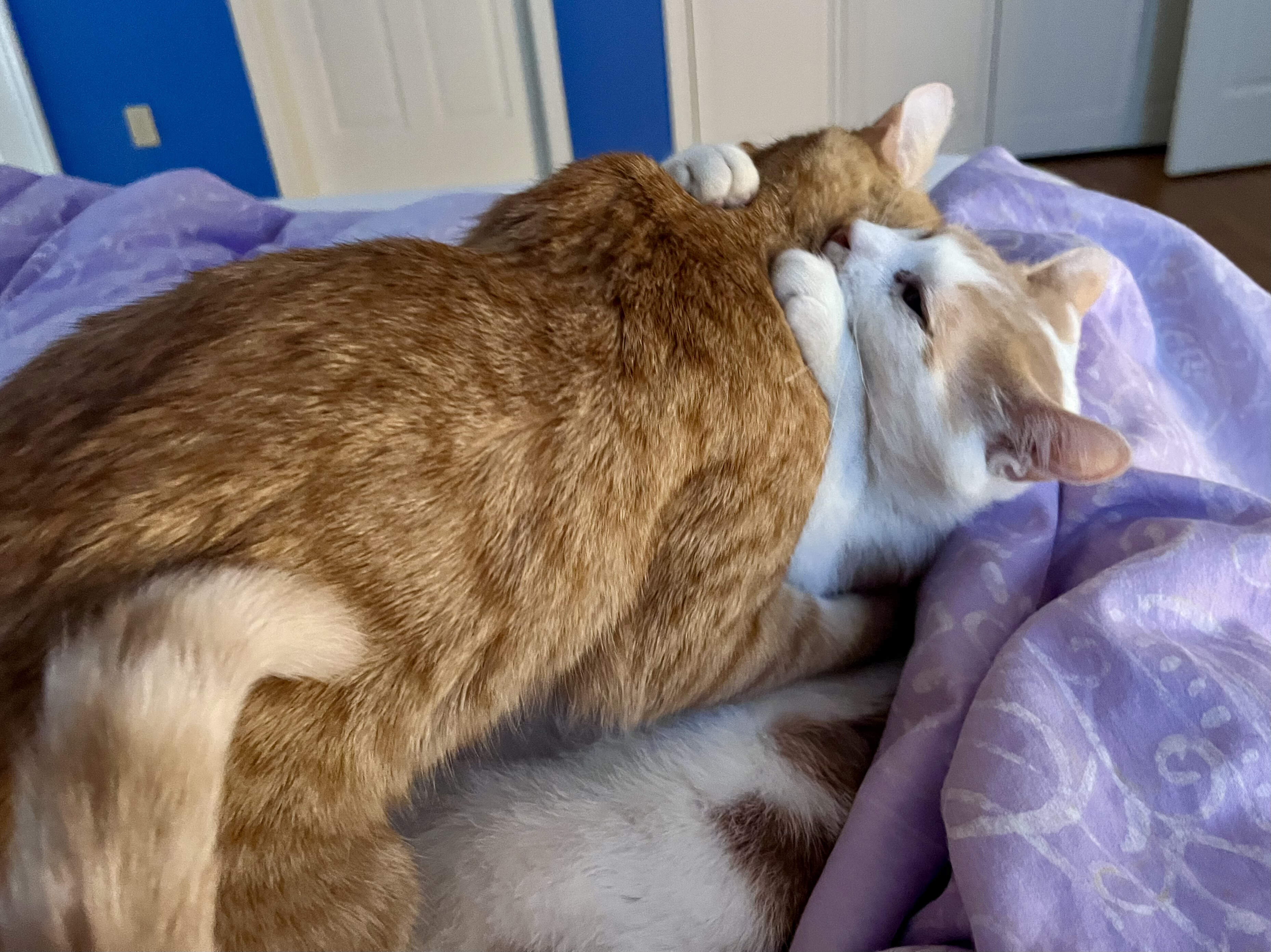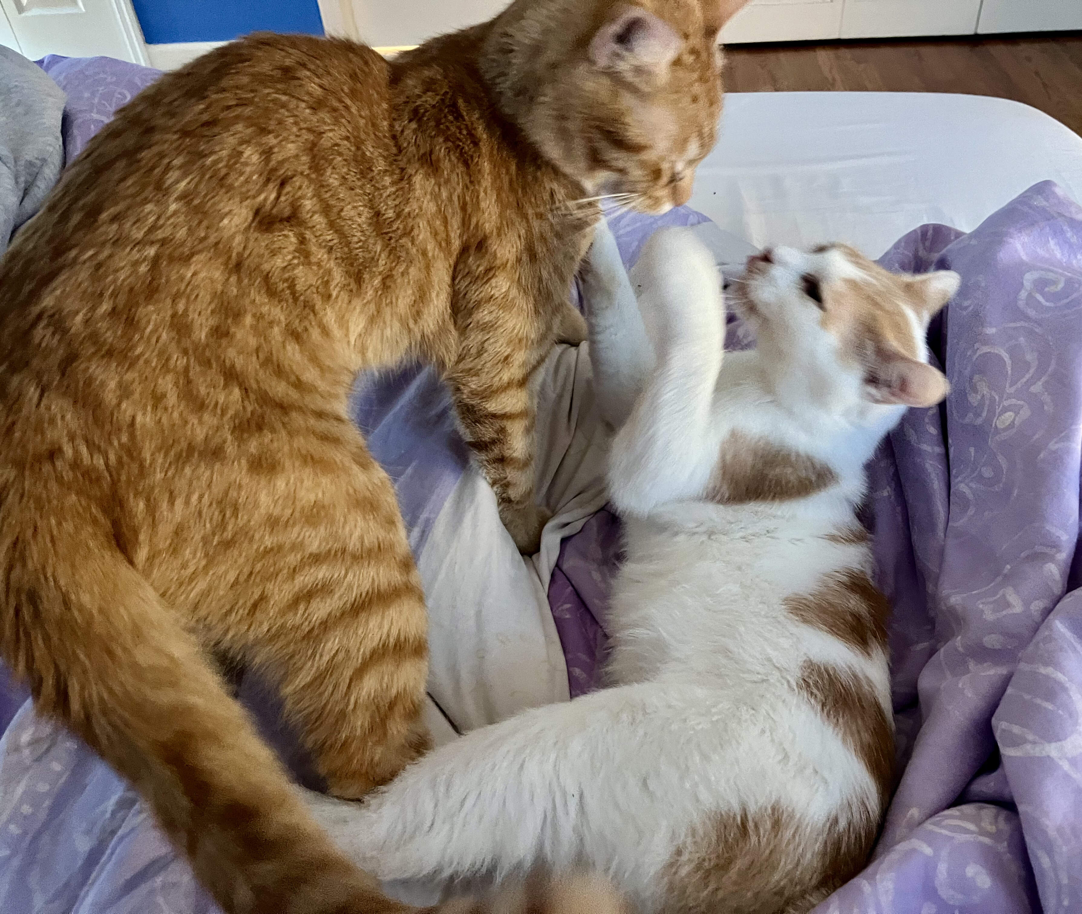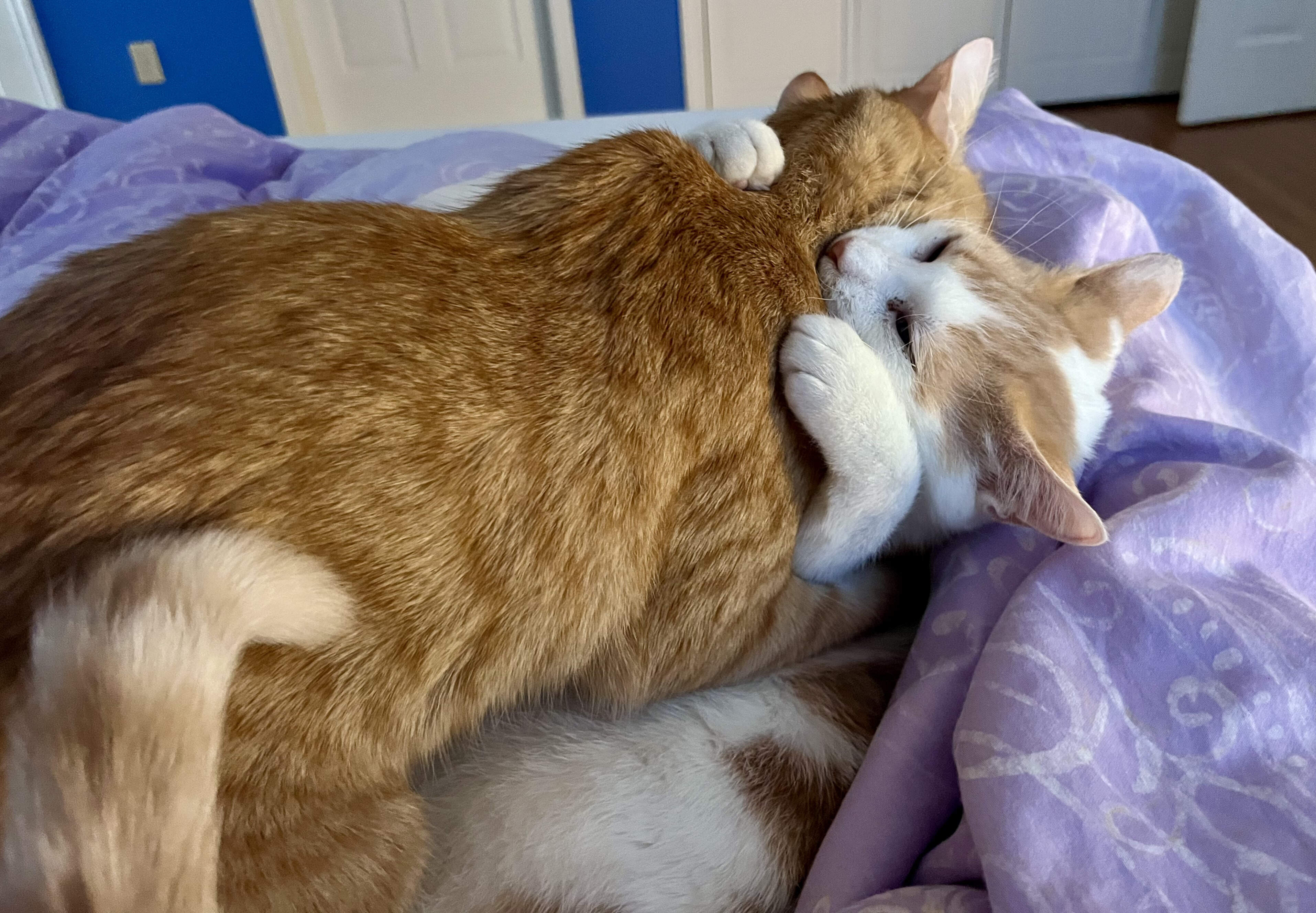 We recently took Owen to the vet, he needed to have his urine tested. He wasn’t cooperating naturally, so they pumped him full of water via an IV. After a few hours the tech picked him up to get him to go in an empty pan. As she carried him in her arms down the hall he gave her his full bladderful urine test, all over her. They sent him home and the roomate followed Owen around the house for most of the next day collecting the minimum amount in a tray. Stubborn baby, but I know he wasn’t feeling well. UTI on top of kidney failure.![]()