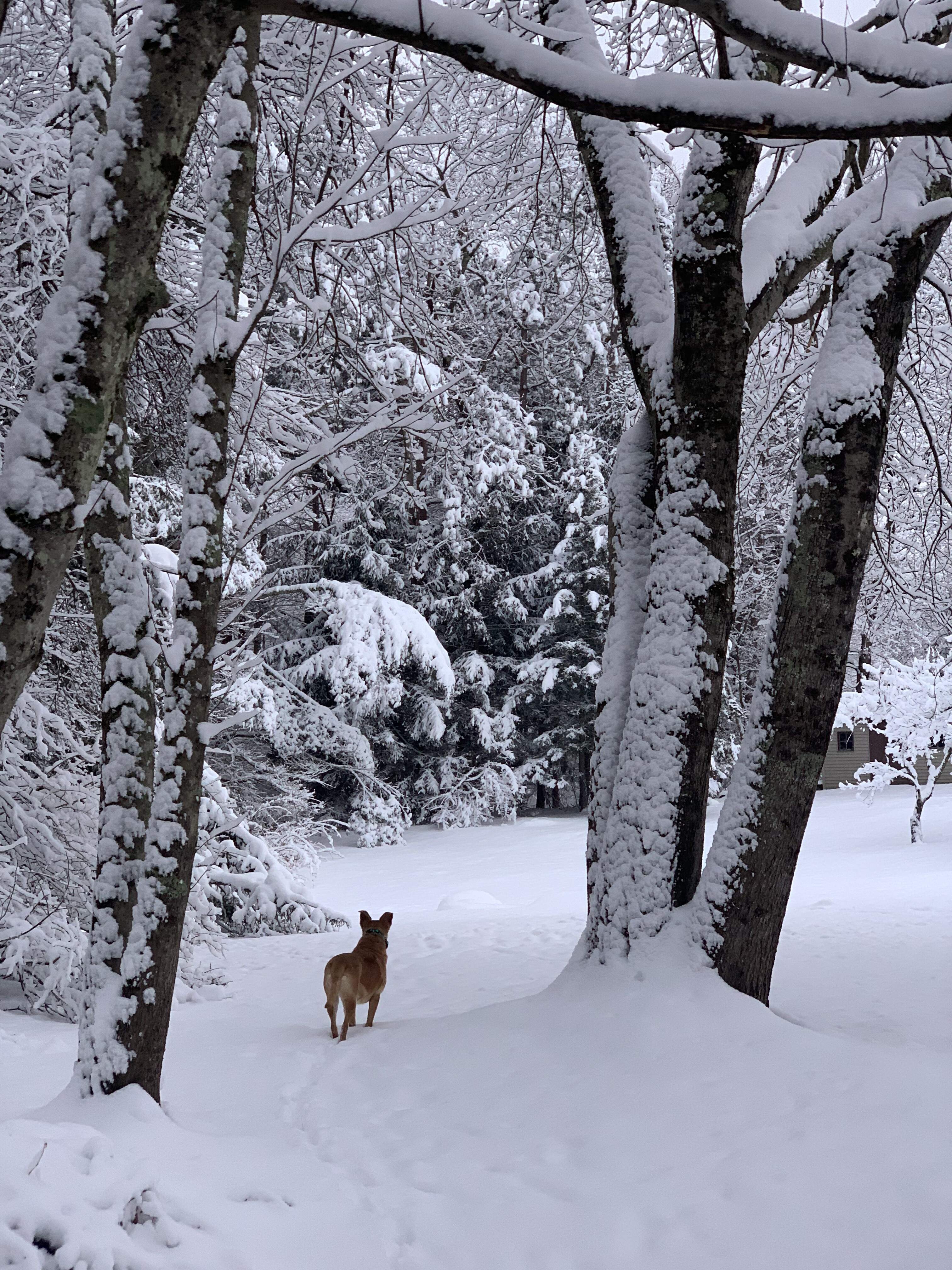 Also she must follow the footprints of any critters that have visited overnight. The rotating cast of characters includes rabbits, squirrels, deer, foxes, possums, a bobcat, and the occasional coyote. Mind you, we live near a town center in Massachusetts yet she still has lots of critter trails to sniff.