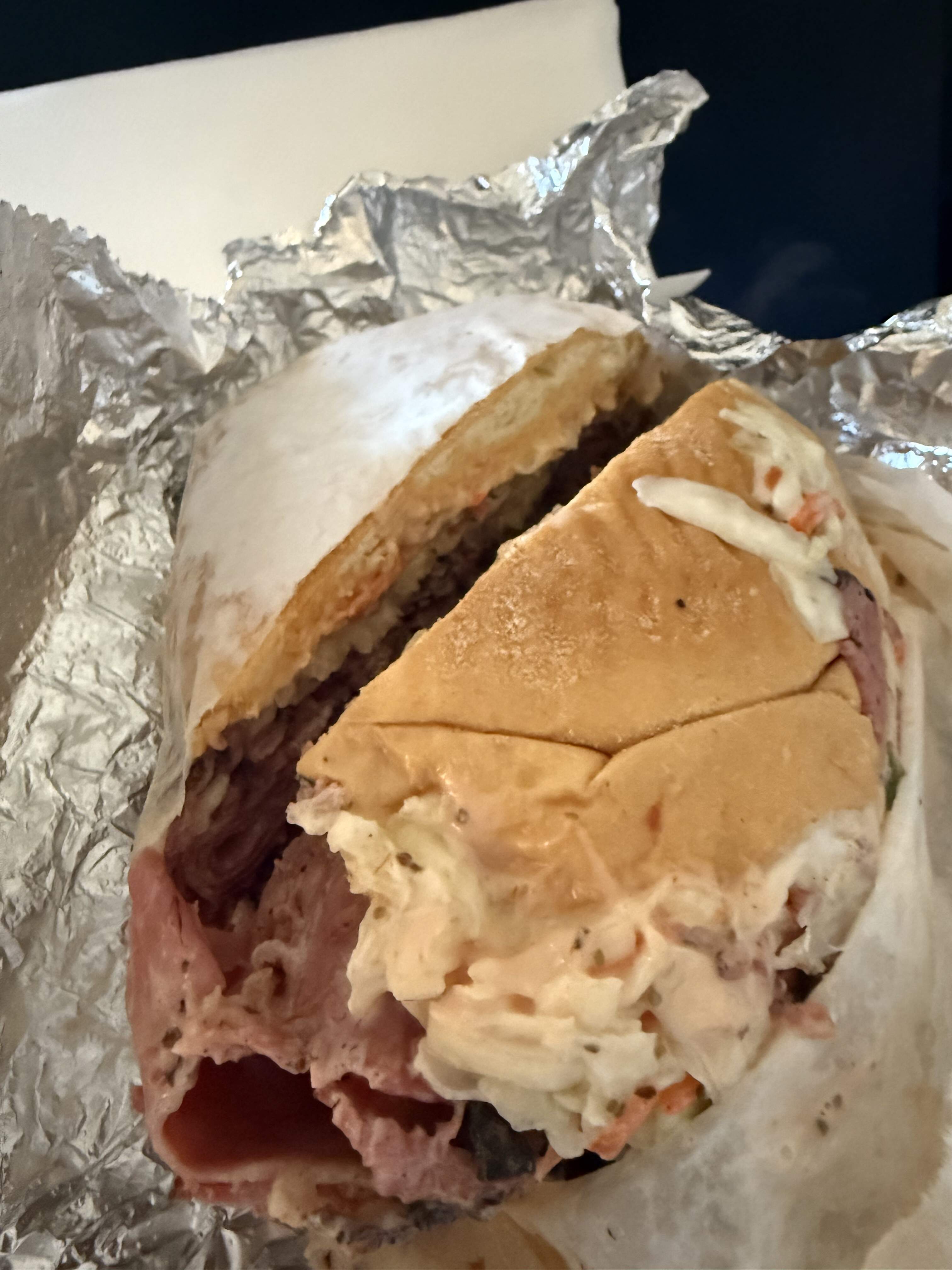 Cath removed today and I passed the human plumbing test. I was in tears I was so afraid it would be permanent. So when we got home My aide and I celebrated with delivery from Attman’s Deli. She had corned beef I had pastrami on a Kaiser roll with Russian dressing and slaw. I could finish about 1/3 (I really haven’t been eating, mostly out of dread).