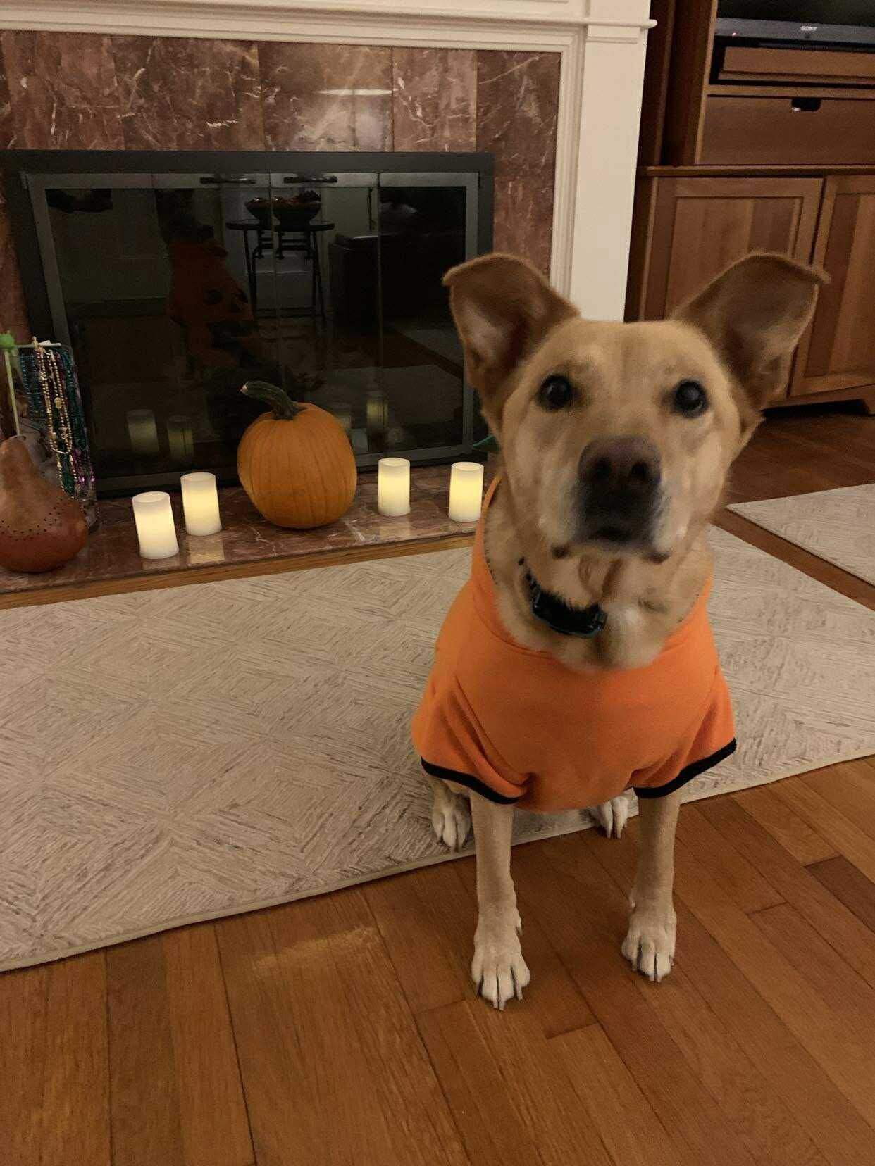 P.S. Another pup just came by the house with her trick o’ treaters wearing this very same pumpkin costume. She got a treat too. Of course!