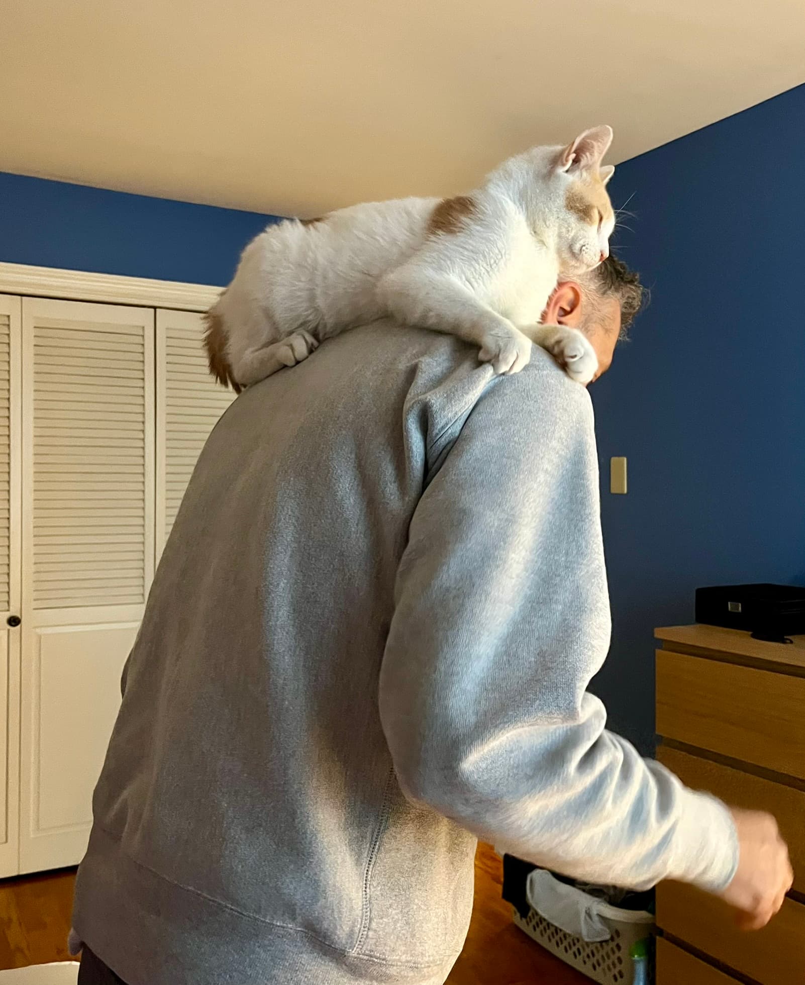 He got on my shoulder/neck, too. It seems a bit awkward, but heâs such a tiny boy he seems to fit just fine ![]()