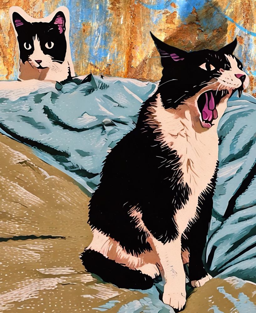 I follow this account on Bluesky, and the artist posted “can’t sleep. reply with a selfie/pet pic and i’ll edit it in some way.” So now I have this!