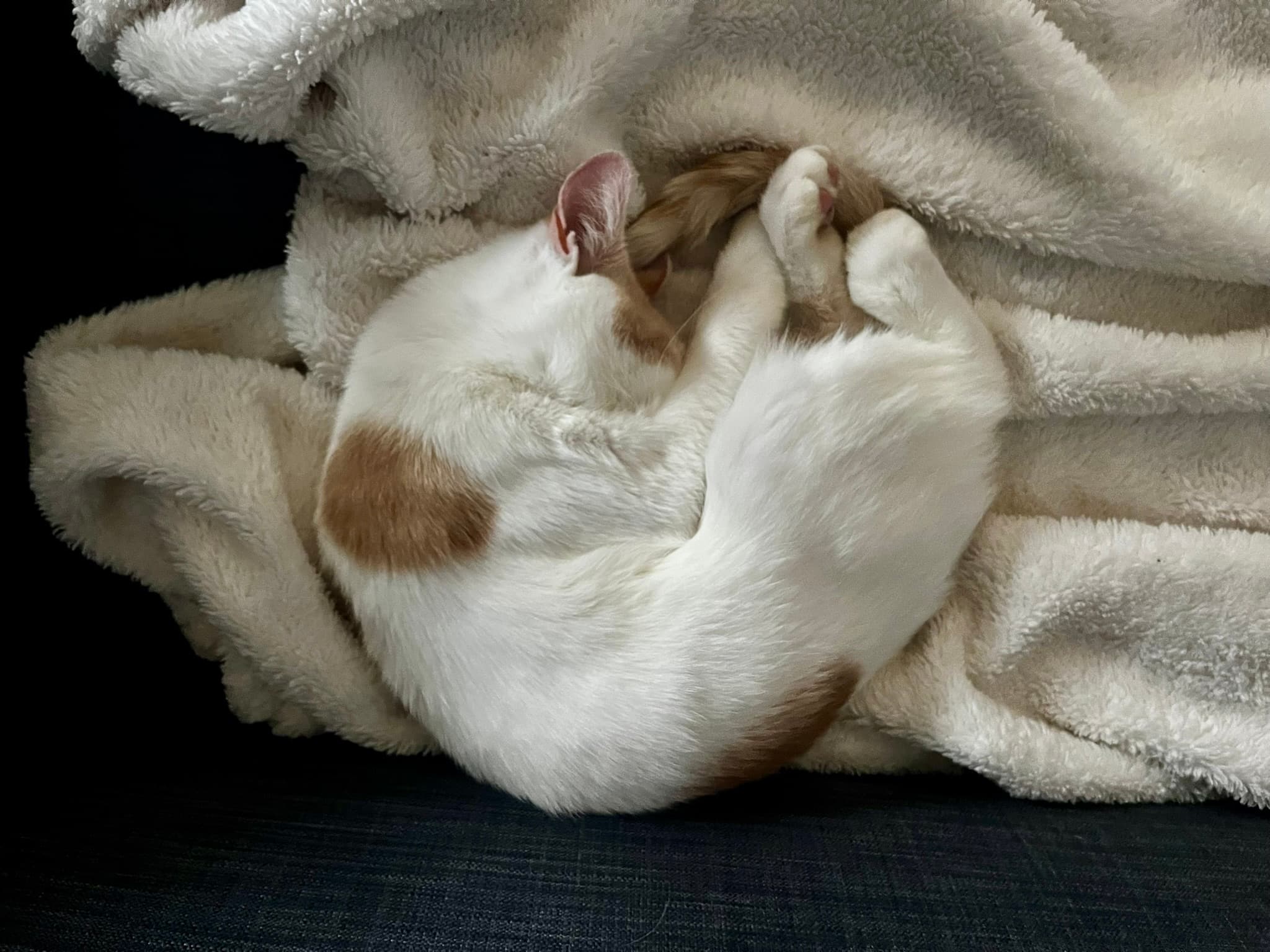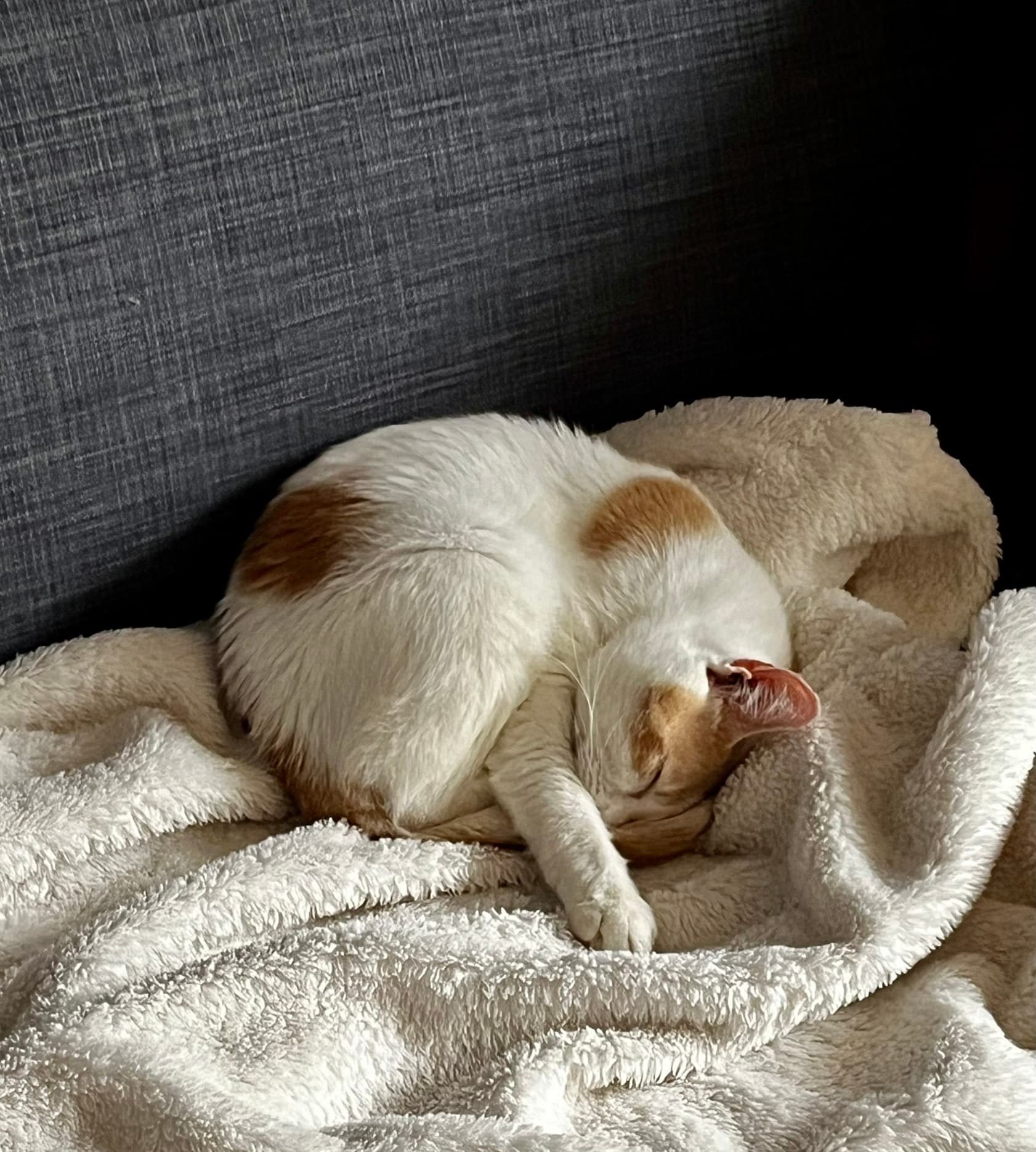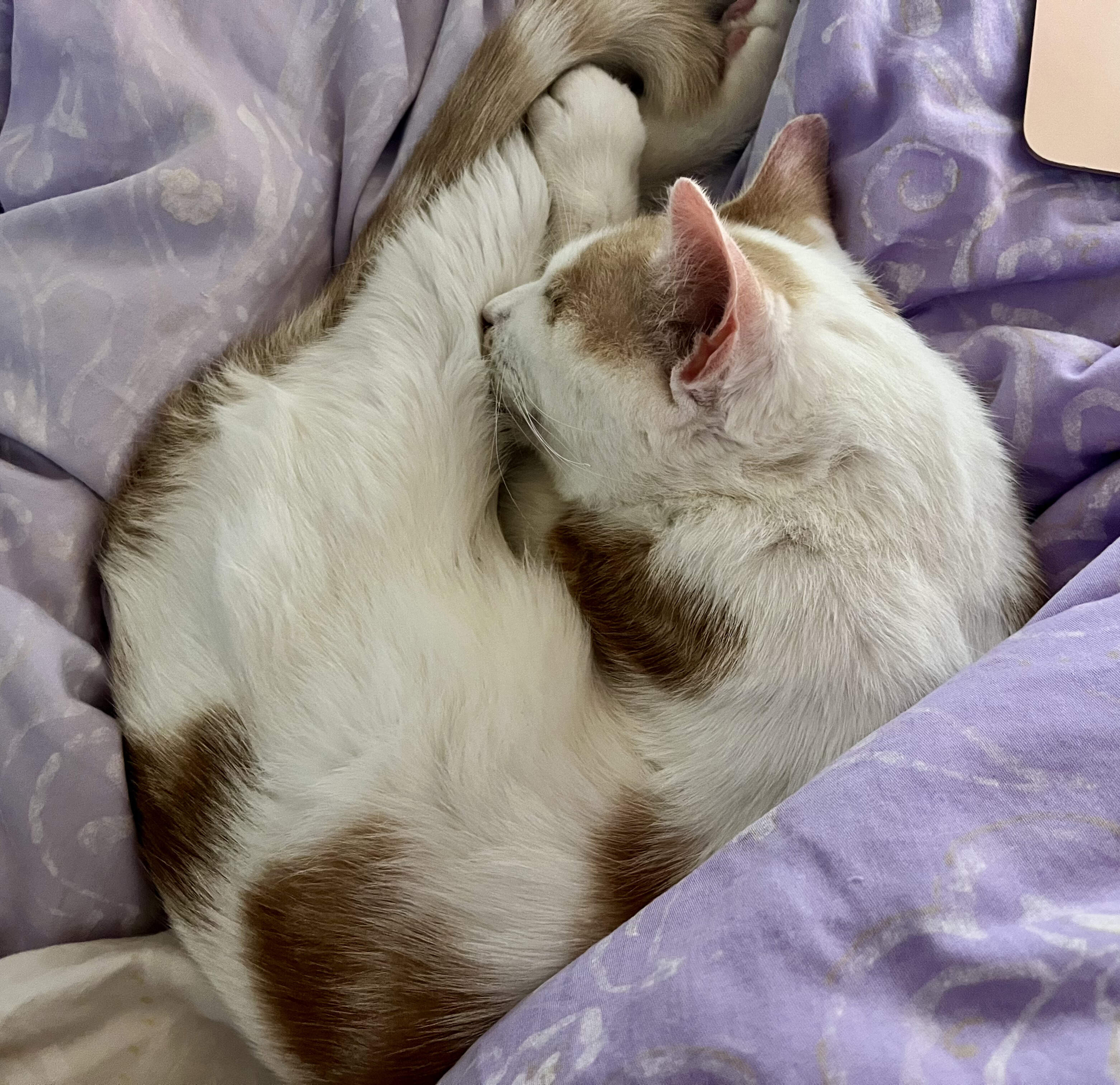 Giacomo catching some Zs and lots n lots of morning snuggles in bed with me, while Jonesy is barking at his toys in the living room. He’s a goofball ![]()