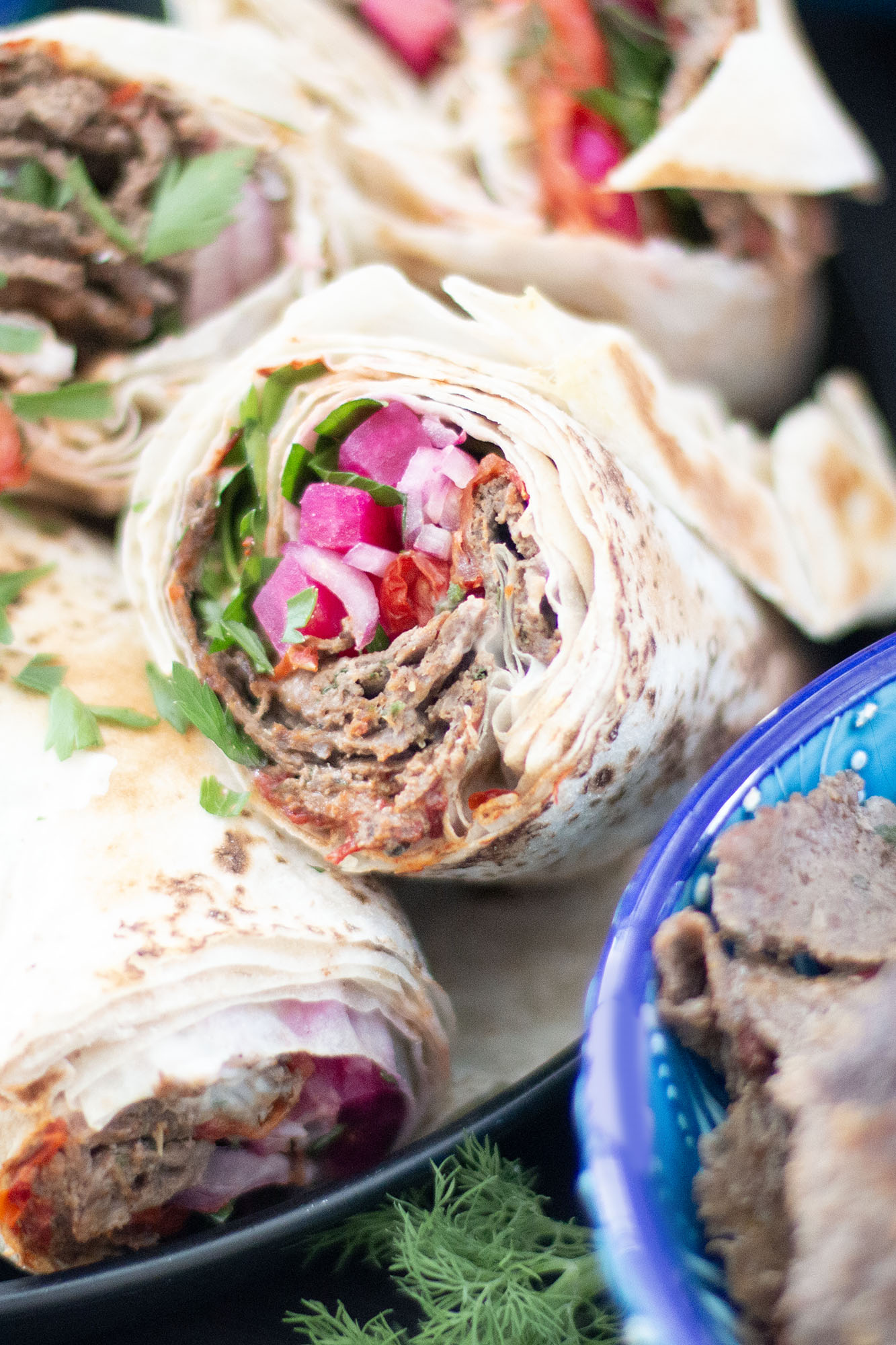2) “Smashed” Kababs / Koobideh – aka easy Lahmacun (tried but no pic – works great!) – kabab mixture flattened on a pita or tortilla, griddled, and then topped or stuffed & rolled. Same technique for Smashed Tacos.