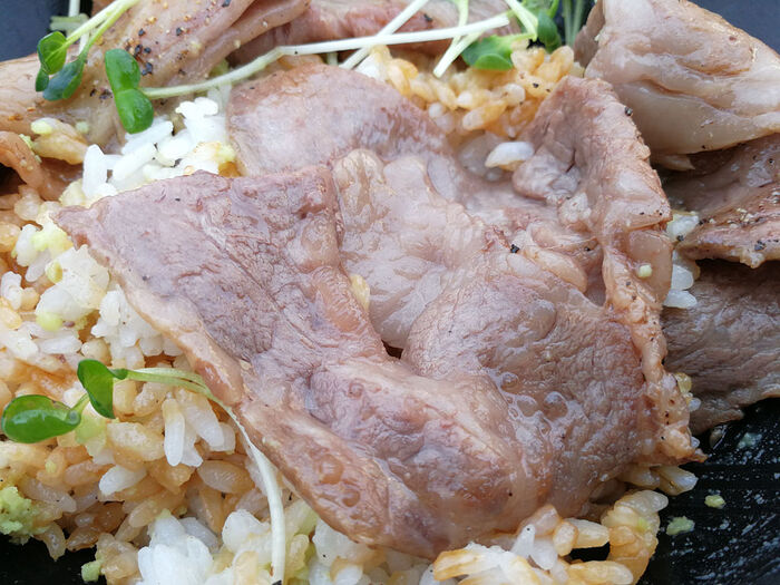 As mentioned earlier, while they have a new Wagyu-focused Dinner menu (which sounds great), the preparations and cuts are all rather strange-ish: They have a Wagyu Salad. Wagyu Katsu (Deep Fried Cutlet) Sandwich, Wagyu Sashimi (Raw), and this Wagyu Kalbi Steak on an hot metal plate (like Fajitas).