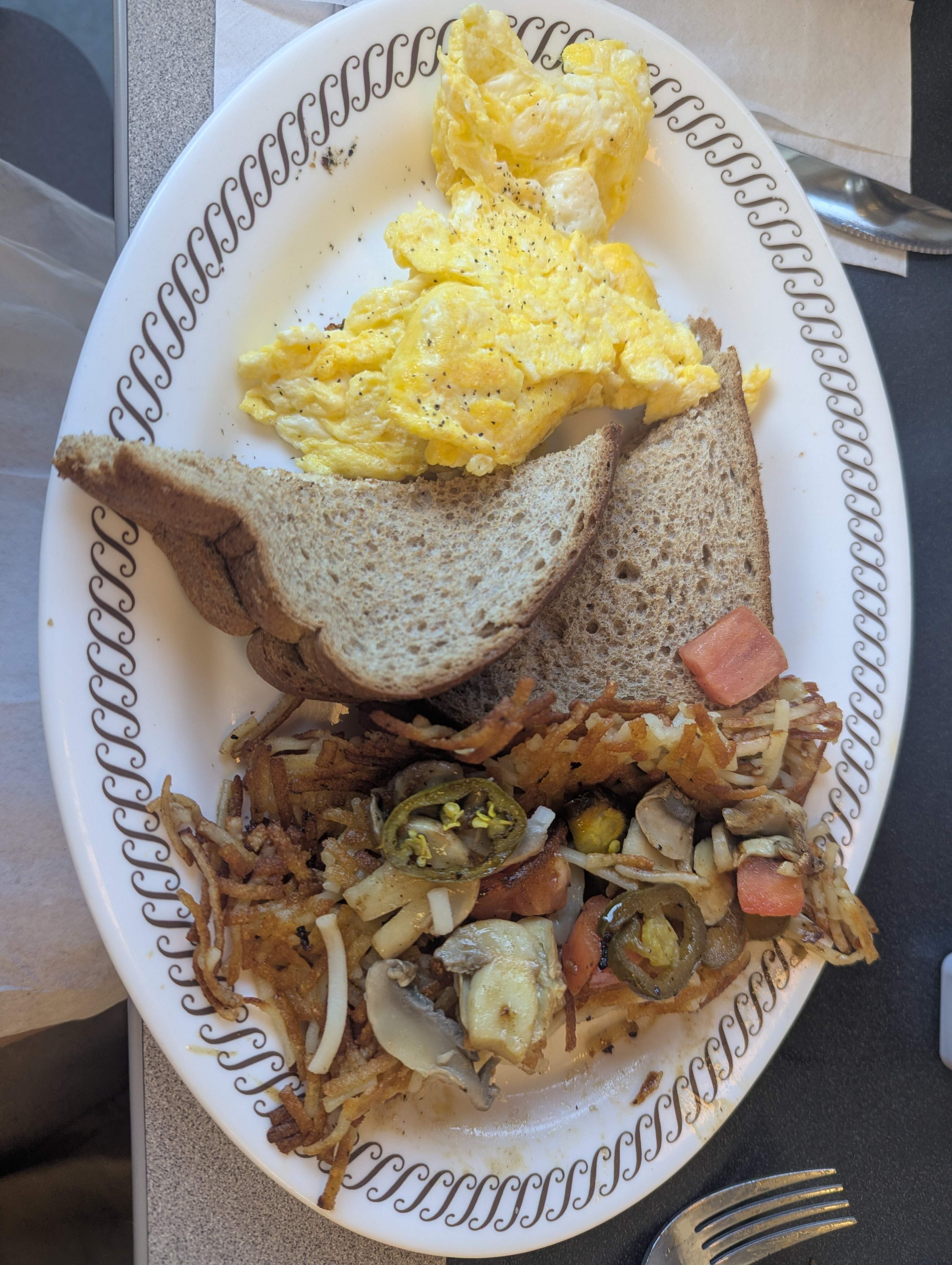 Scrambled eggs, ww toast, hashbrowns well done and topped, peppered, and capped (I think that was the terminology – tomato, jalapeño, and mushroom). I think the mushroom may be canned. Everything was nicely browned at least.