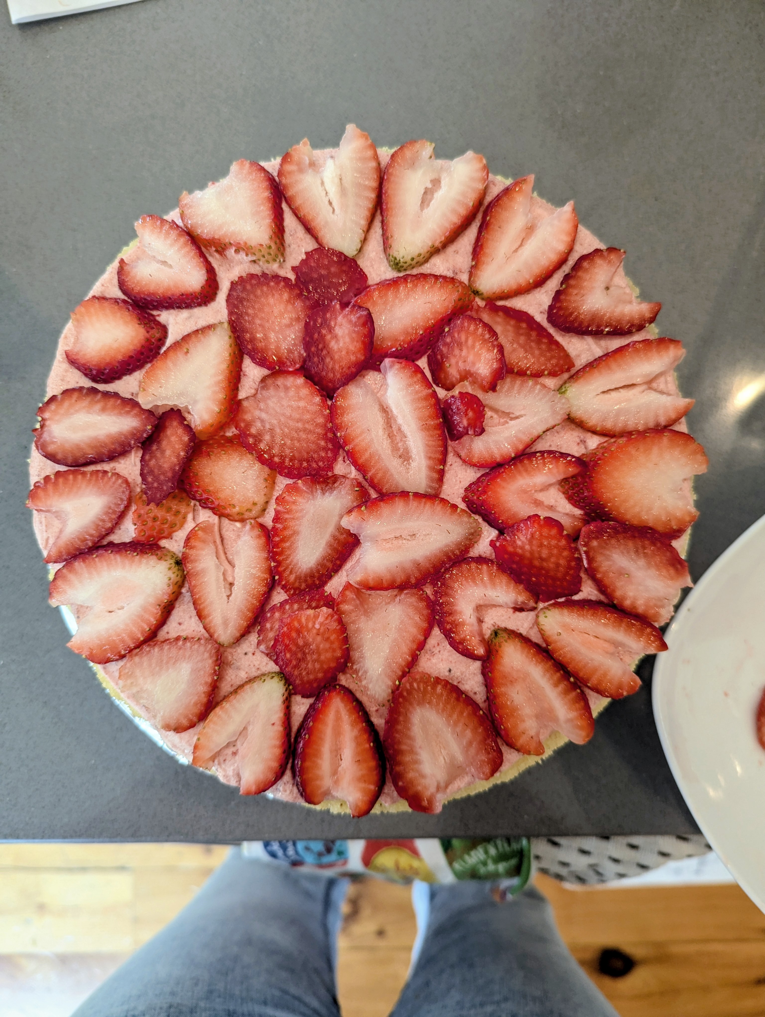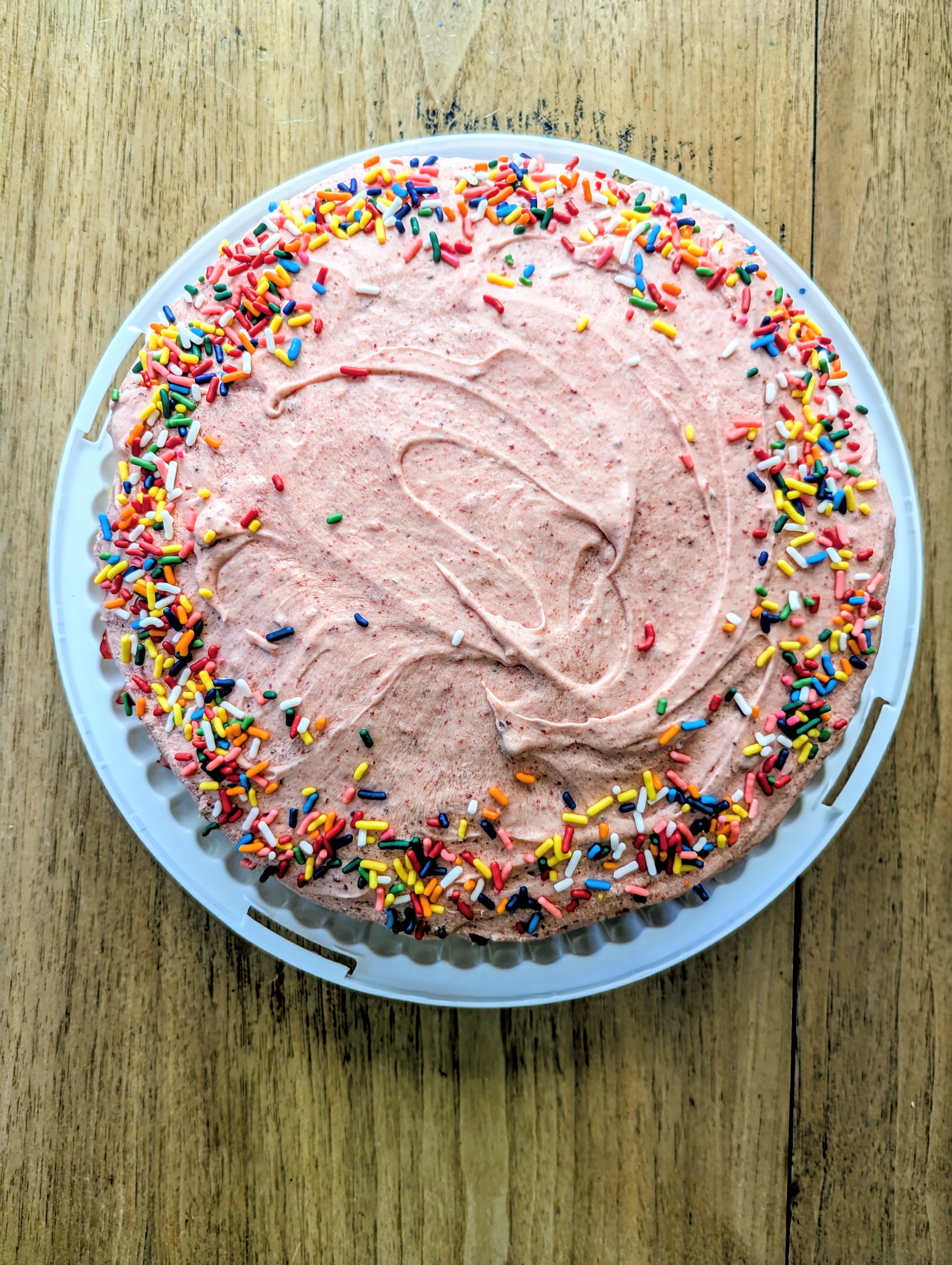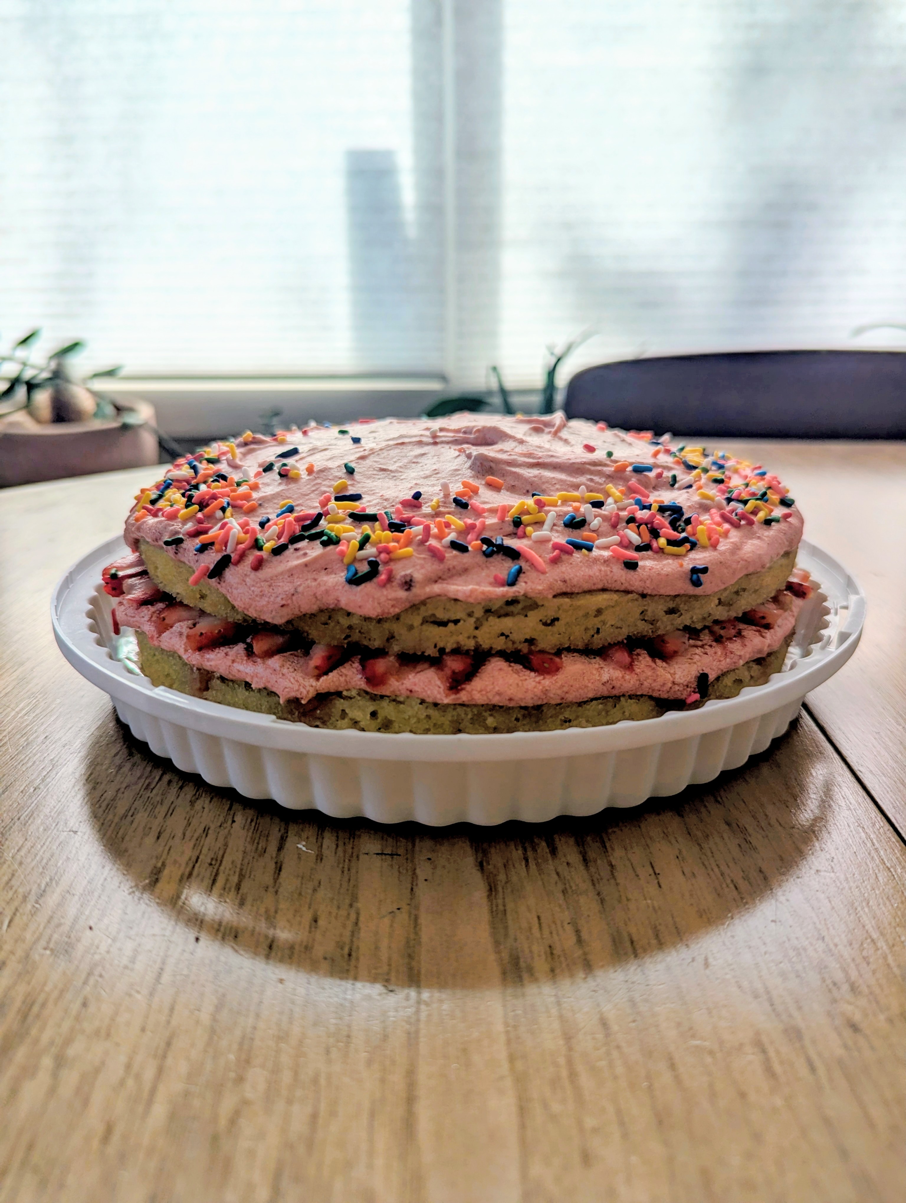 This is a gluten-free, dairy-free cake for my neighbor friend’s birthday. My kitchen was so warm, and the frosting so soft, it started melting a bit as I assembled . Hopefully tastes OK. Cake itself is Aldi boxed mix, and the frosting has both fresh and freeze-dried strawberries in it.