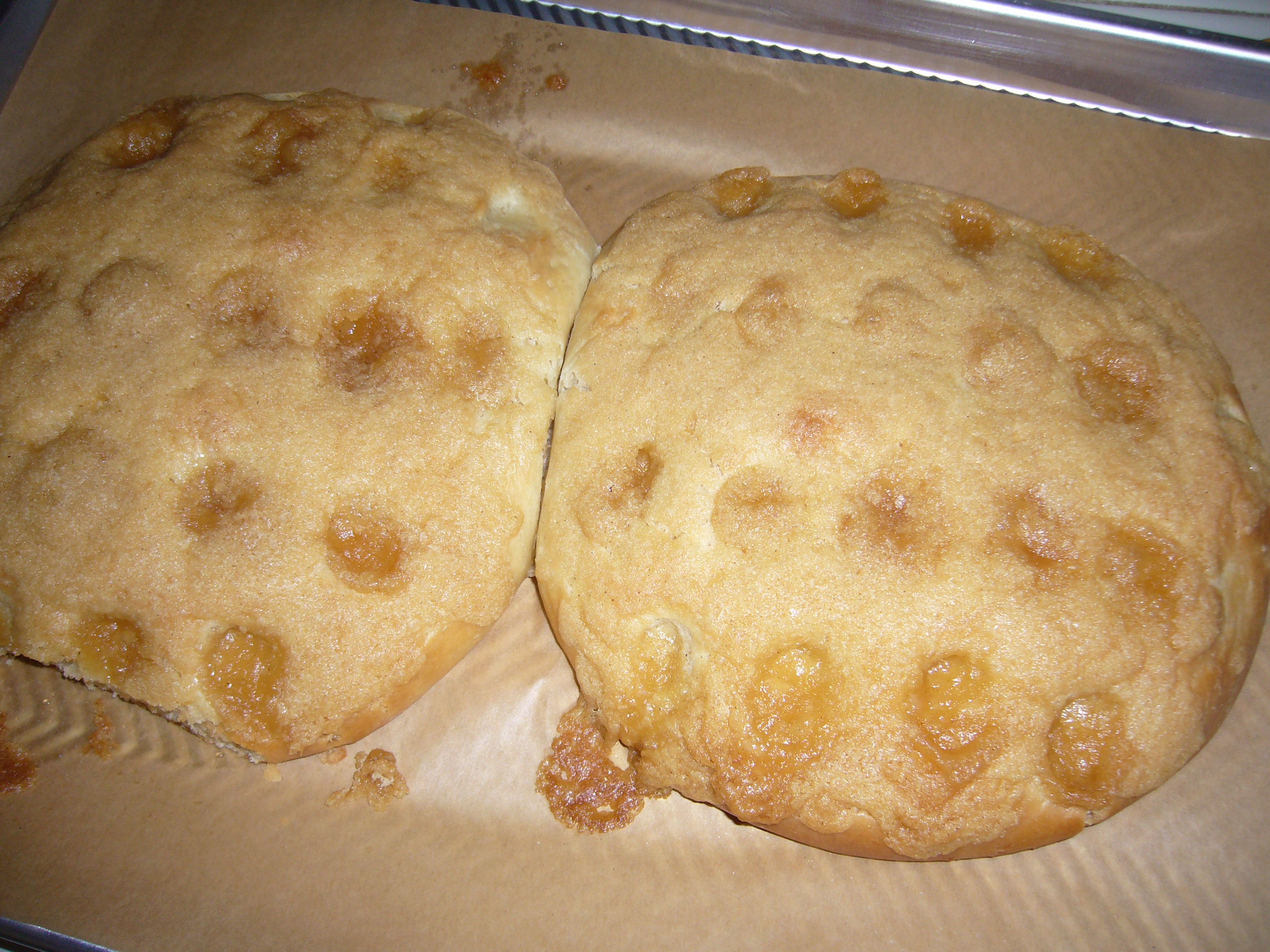 I baked two rounds of this nice cake, with dimples you poke in and fill with melted butter and brown sugar. The dough contains mashed potato! The poster here @pavlova mentioned this cake a while ago, when I had posted a similar bake.