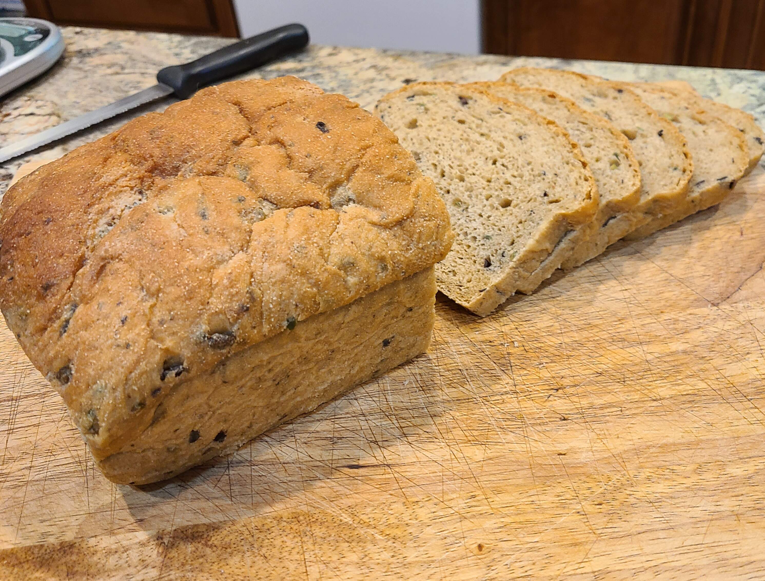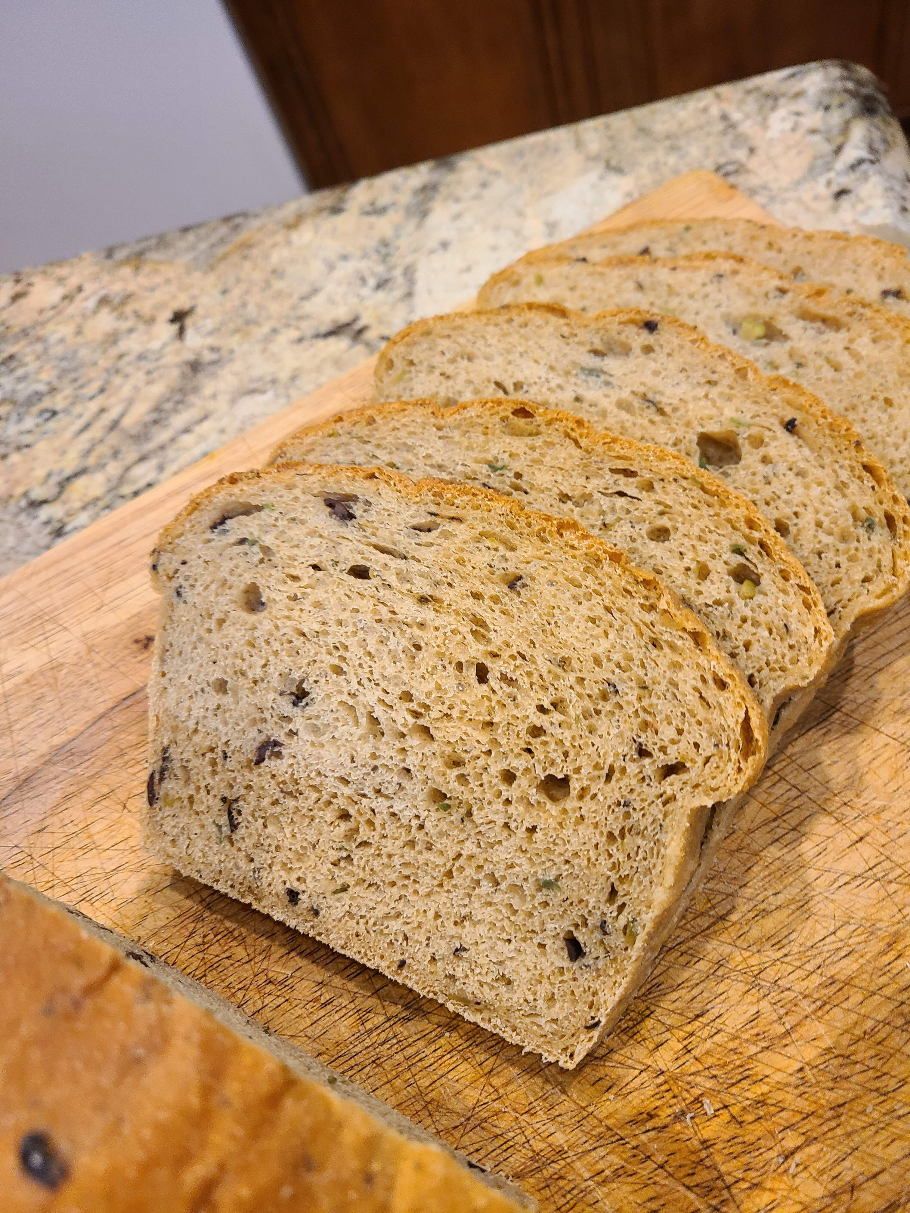 Finally got a nice rise/height from this olive-garlic bread (about 4 inches tall, roughly the same as mass-market breads). The original recipe called for 84% hydration, plus however much liquid gets donated by a cup of chopped olives. I decreased it to about 74%, added enough gluten to get the flour to about 14% protein, and did a longer autolyse.
