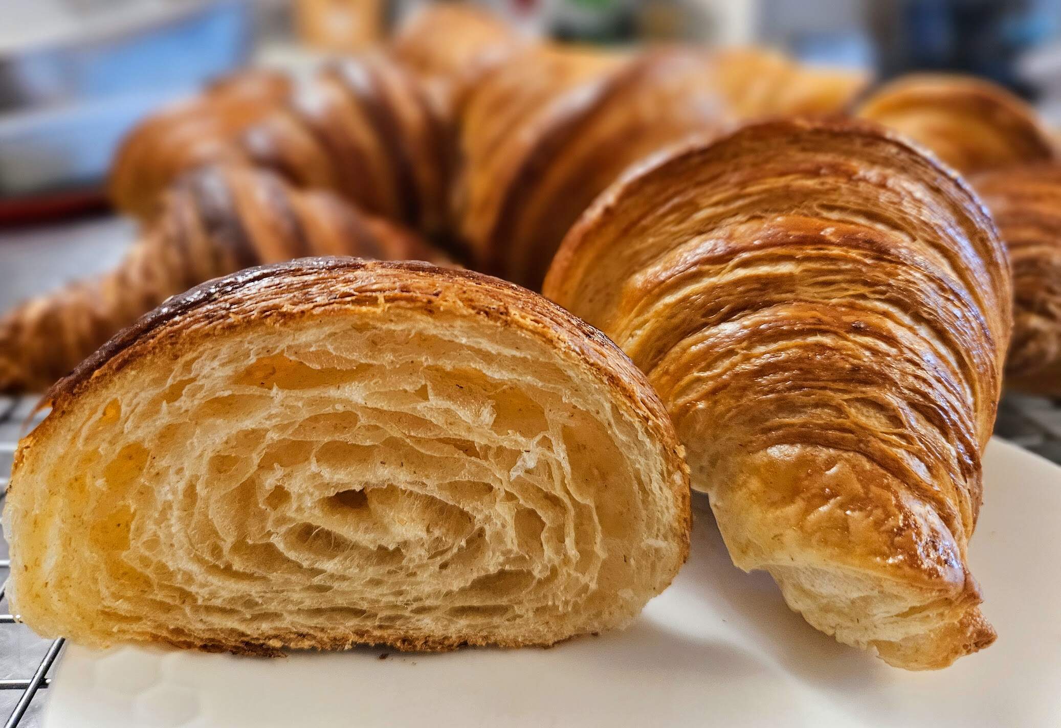 Still working on getting that perfect honeycomb texture with the croissants, but they are getting there. These were made with one letter fold and one book fold. I used organic bread flour along with a freshly ground and sifted blend of soft wheat and spelt. They taste really nice.