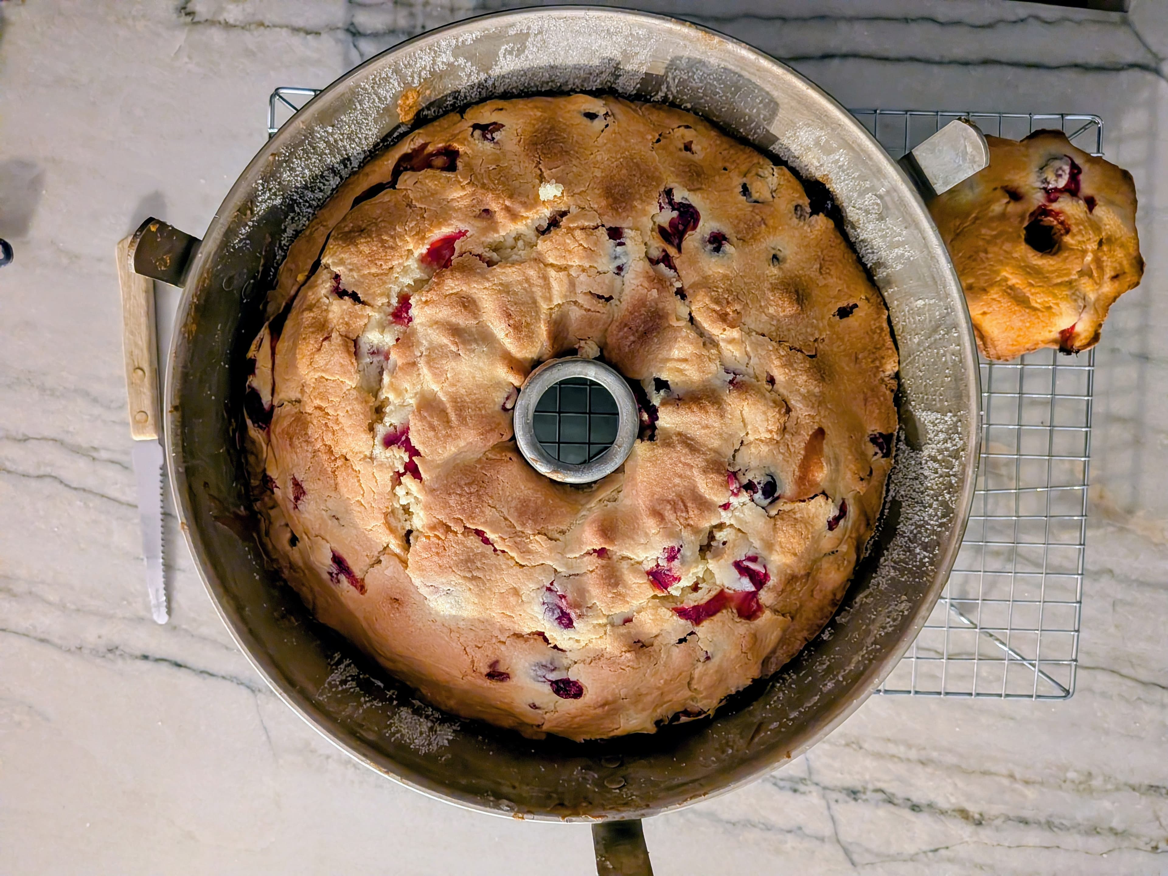 Thanks Caitlin! As posted on Holiday Baking: I have been out of commission for the last 2 weeks.. I was on call and busy with that, and then a cold morphed into a sinus infection, so I seem to have spent most of the last week… sleeping? Starting to get back to myself, but already feeling behind on Christmas baking! I started today with the cranberry cream cheese pound cake for our team holiday potluck tomorrow. Some of you may recall my challenges removing this from the tin in previous years: I used homemade cake goop instead of just butter and also made a mini for a friend. Pray for me later tonight!!