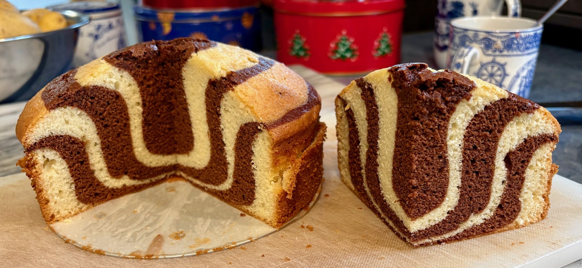 My first crack at the Tigerkaka in a round pan (as opposed to a loaf pan). I made a half recipe in a 6”x2” Fat Daddio loose-bottom pan. Three layers of vanilla alternating with three layers of chocolate. A bit challenging to get the bulls-eye rings even close to even, but if a tiger doesn’t care if his stripes are asymmetrical, why should I?