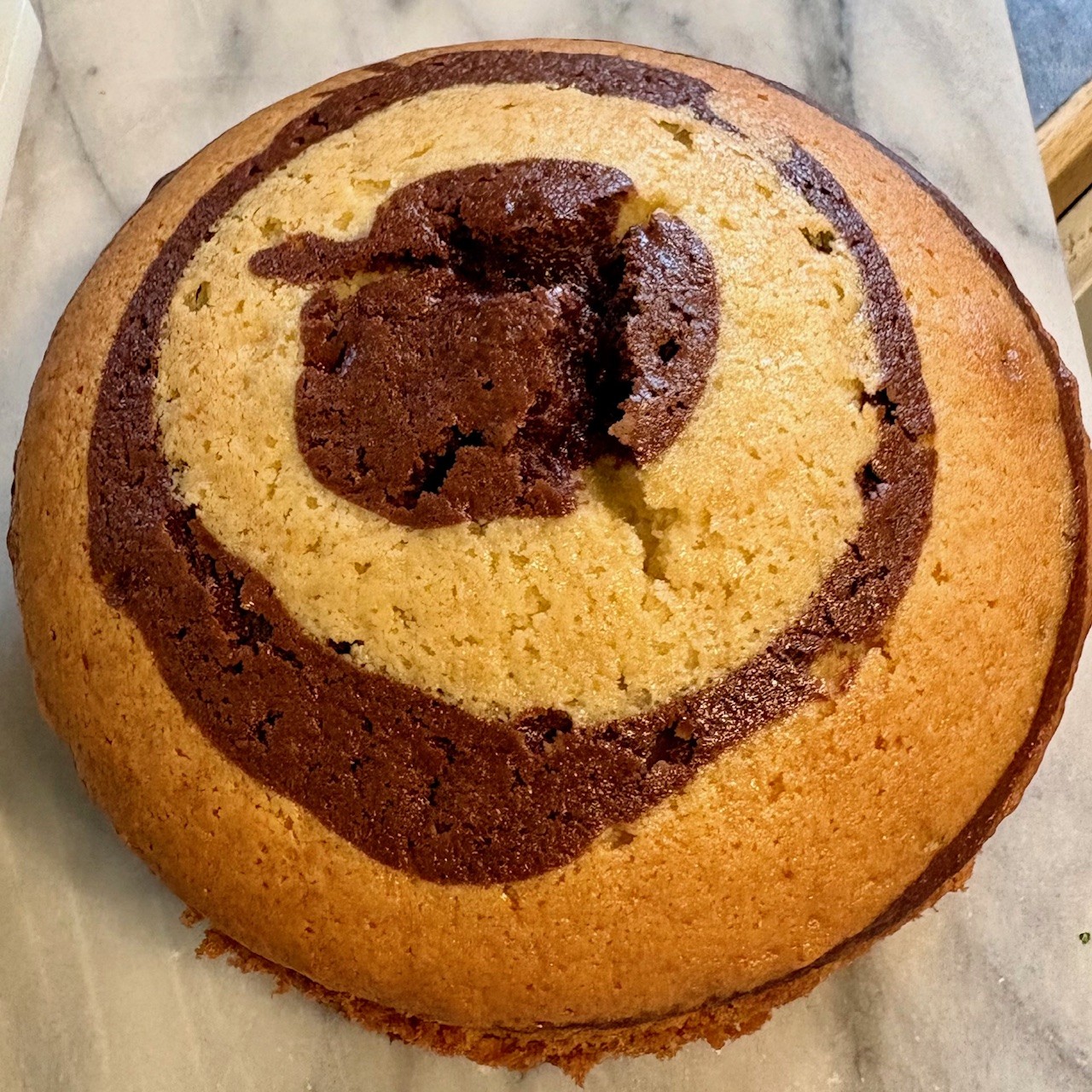 Seriously, it’s very easy. You divide batter roughly 55-60% vanilla and 40-45% chocolate. You pour in a bottom layer of vanilla. Then, in the center of the pan, pour in some of the chocolate directly in the middle on top the vanilla. Repeat two more times - always adding batter directly in to the center - until all the batter is used up. The key is to use slightly less batter with each layer which - when added - will push the layer beneath it out towards the edges, but not quite all the way to the edge (assuming each layer has less and less batter). It will look like a bullseye (albeit a crooked one in my case) going into the oven.