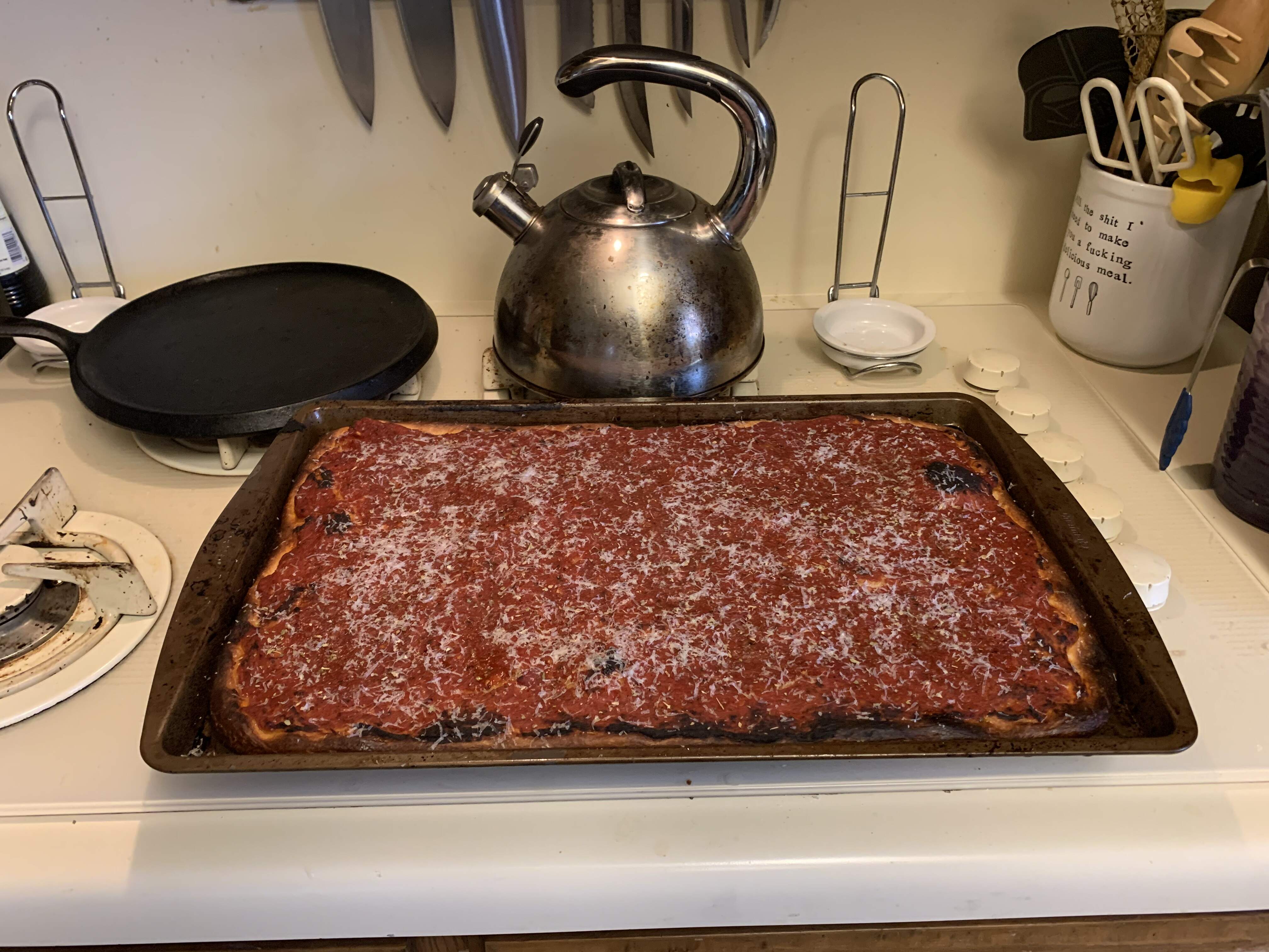Basically a thin focaccia that crisps up really well. Sauce is rich, a touch sweet from the tomato paste and reduction in the oven. Absolutely hit the target I was going for, which is something as good as the “tomato pie” slice from Tomato Pie in L.A., one of my favorite pre-movie dinners when I lived there.