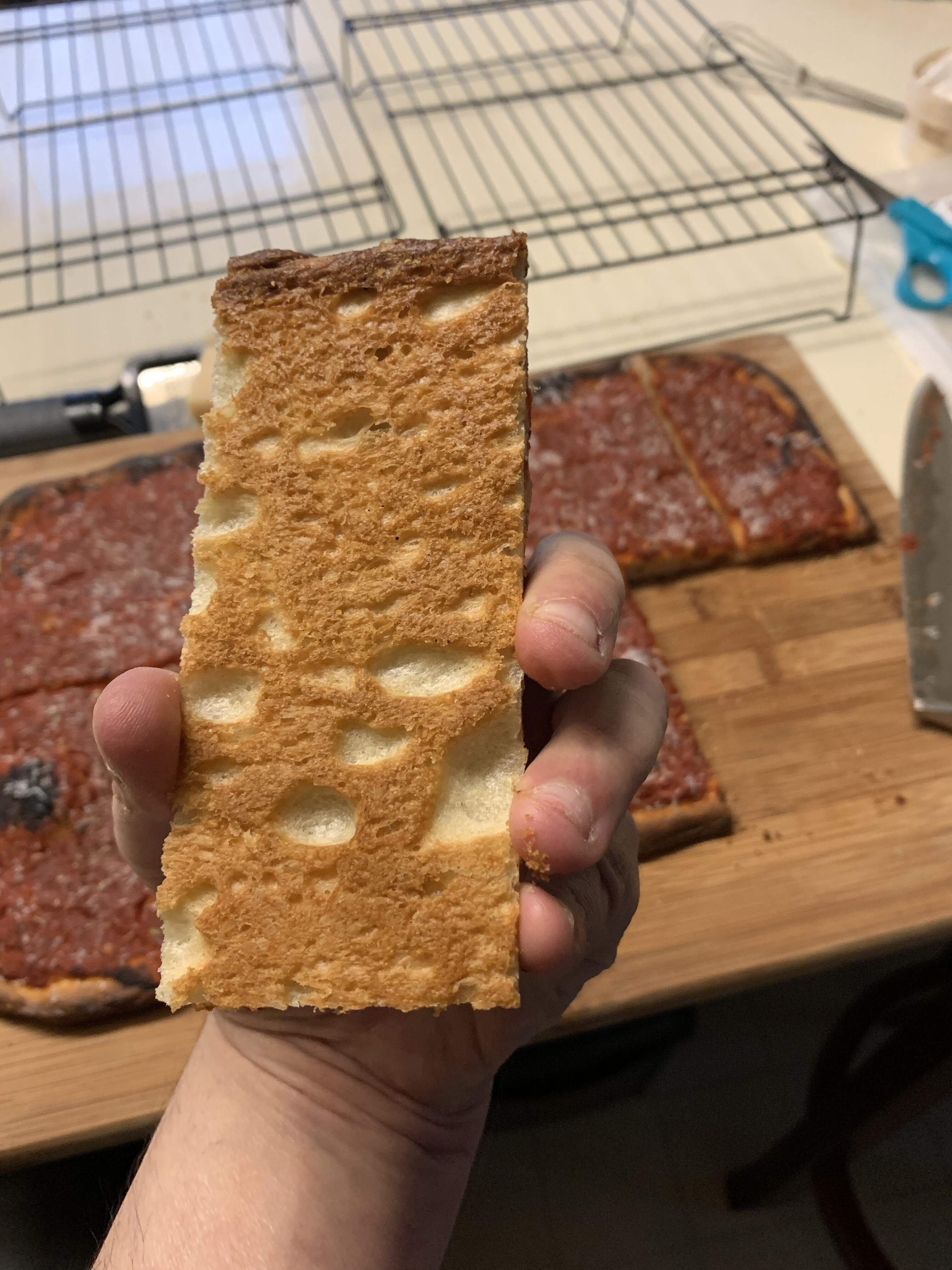 You can use a 13x13 grandma pan (or any other pan w a smaller area) to get a thicker crust. You can also not degas and dimple the dough as much as I did before topping and baking. Being more gentle doing any final shaping/dimpling and spreading the sauce (an offset spatula is your friend!) would leave you with a thicker, breadier crust. The pan size is probably the first variable I’m gonnna play with.