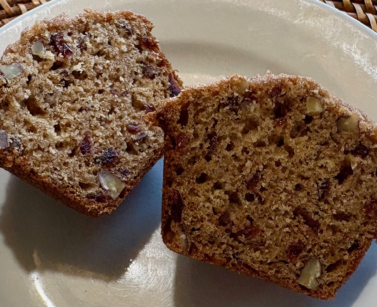 ATK’s Spiced Applesauce Muffins. I added chopped pecans and dried sweetened cranberries, and subbed oil for the butter. I didn’t want to open a new jar of apple juice for the 4 T. required by a half-batch and instead reconstituted a spoonful of boiled cider. The applesauce was homemade from our Honeycrisp apples, processed after canning in the FP until perfectly smooth.