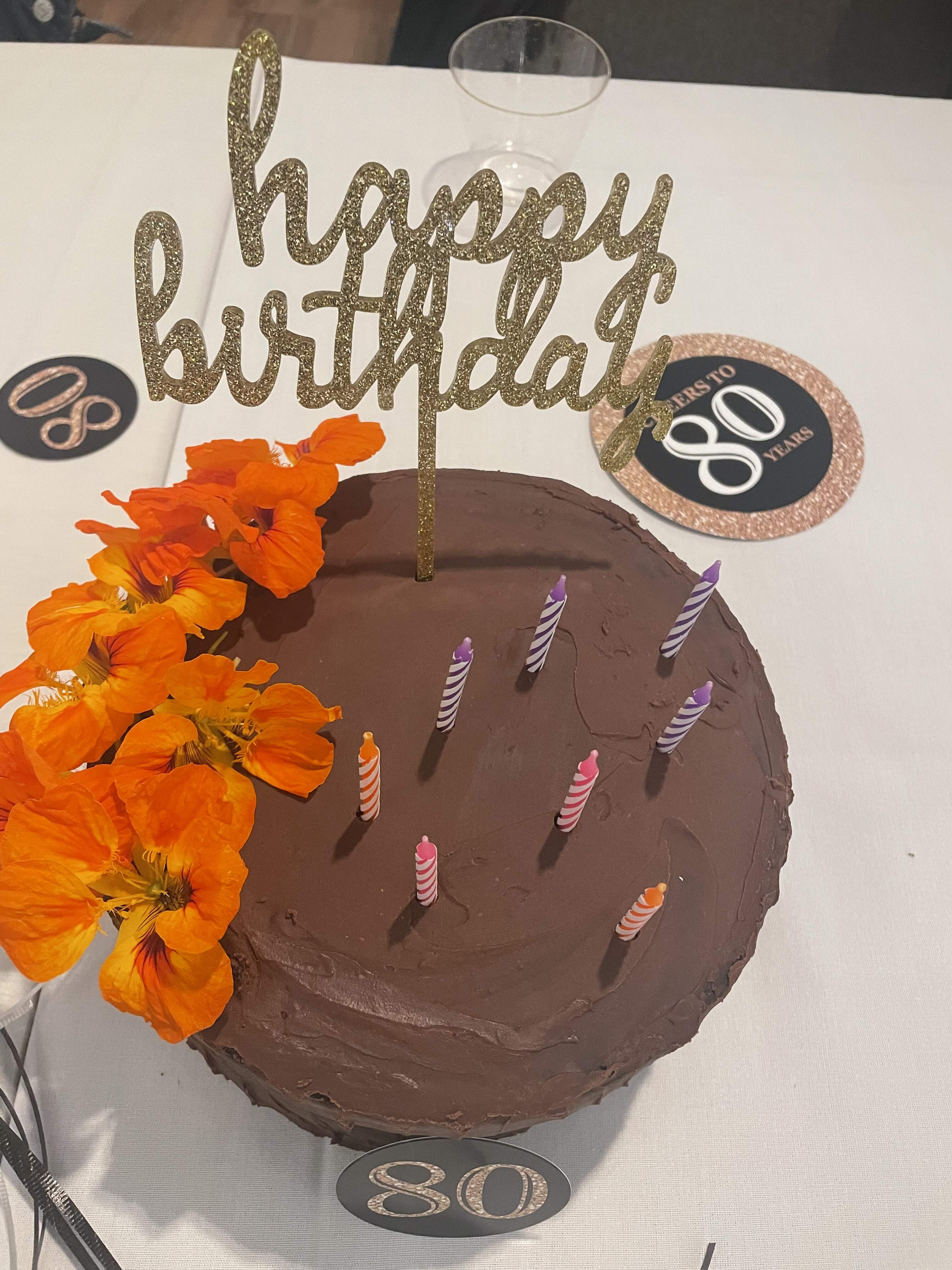I had 3 XL Kentucky butter cakes, two chocolate sour cream bundts, a half-sized reserve chocolate bundt, and a three-layer devil’s food birthday cake with semisweet ganache and edible nasturtiums. There was a LOT of cake leftover, even with very many guests. I had Tupperware with me to bring home slabs of everything for mom. The host family was happy to take the rest, with my blessing.
