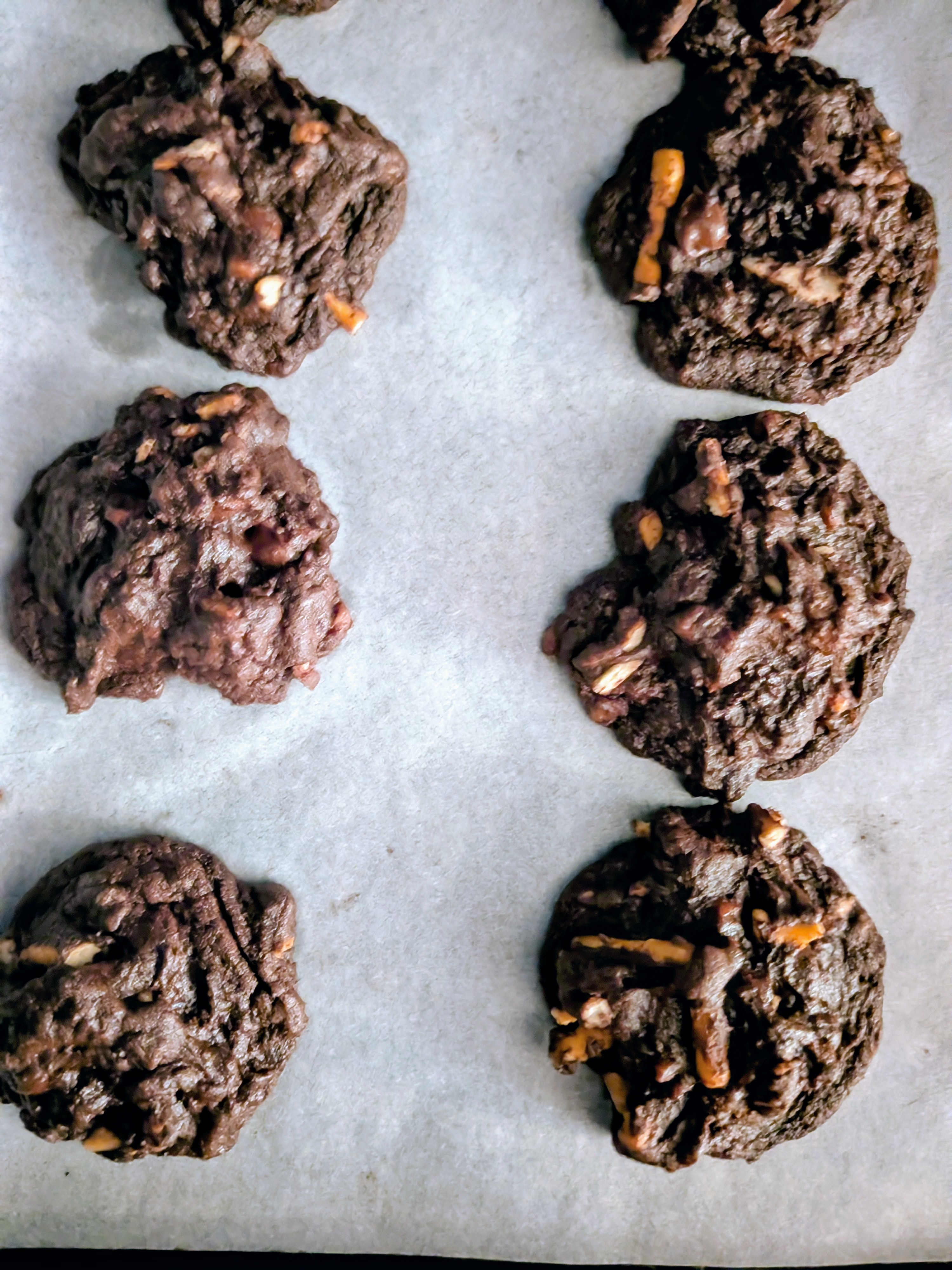 The NYT Chunky Chocolate Cookies: I used pretzels, chocolate chips and toffee bits as the mix-ins. You beat an egg with sugar to start, and then added melted butter and cocoa: I don’t know that I’ve made a cookie like this before? Very good in any case!