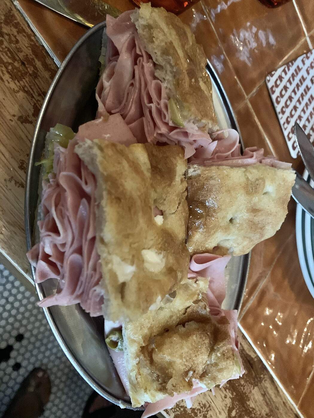 ) – focaccia with pesto, pistachios, castelvetrano olives, burrata, and mortadella.