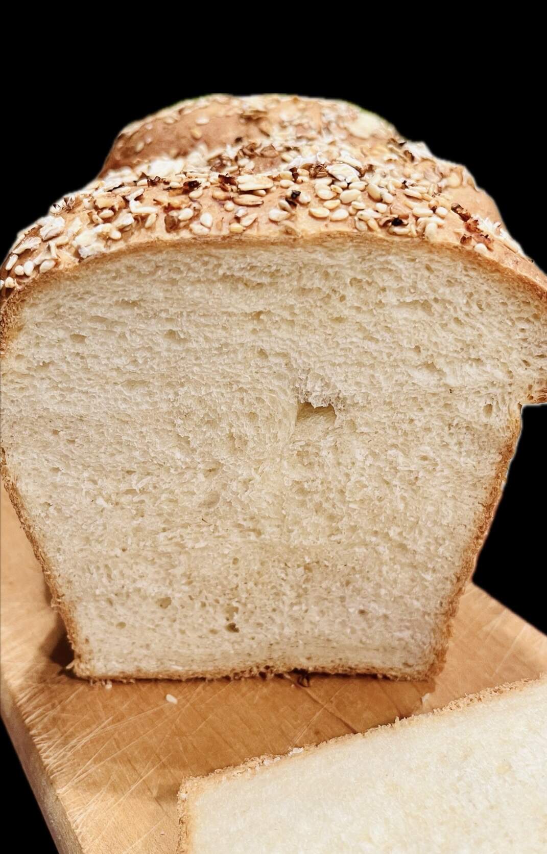 Whole Grain Sandwich. This bread has oats, bread flour, w.w. flour, sesame seeds, some wheat bran. I didn’t have sunflower seeds or flaxseed. Quick to put together. First rise 40 minutes second 35 minutes and is it delicious. Has this crunchy nutty taste. Another one for my rotation. Recipe is from Turkuaz Kitchen.