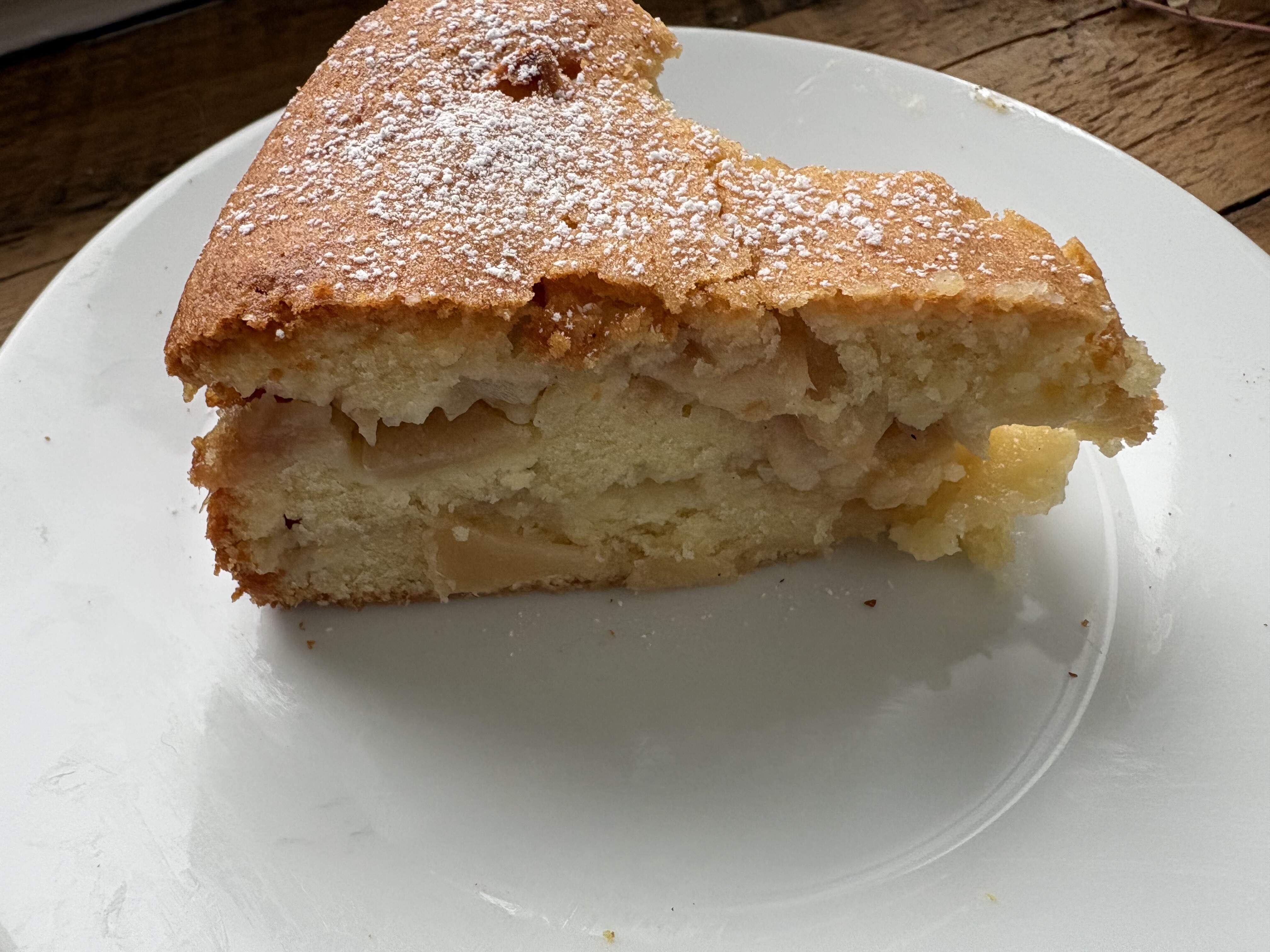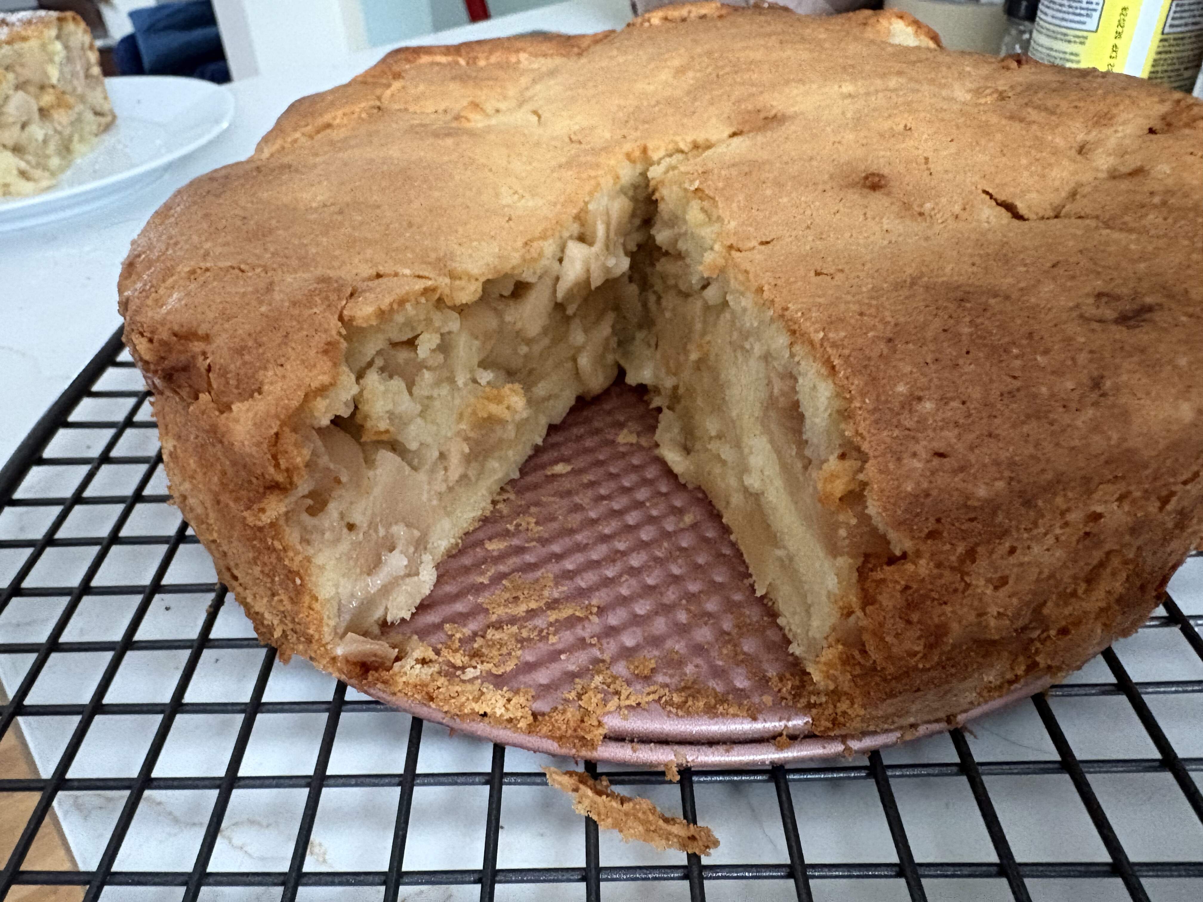 It’s a standard cake batter with 5 tablespoons of rum, layered with a sliced apple, cream and sugar mixture. There are cakes parts and custardy parts and lots of flavour, but now I have a giant cake to get rid of….