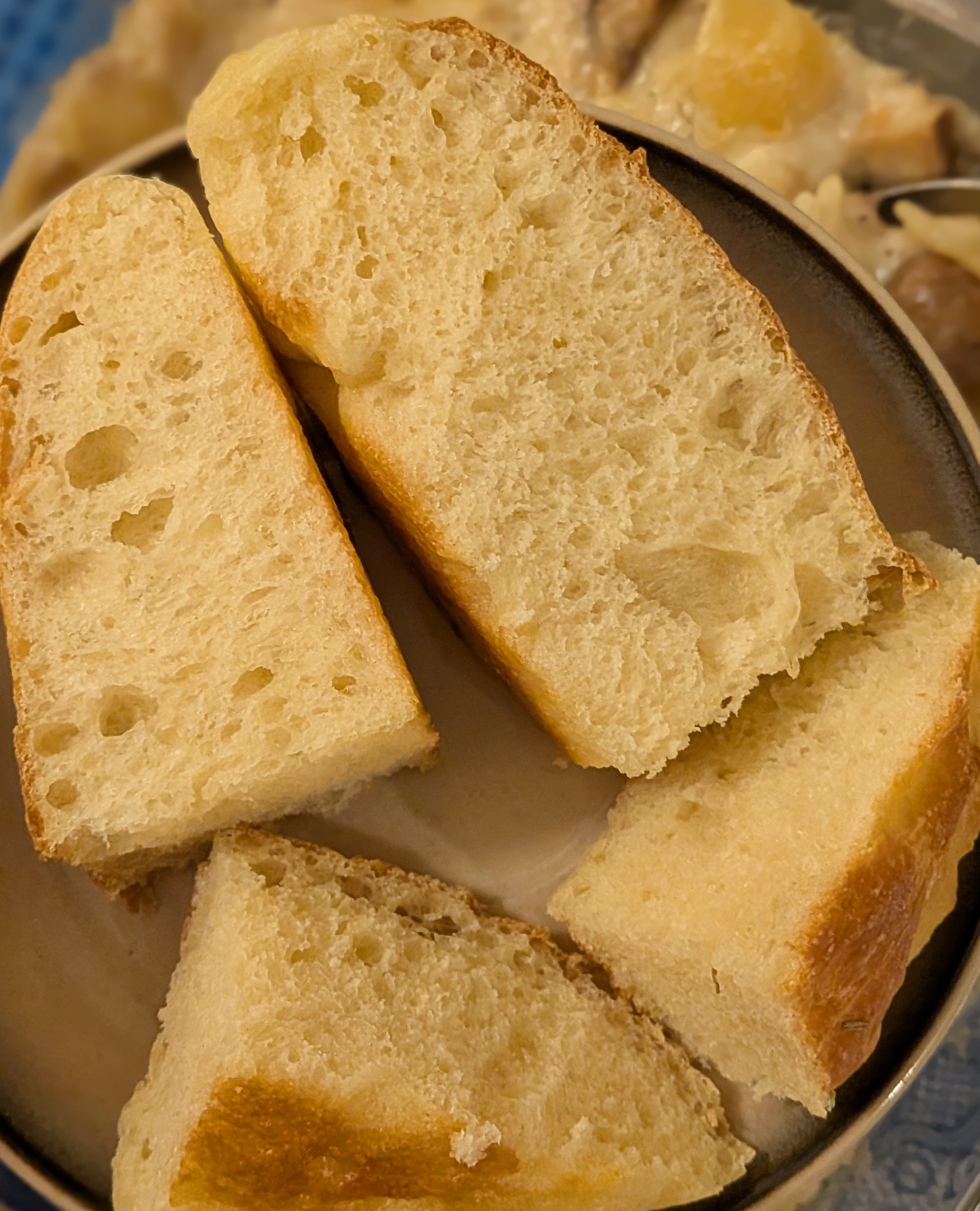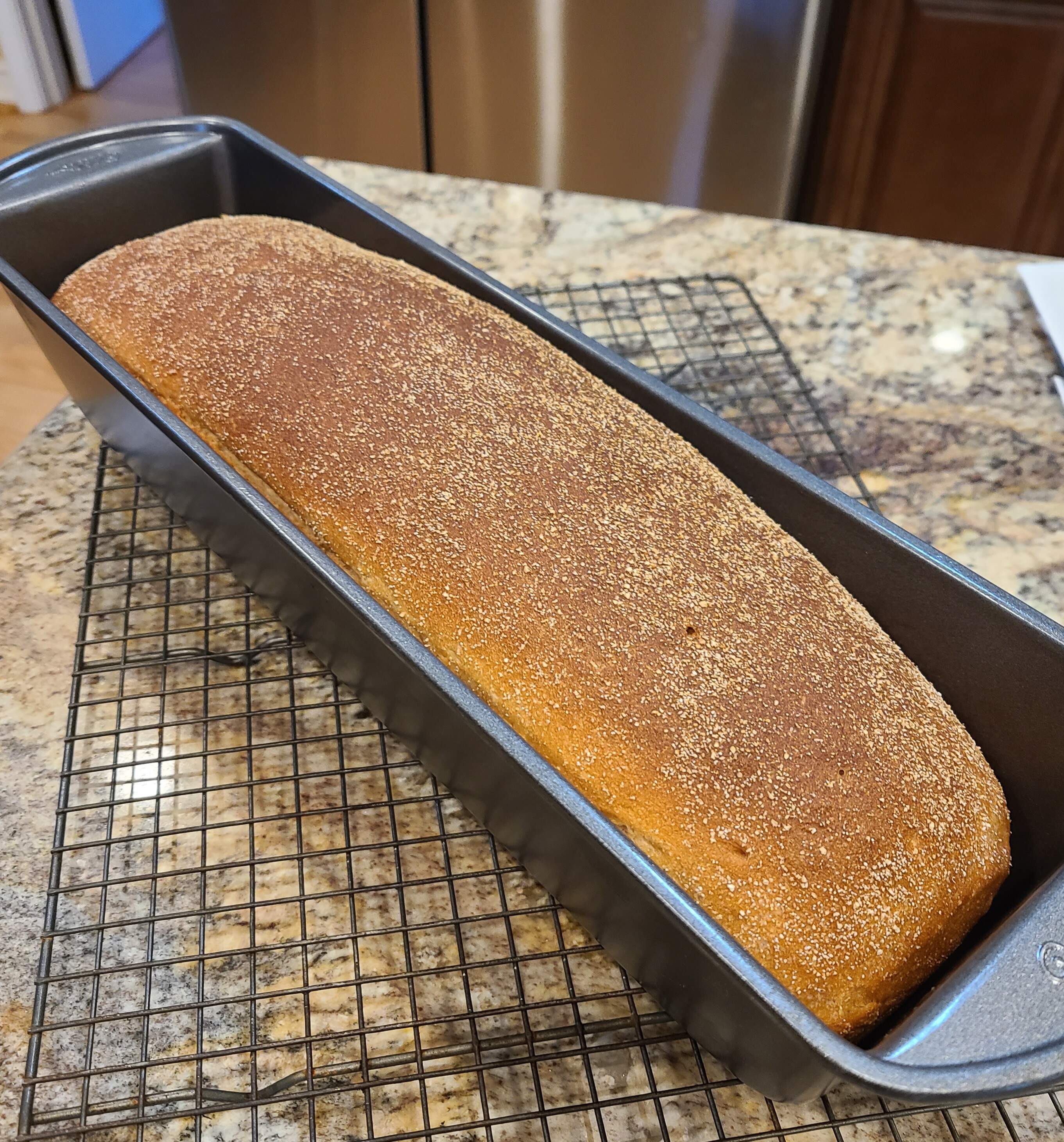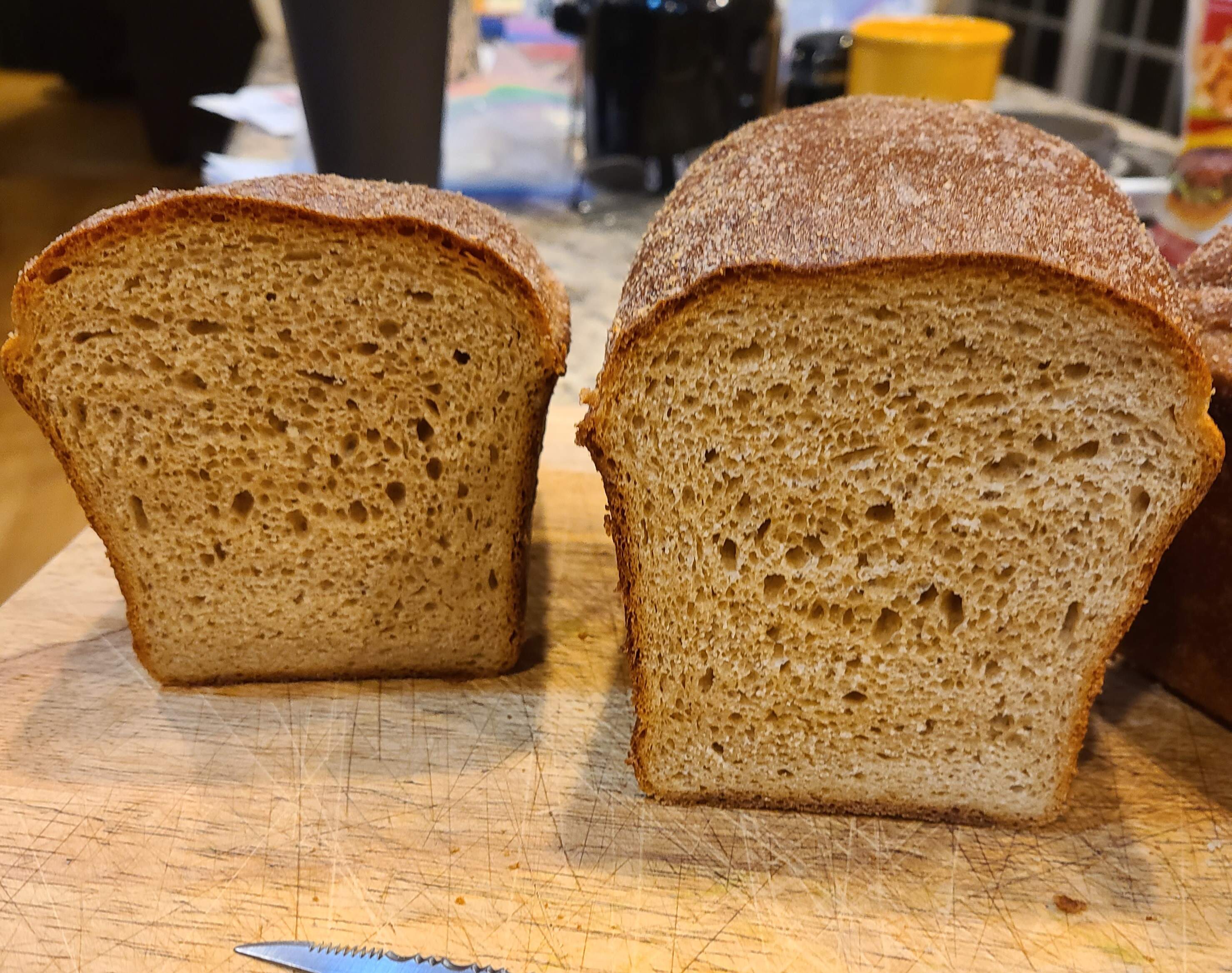 I didn’t math it right (@ChristinaM) or it just didn’t rise enough, but it was pretty decent overall and tastes fantastic. Crumb was a bit over-proofed as you can see, but not bad. I have used this recipe before in a 9 inch pan and just measured the total volumes of both pans and ratioed the recipe from there. Still, it looks like I could have used at least 10-15% more of the ingredients based on pan fill. But still good - I’ll count it as a win.