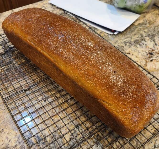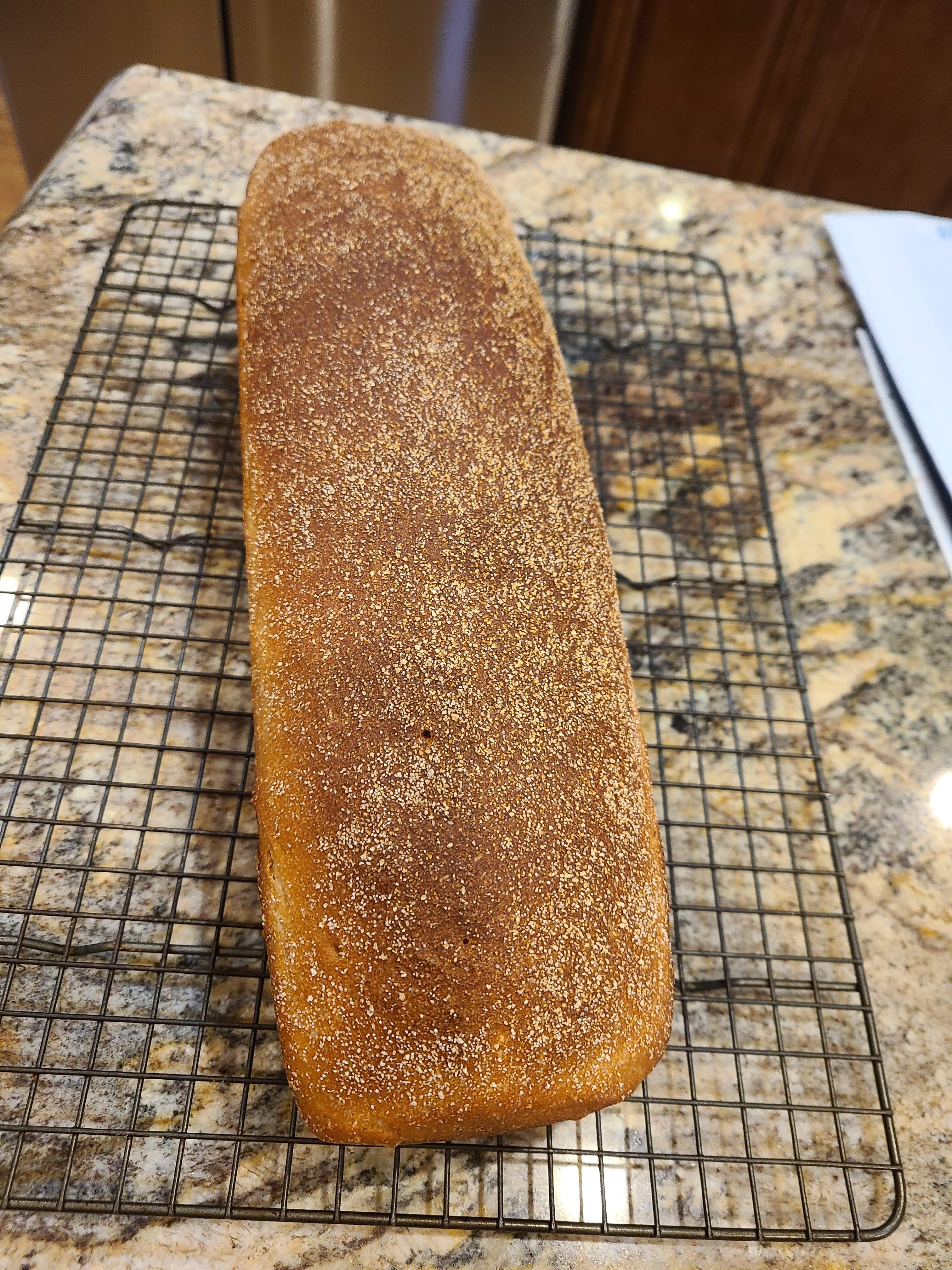 Another attempt at filling this 16 inch pan (sharing half the loaf with my daughter’s family). This was a honey wheat, whole wheat freshly milled except I sieved out a fair bit of the bran, then rolled the wet loaf in the extra bran as headed into the final rise.
