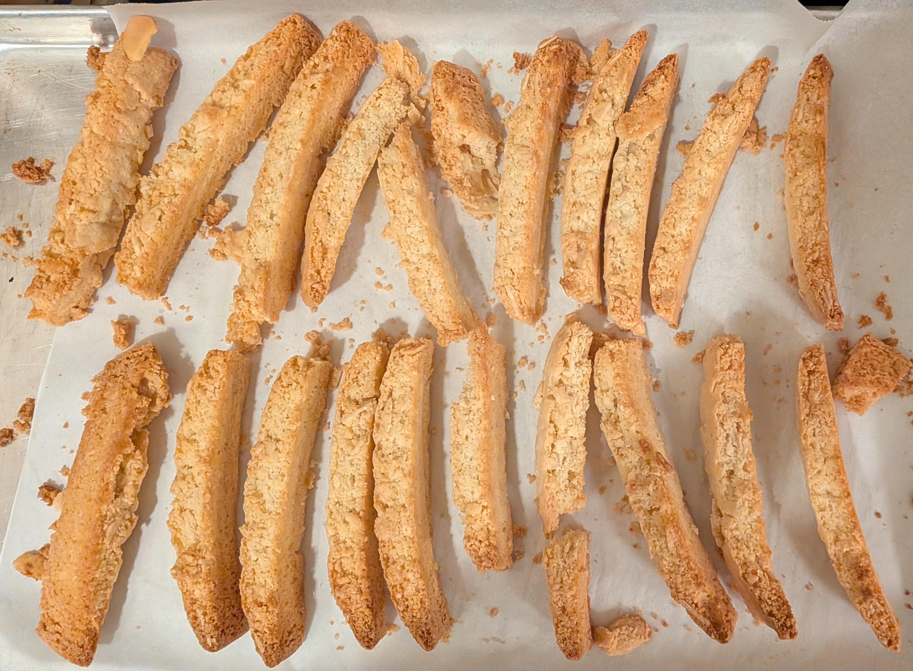 I used some pastry flour that already had some baking powder added, so my measurements were a little off. I will make the recipe again, to see if I can get my next batch to look more like his cantuccini.