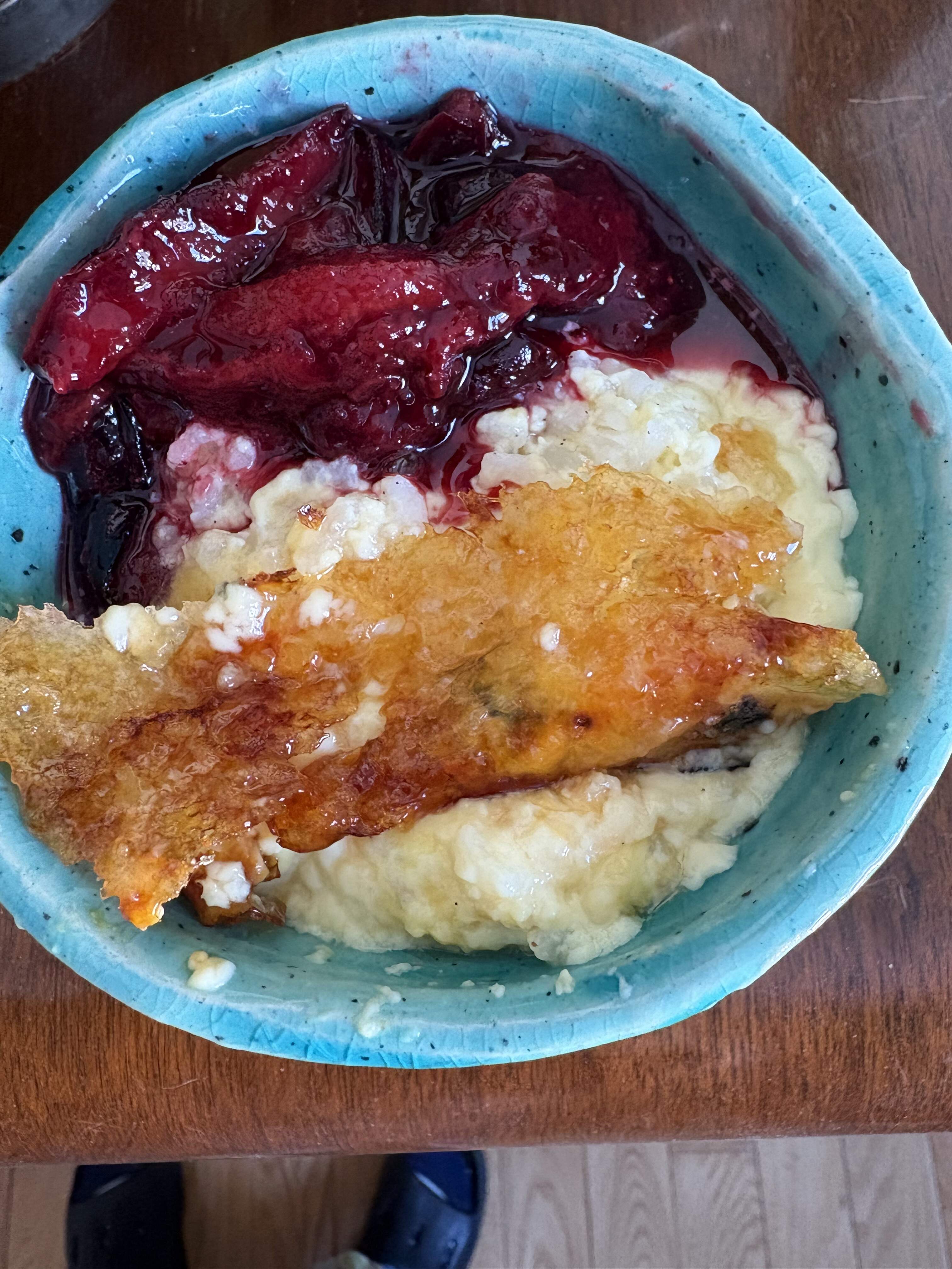Rice pudding with plums and cardamom from Baking and the Meaning of Life. This recipe has 3 of my favourite things in the title so I knew it would be my first bake. The rice pudding uses precooked rice and is custard based. It uses the stovetop to heat the milk and cream with the spices and to cook the rice, and the oven to bake the plums and the pudding once the egg yolks are added (in a water bath). A brûlée top is the final touch. So, lots of dishes. I liked all the components of this, but I won’t make it again. I prefer rice cooked in milk with no eggs for my pudding. This was very rich with 4 yolks and whipping cream. The plums were delicious, of course, but I don’t want to eat them with my rice pudding. My one takeaway is to use my torch more often to brûlée the top of rice pudding.