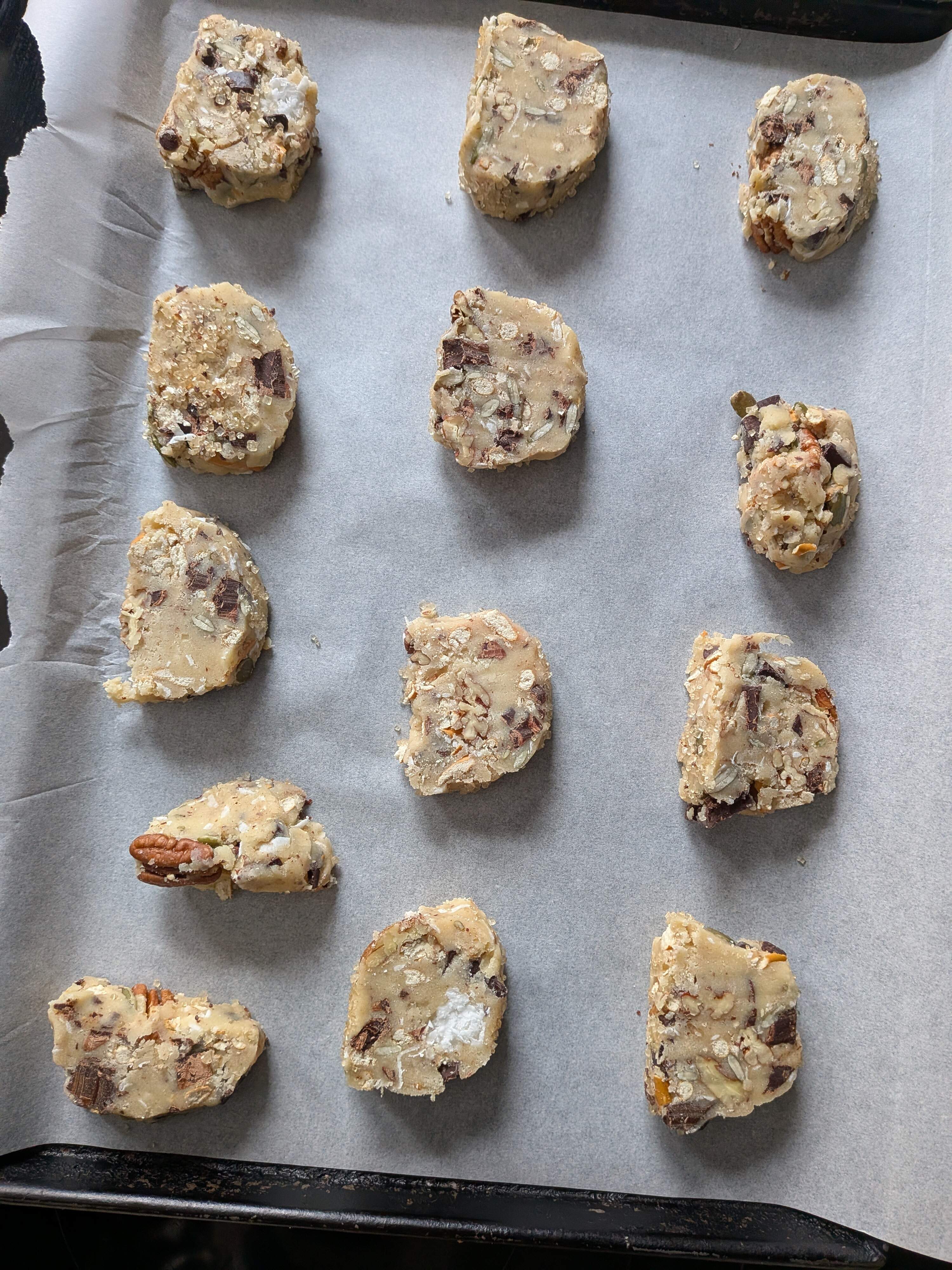 I looked the recipe up, and see she instructs to cut a half inch of dough from the end of the logs before slicing the cookies “and discard it.” Pfft. Who does that? I always just flatten it out a bit and bake it, figuring the misshapen ones are a cook’s treat. That is, if I haven’t just snacked on the dough itself…