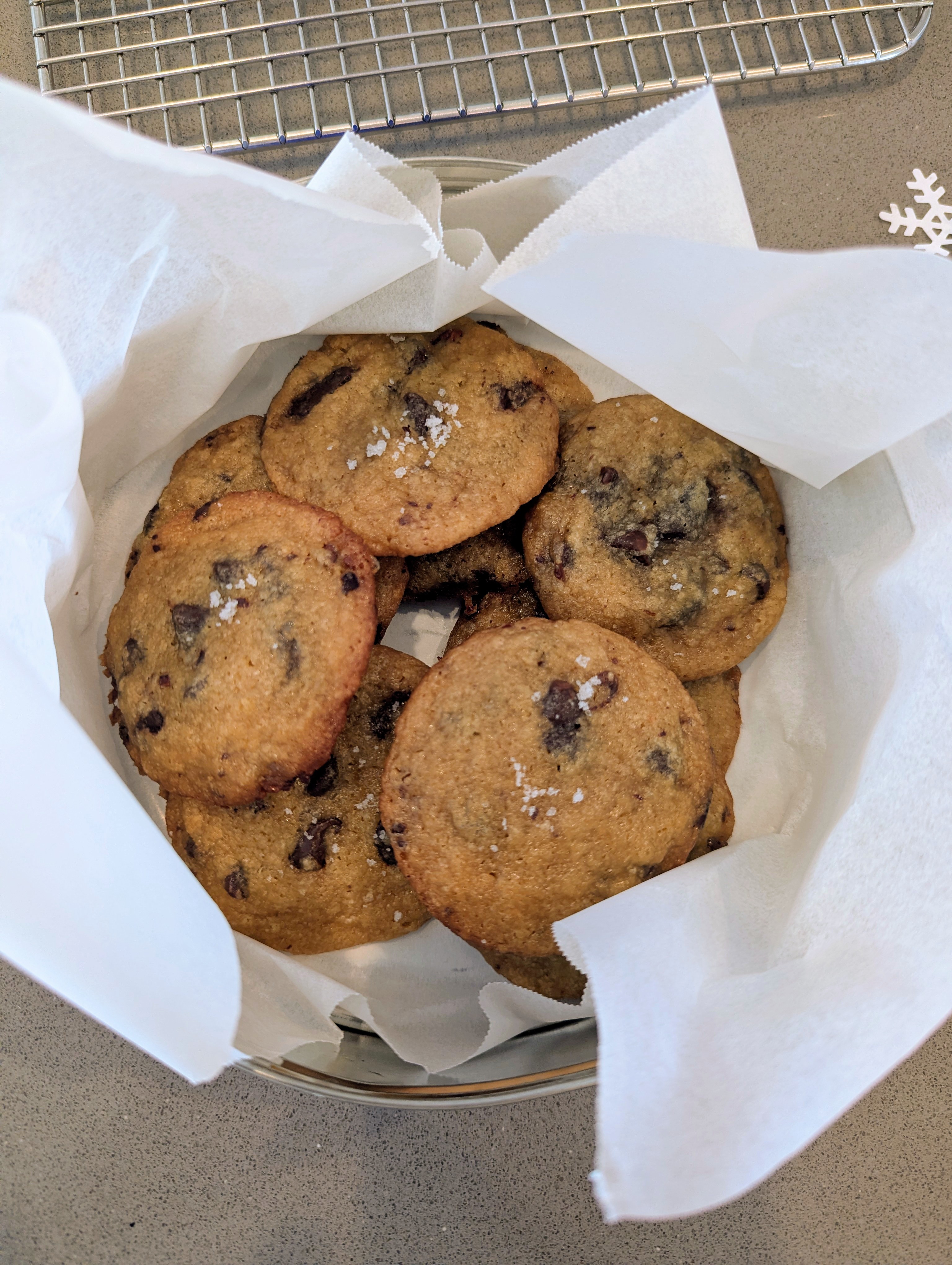 Chocolate chip cookies with flaky sea salt. No idea which recipe, as I excavated the dough from my freezer. I remember thinking these were kind of overly sweet with a lot of brown sugar. They are coming with us to a dinner party where they will be dipped in chocolate fondue.