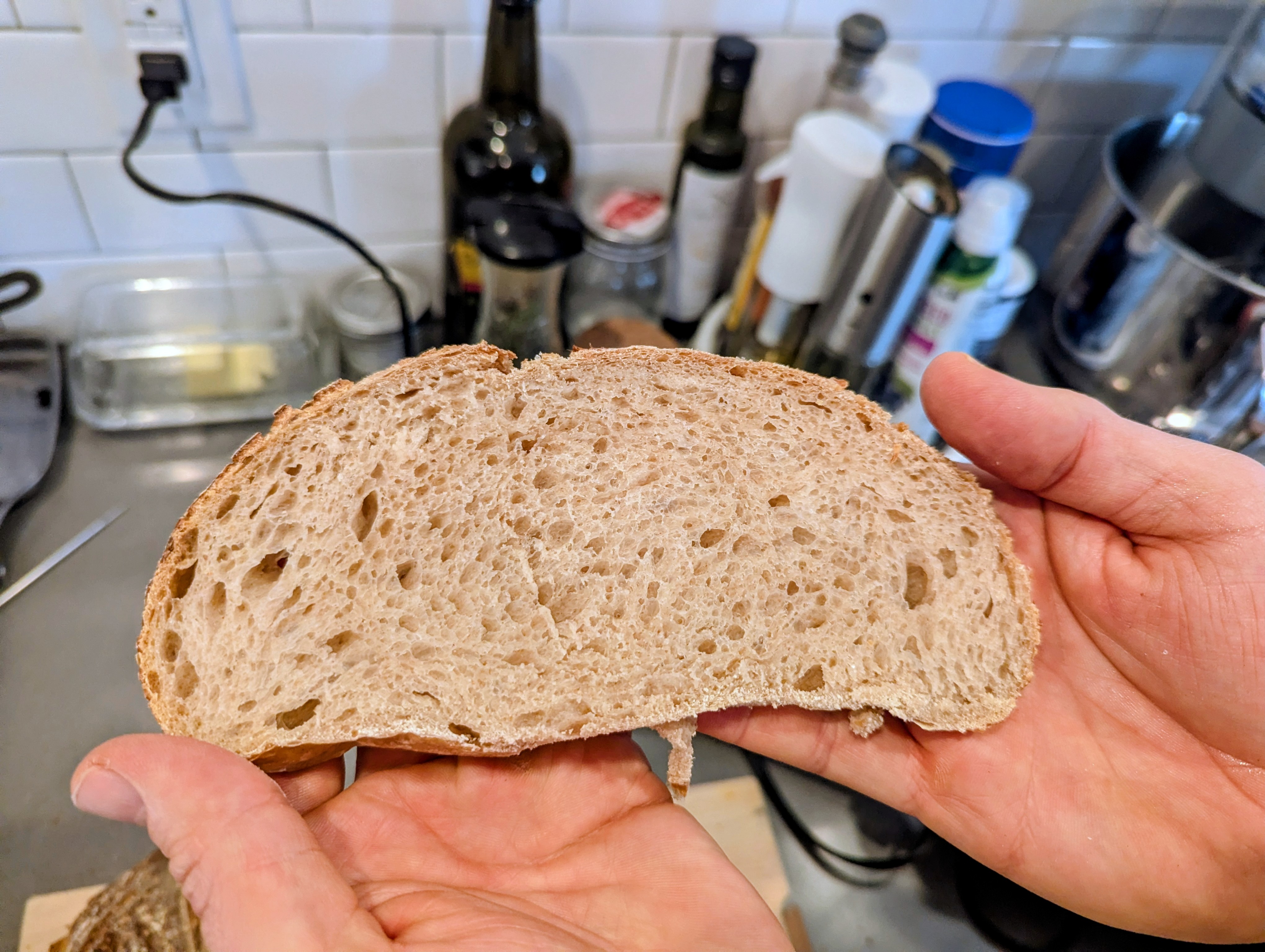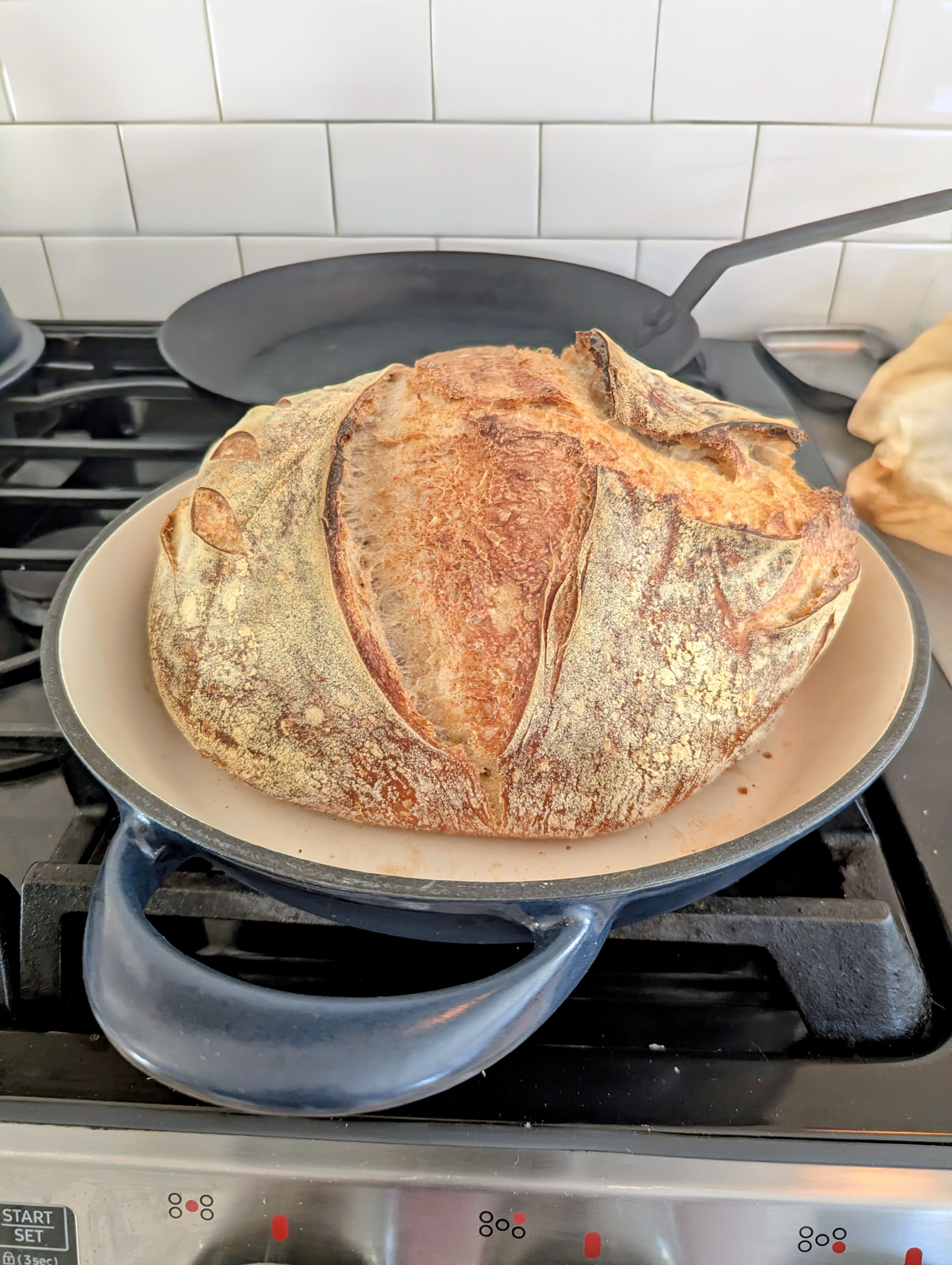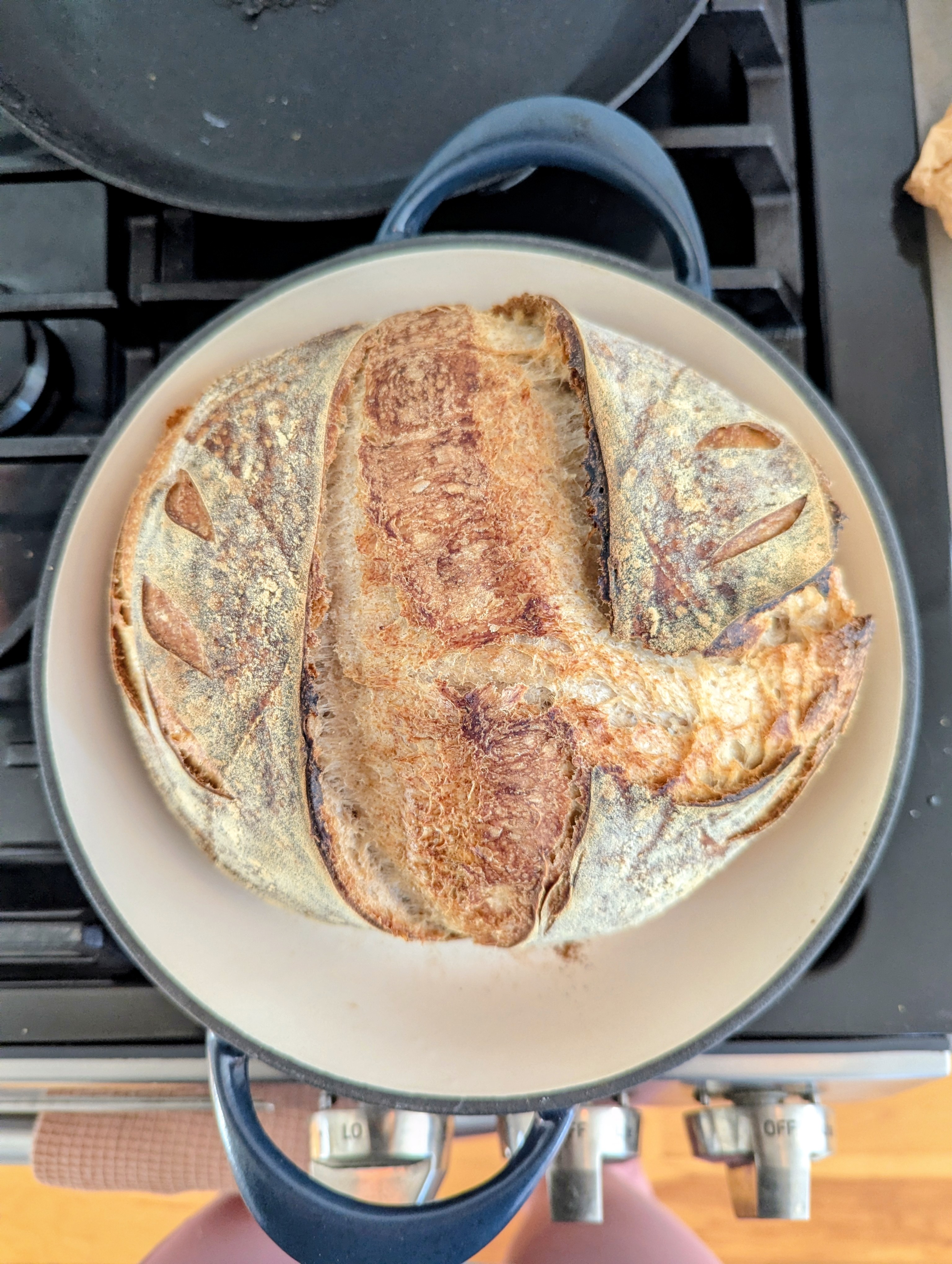 My next loaf of sourdough, this time with 21% whole wheat. Really nice soft texture. Too bad I mauled it removing the baker lid for the “lid off” portion of the bake. ![]()