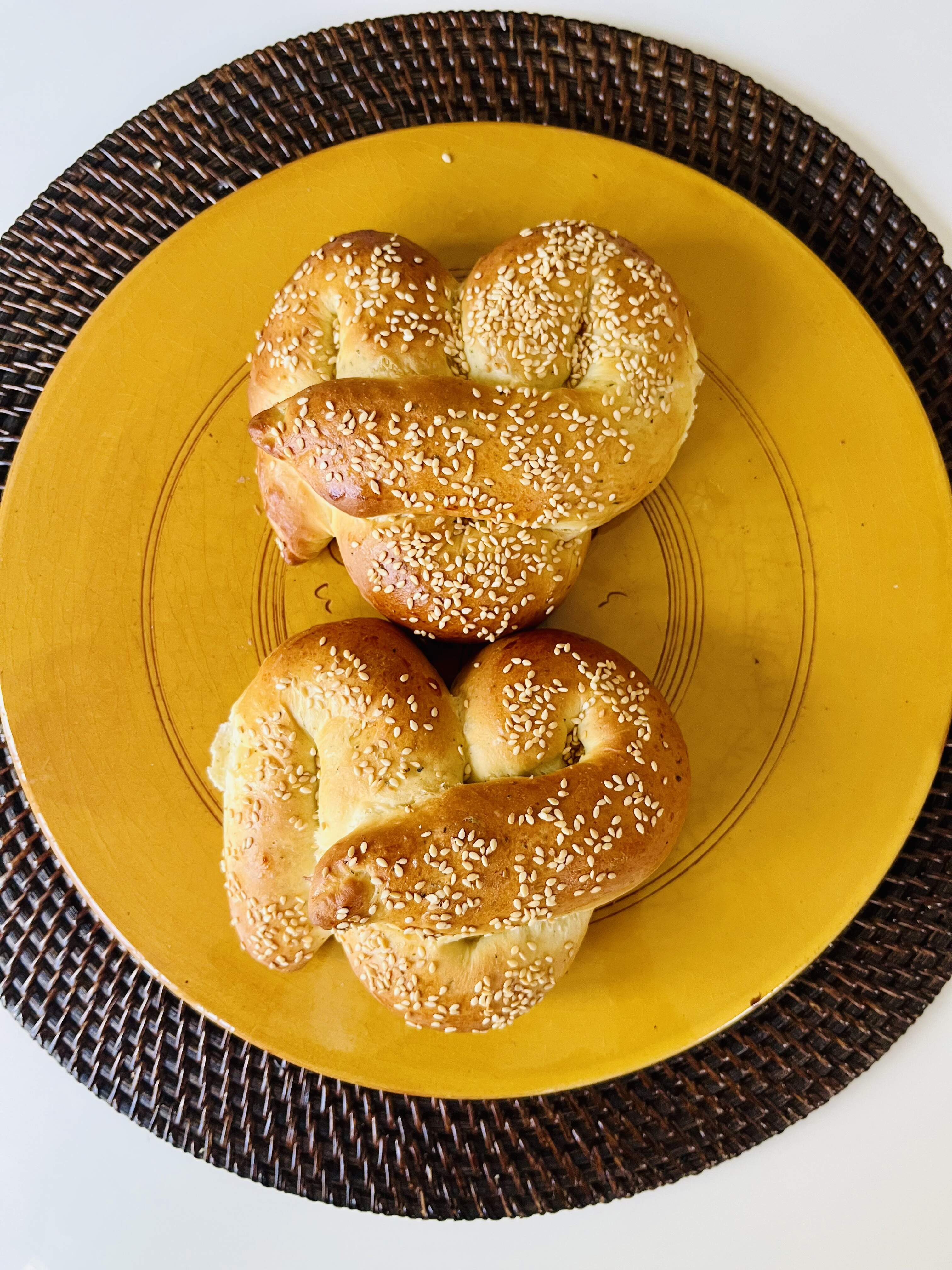 I put about 3/4 c bread flour in the FP, fresh rosemary, added salt, a little sugar, generously heaped tablespoon of discard, scant teaspoon yeast, egg yolk, maybe a T of evoo, some warm milk. Pulsed and then ran for a few seconds, it needed a little more flour at this point. Added a little flour and a bit of softened butter. Ran processor maybe 30 seconds, let it rest to cool down a bit and then ran it for maybe 20 seconds. Removed, hand kneaded just a bit, divided in half and let rest 15/20 minutes. Rolled each to a long rectangle…longer than my silpat, rolled into a rope and shaped. Let rise until very puffy, brushed twice with some reserved egg white mixed with a little milk, sprinkled with sesame seeds. Baked convection bake around 350* ish. 6 minutes, reversed, 5-6 more minutes. Interior temp 195-200*.