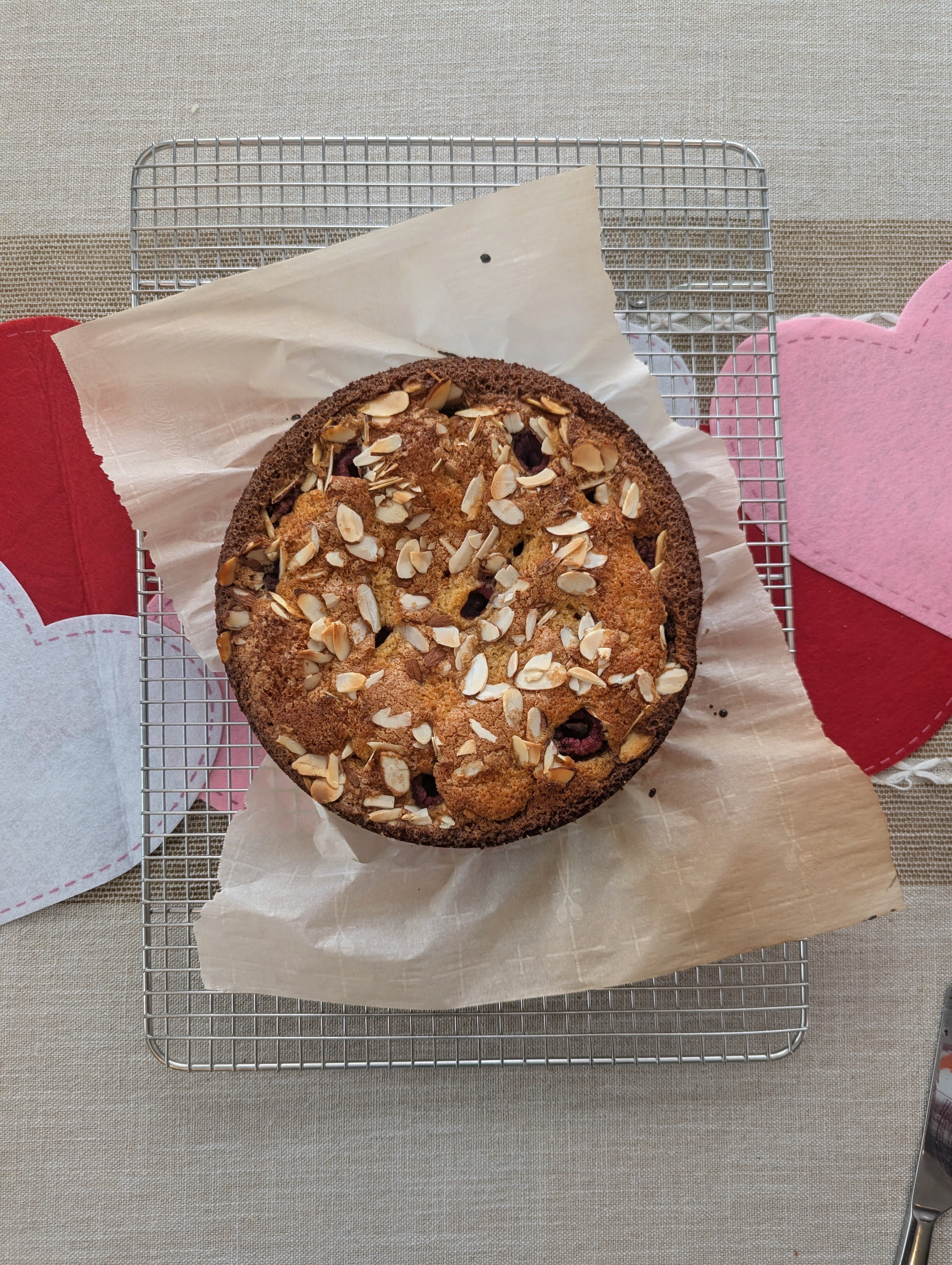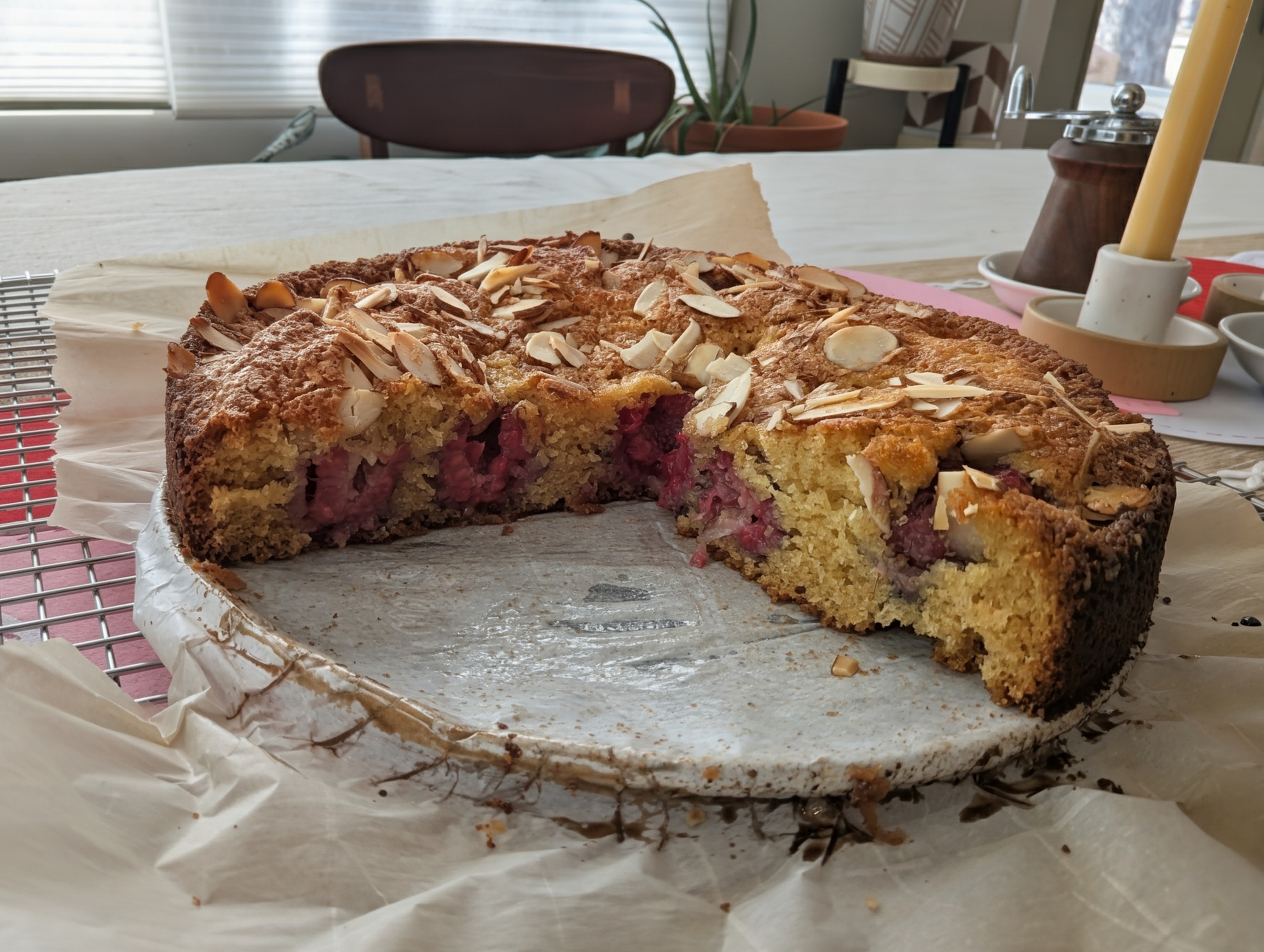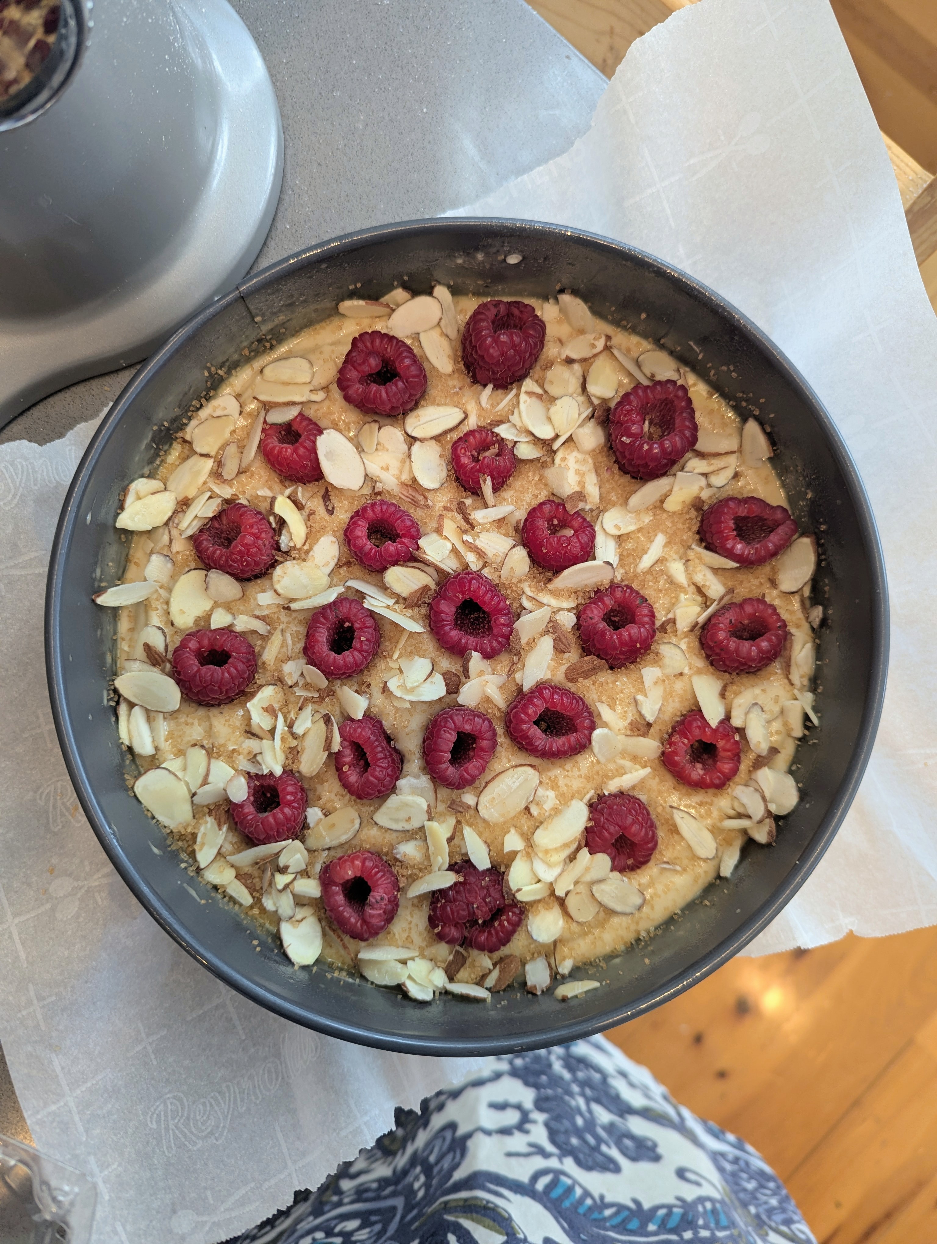 I made the raspberry buttermilk cake from Smitten Kitchen omitting the lemon zest and adding sliced almonds and a drop of almond extract. Dusted the top with Demerera and subbed ww pastry flour for half the AP.