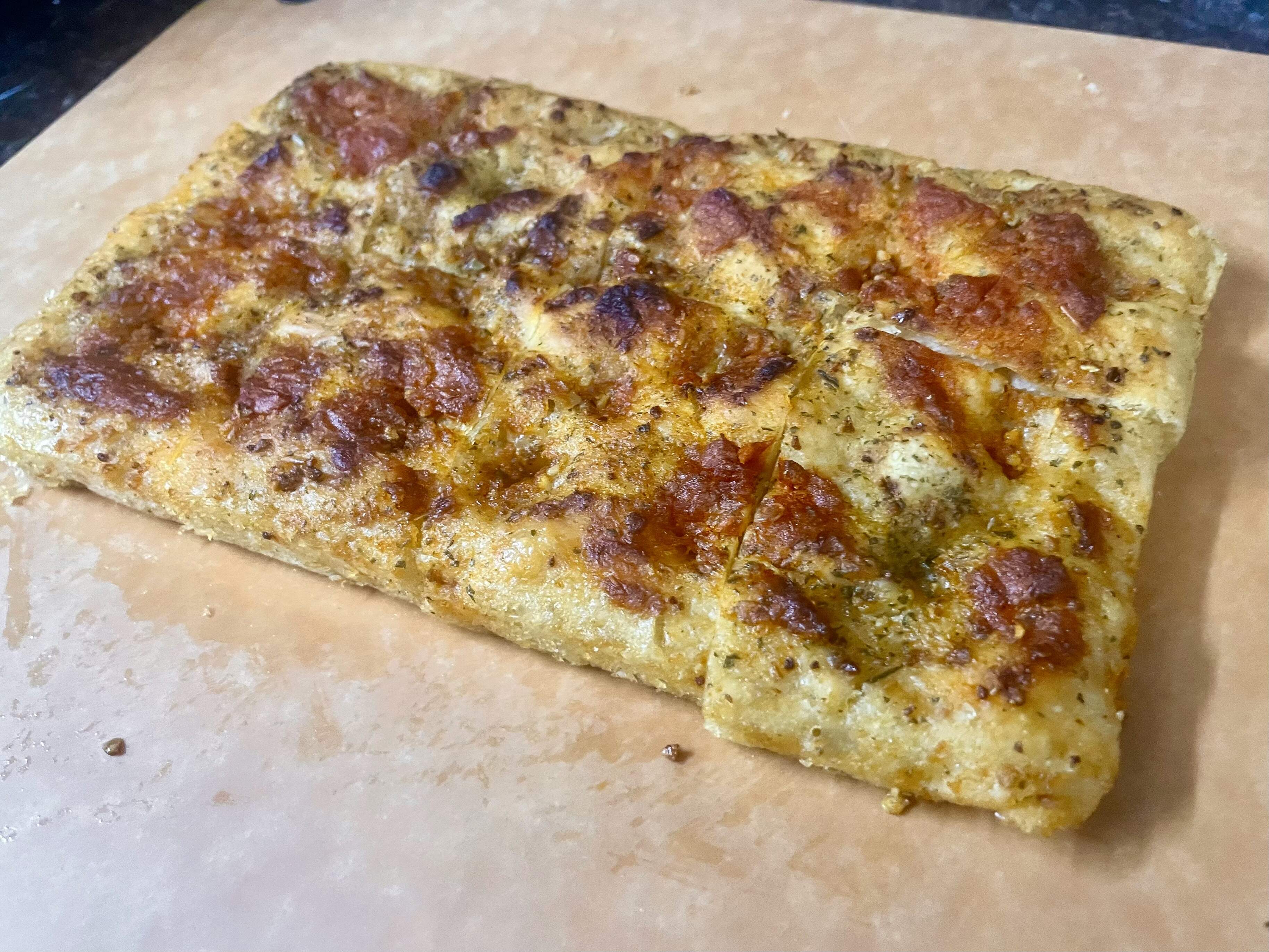 I used Bittman’s stovetop method to par-cook the pizza crusts, and finished the pizza in the countertop oven. Focaccia has been frozen, other 2 crusts are waiting to be topped and finished as needed.