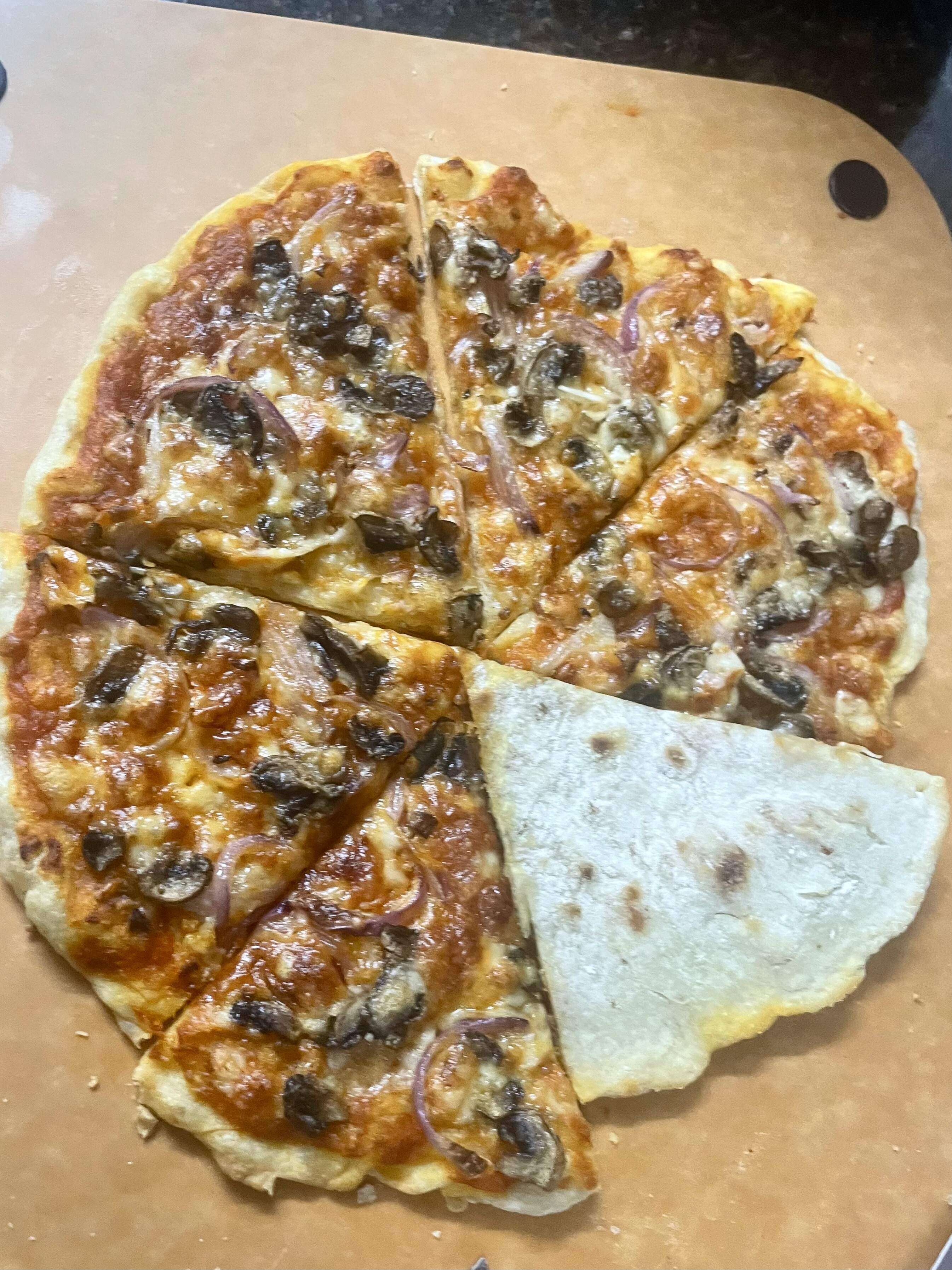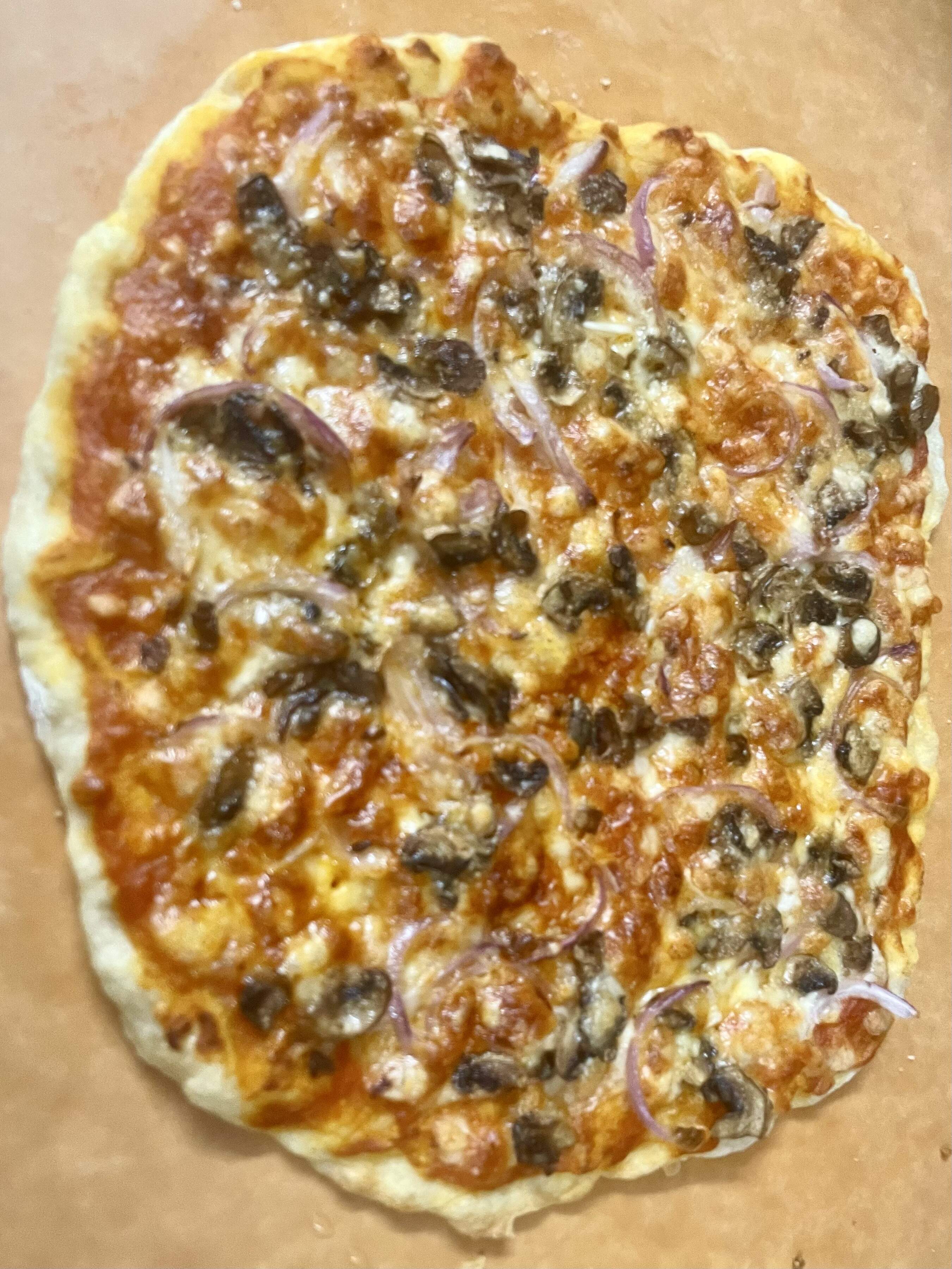 1/4 of the dough became a small focaccia with herbs and tomato, and the other 3/4 I turned into 3 pizza crusts, , one of which I topped for her dinner: a simple homemade tomato sauce, sautéed mushrooms, red onion, mix of cheese. (Must have turned out decently bec my mom who is usually good for 2-3 slices finished the whole thing .)