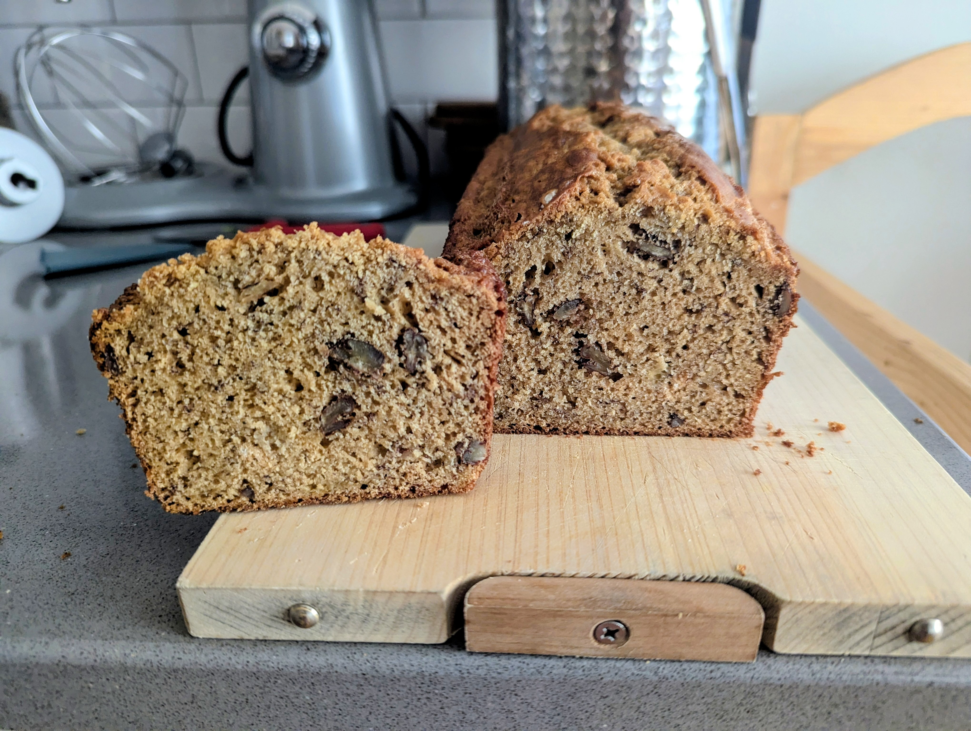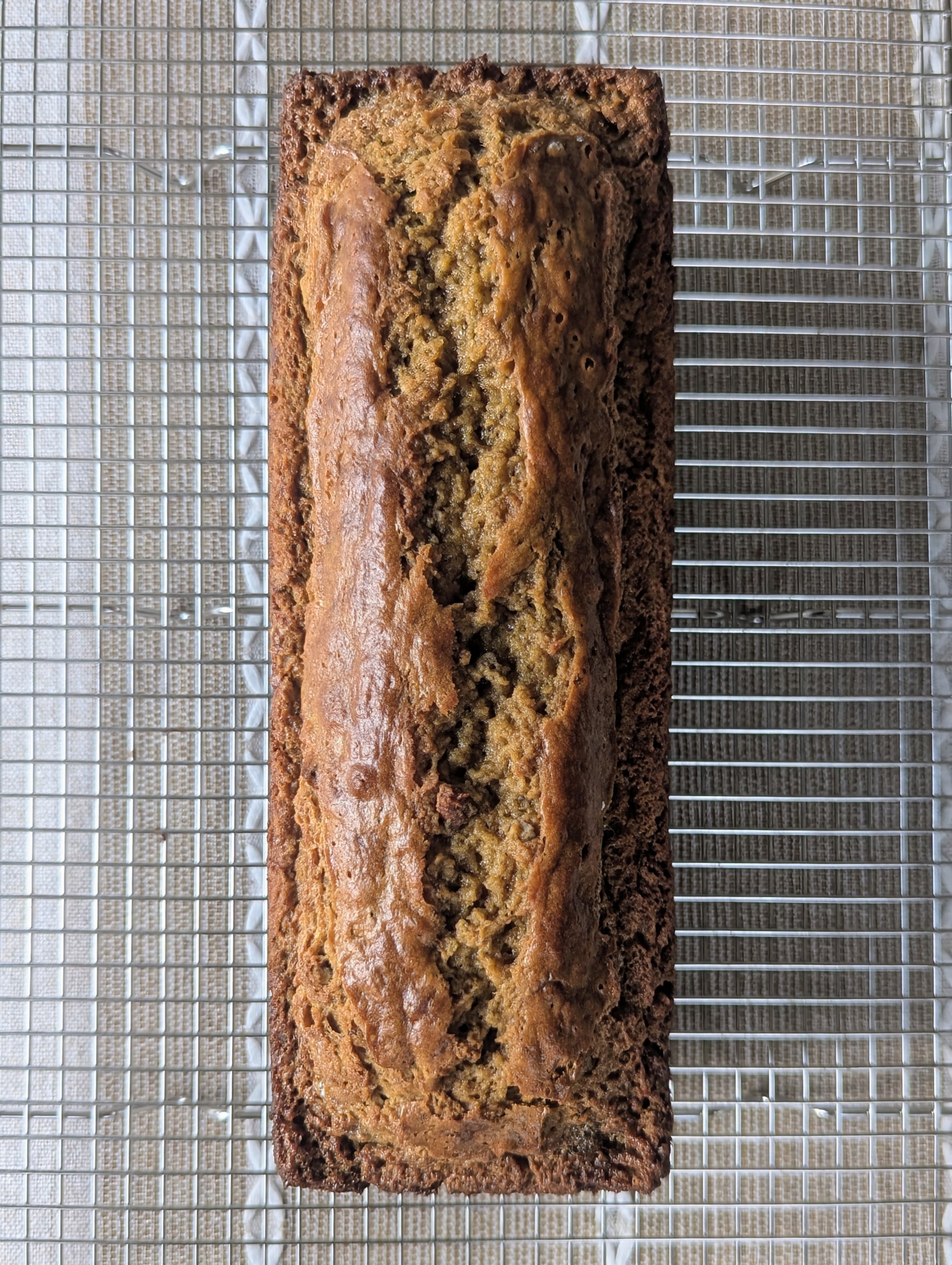 This is the banana bread from Daily Sourdough by the Farmhouse on Boone blogger, Lisa Bass. I subbed whole wheat pastry flour for part of the AP and margarine for butter and added toasted pecans. I started it at 400° before dropping it down to her 350° to get more height. (Hers looked quite flat.) The end piece I tried was fine if a little dry. The kiddo seemed to like it and it uses 1/2 c discard so I’ll reserve judgement until it rests overnight.