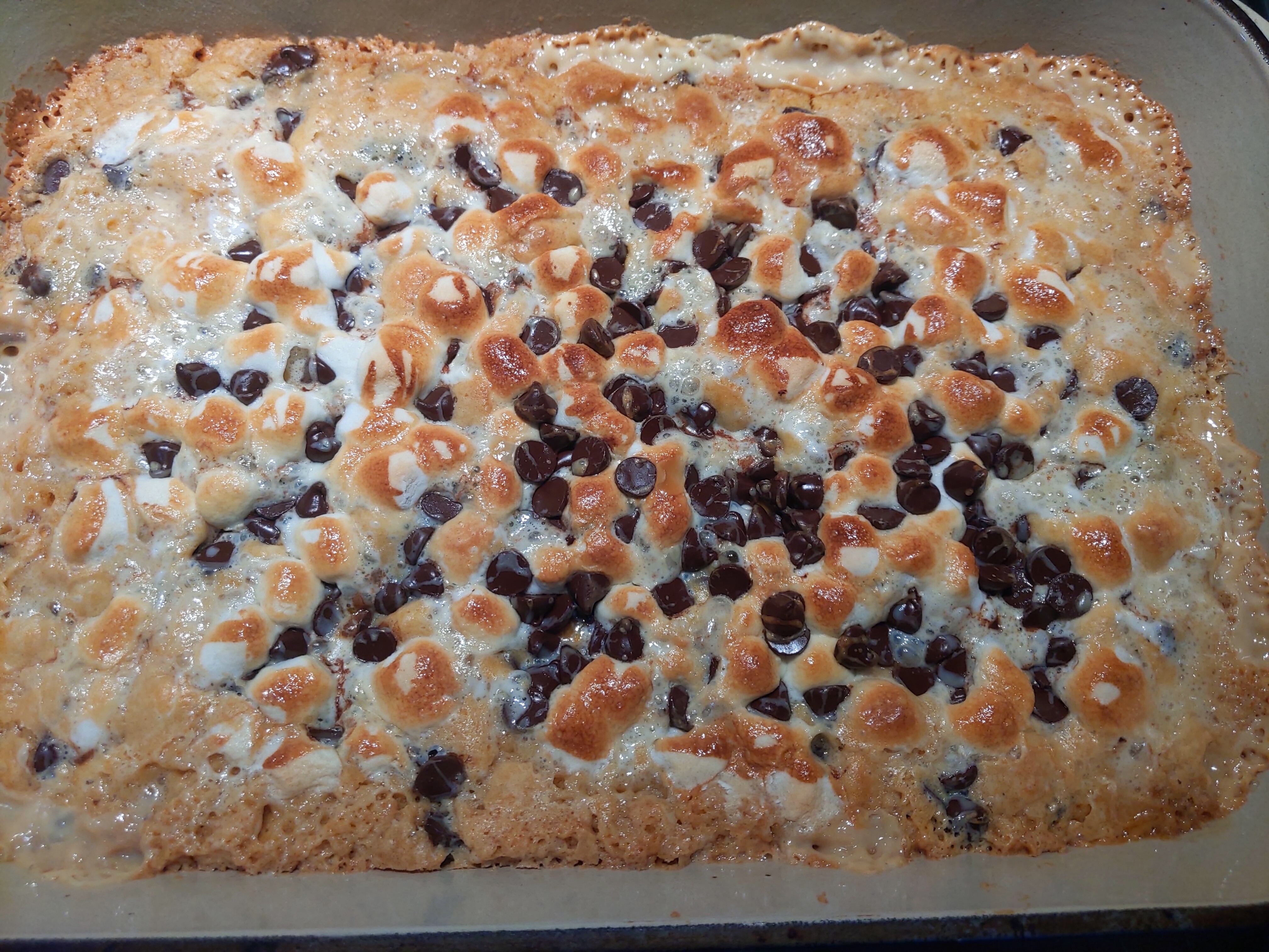Recipe link is below, but it’s butter, butterscotch chips, marshmallows, chocolate chips and sweetened condensed milk plus flour, vanilla, egg etc.. I cut back on the brown sugar, but that can only do so much.