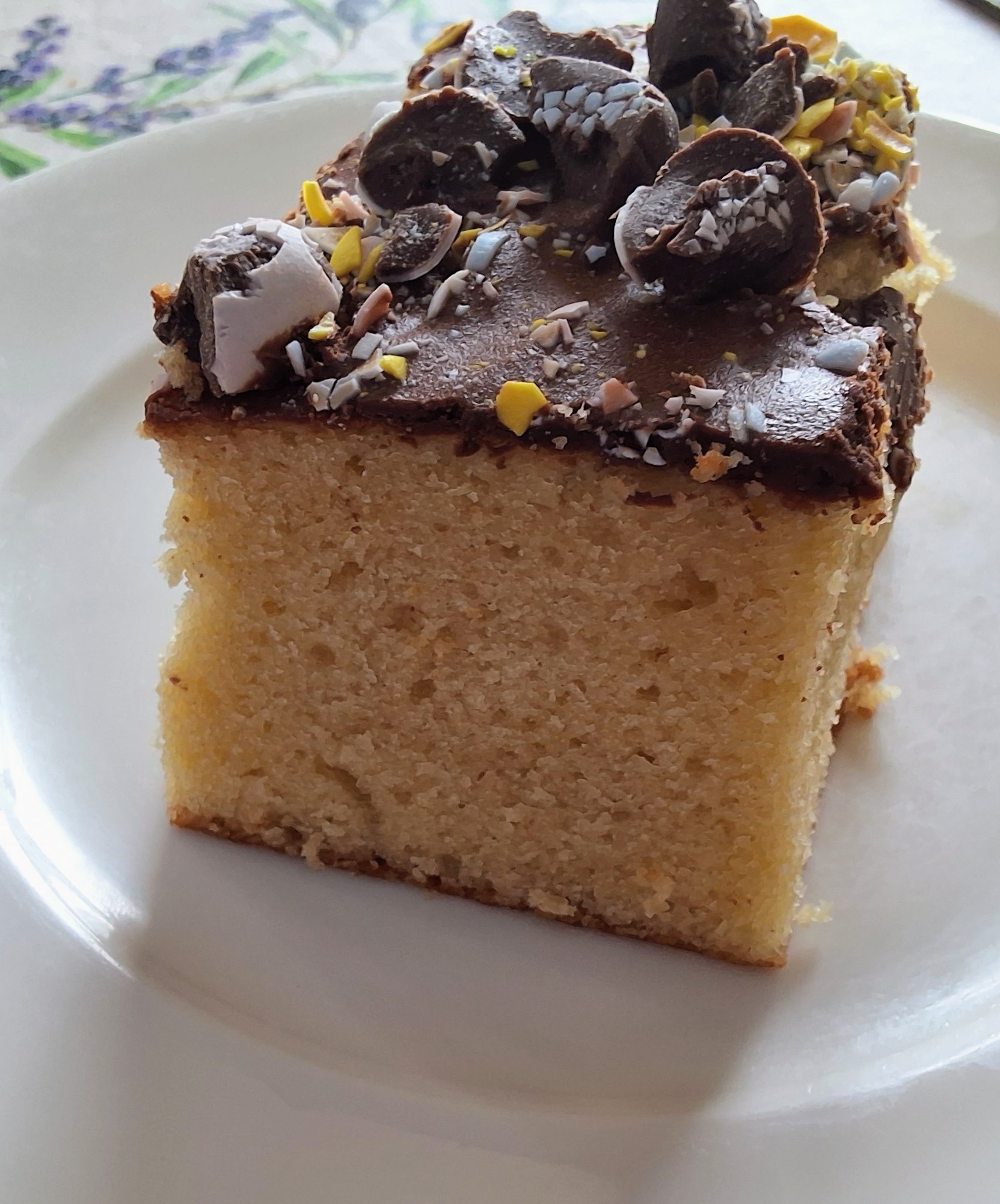 Yellow Snacking Cake and Bittersweet Chocolate Buttercream frosting from 100 Afternoon Sweets. I sprinkled some crushed mini chocolate easter eggs on top. A nice moist cake which contains buttermilk and sour cream. I reduced the sugar by 40grms. Baked in a 9x9 and cut into 12 portions. Made 1/2 recipe for buttercream.