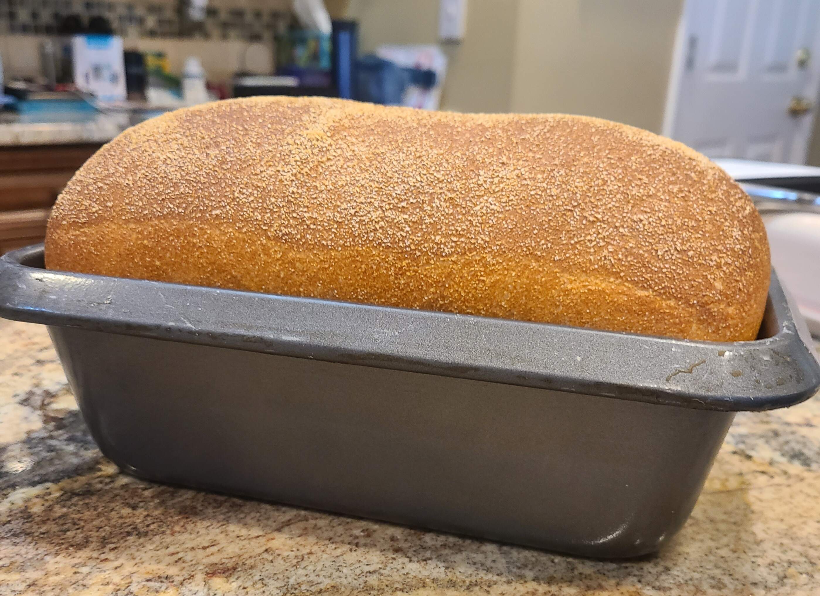 Since I’ve started milling the flour, this honey wheat has become our everyday bread, here and at my oldest daughter’s house. I’ve got the flour process down to where I’m retaining 97% of the grain and bran, but there’s a stubborn 3% (I’m assuming all bran) that even after a 3rd run through the mill is still large enough to be retained in the sieve. But I use that to coat the loaves while shaping, and also add it to chem-leavened stuff like banana bread or bran muffins.