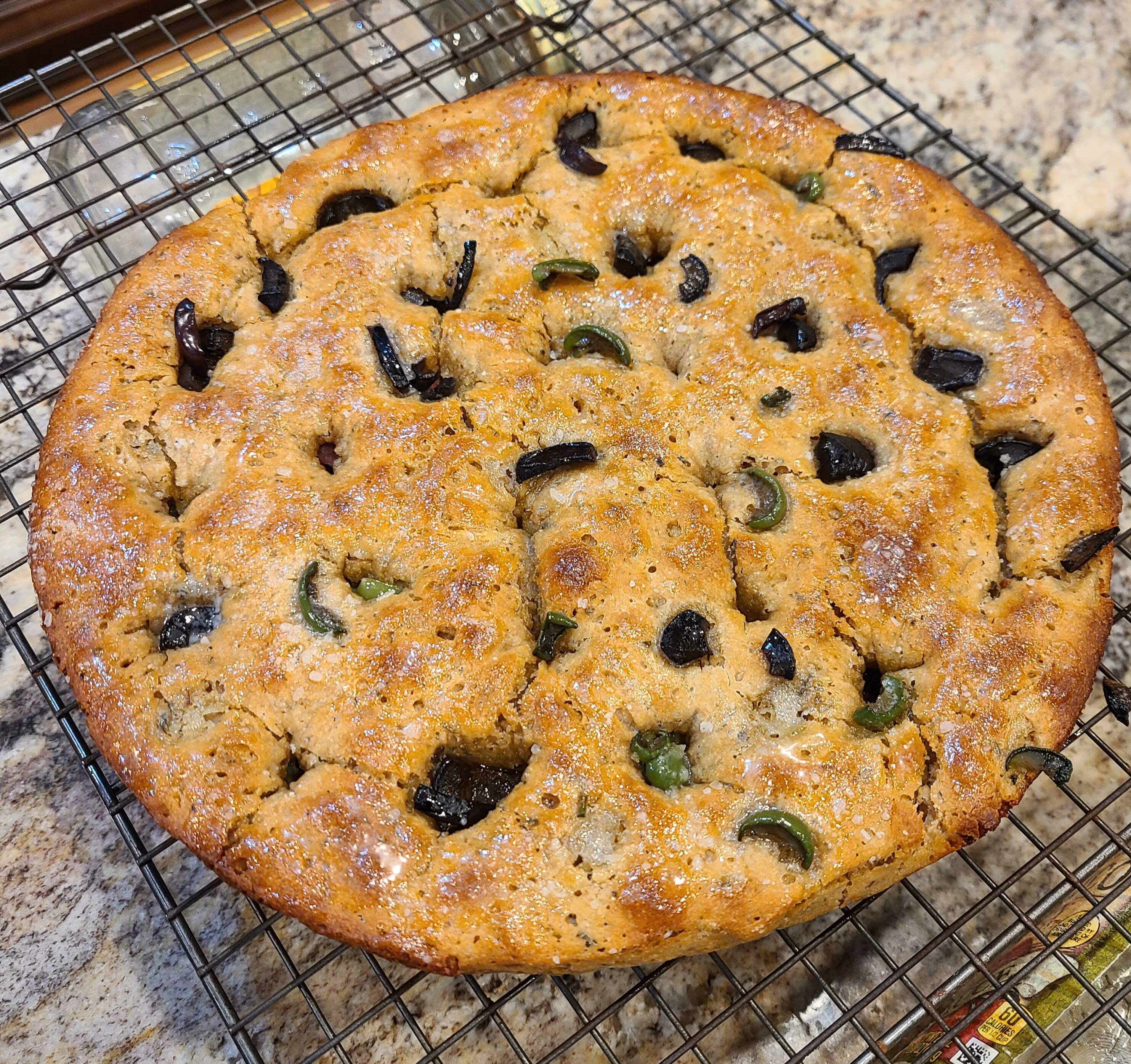 These were Saturday and Sunday. I made focaccia for the first time (first I can recall anyway). I mostly followed KA’s “Big & Bubbly” recipe as to base ingredients and amounts, cooking temp and time. But also by scrounging bits from several other recipes, I decided to add 6 cloves of roasted and pasted garlic and some dried herbs to the dough, and then poked cut halves of black, Castelvetrano and Kalamata olives into my finger holes. I don’t have a 9x9 square dark metal pan so I used a 10 inch cast iron skillet instead.