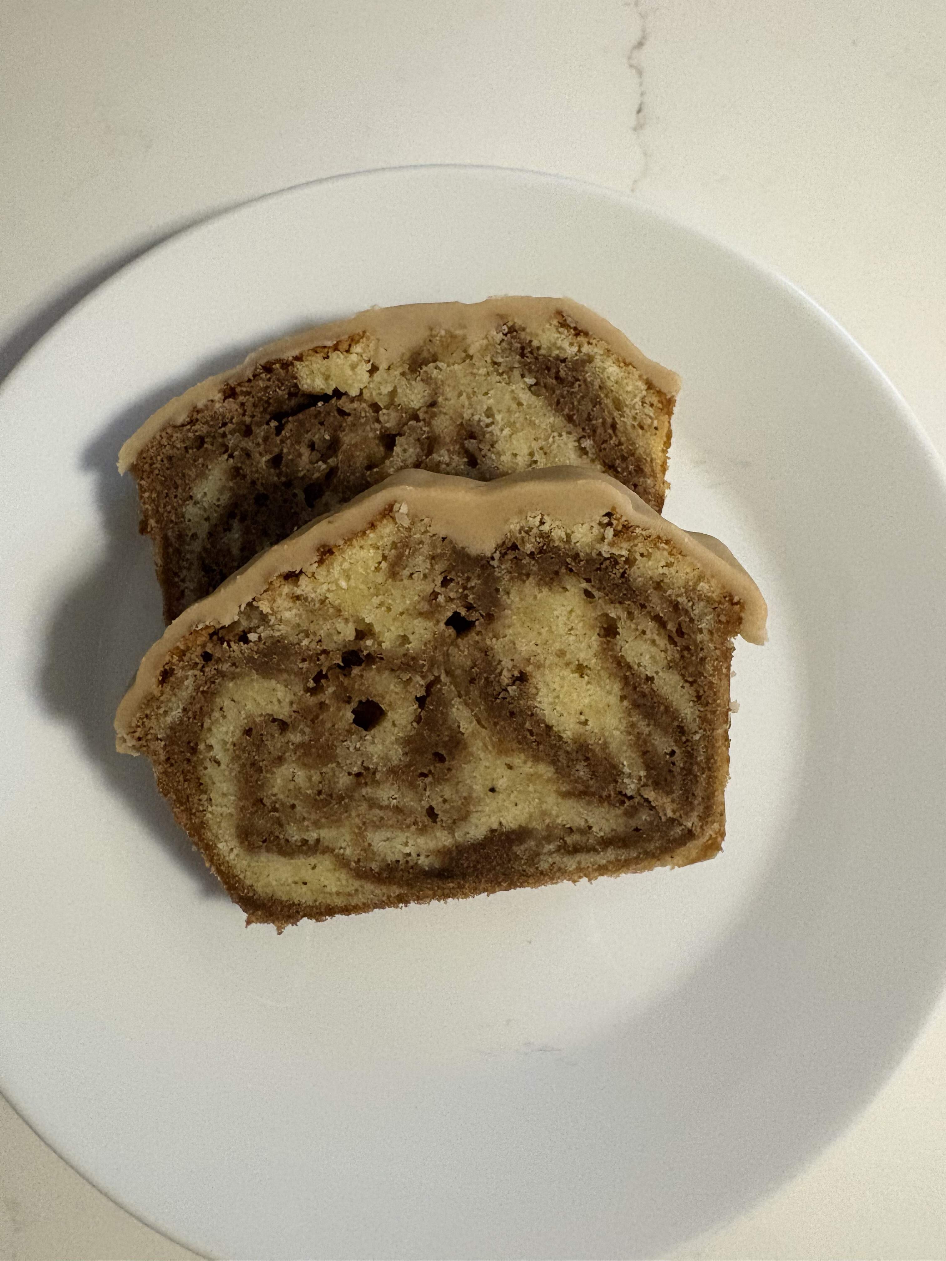 Oh that looks great! I didn’t think to tiger stripe it. Just blobs and swirled with a knife. I discovered I had very little instant espresso so used a strong brew instead of milk in the cake and glaze. My glaze was too thick but it was midnight by then so I just slopped it on and went to bed.