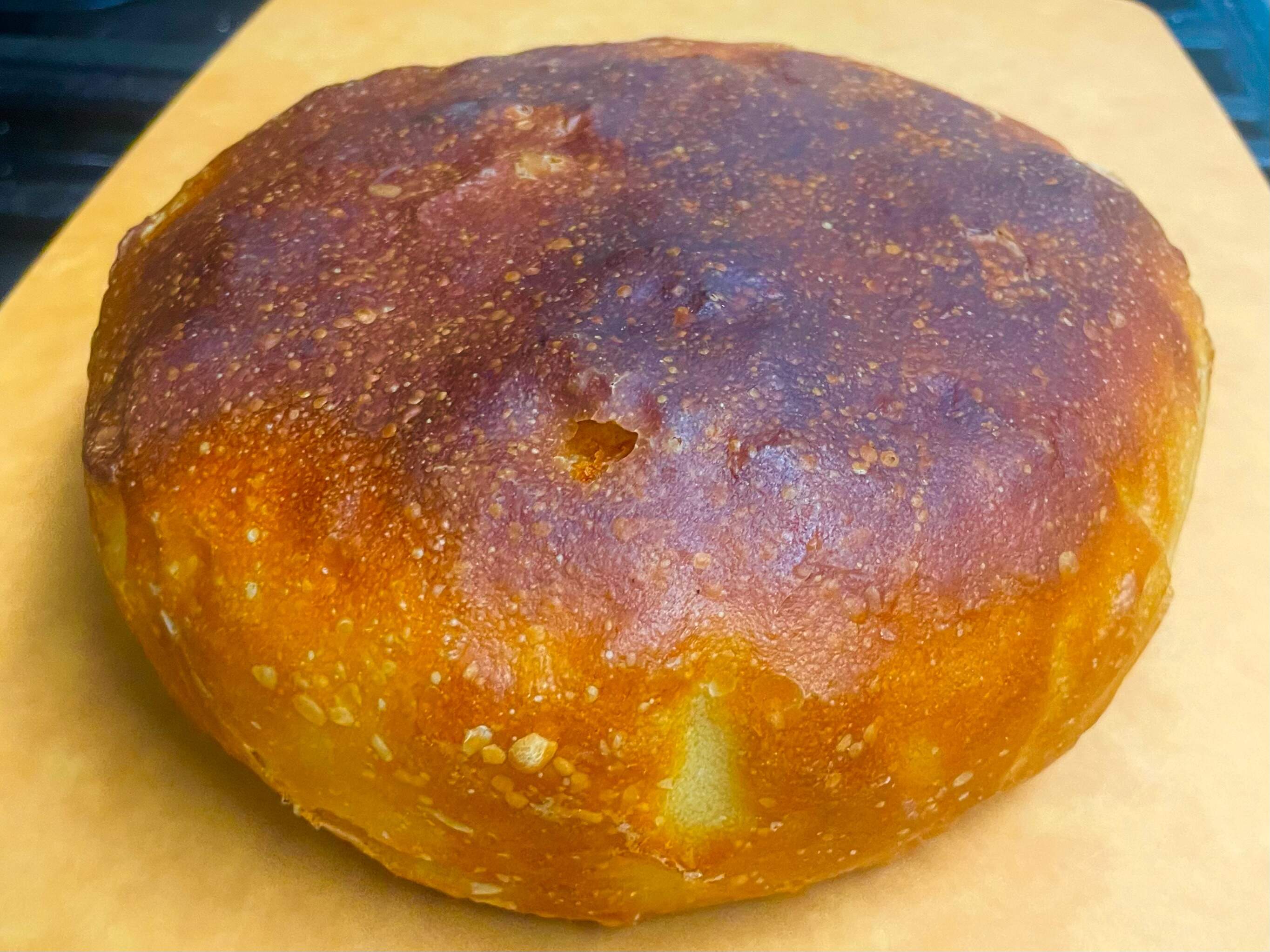 When I haven’t used my glass baker in a while, I forget things, and so I forgot that for the smaller amount of dough I use, I should do the final proof in a smaller container and not the baker, or it splats somewhat