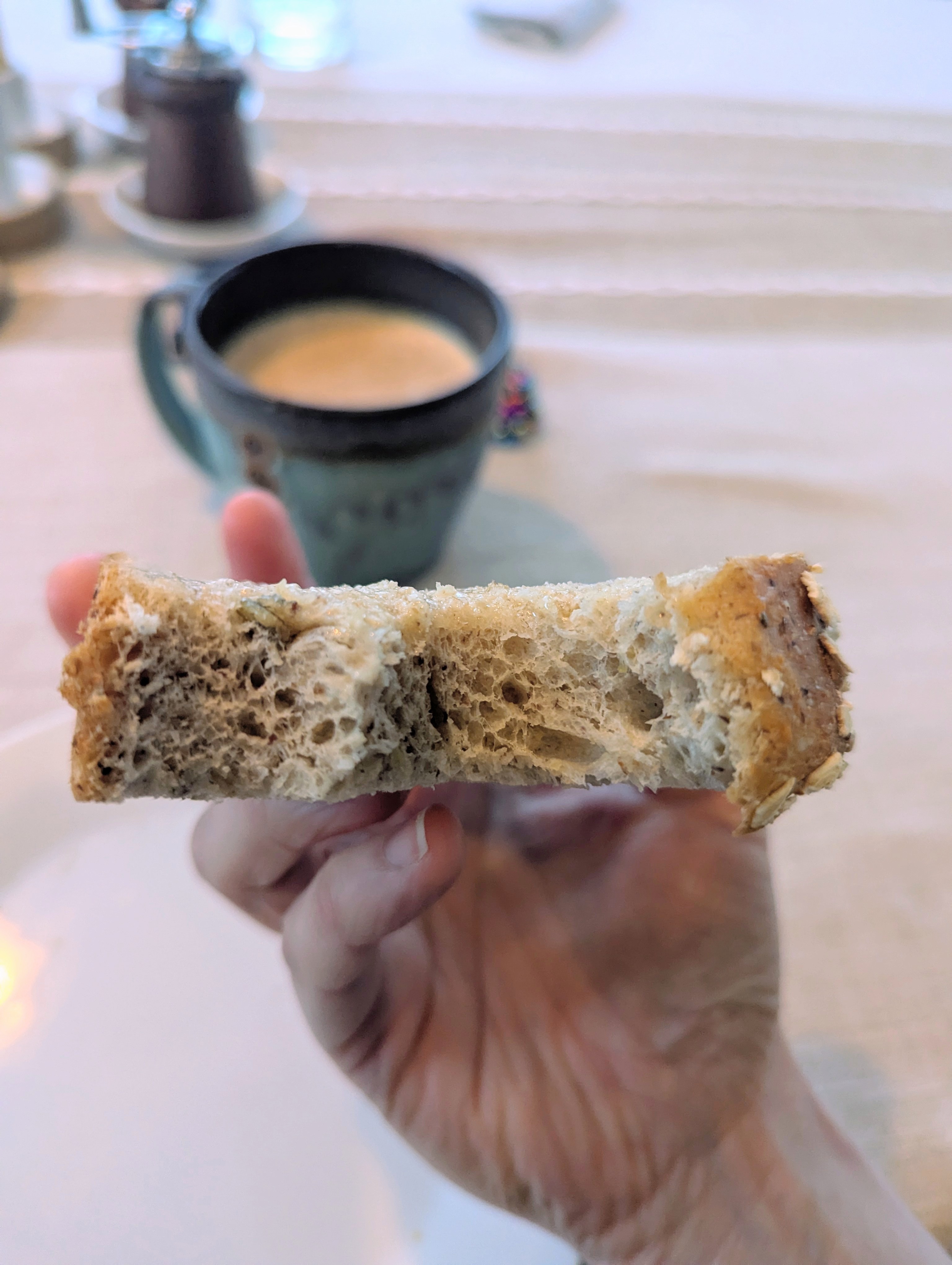 Other changes: sourdough starter for yeast, margarine for butter, pumpkin seeds for the whole flax and sunflower seeds (was out), egg white for whole egg, 2% milk for whole, and TJ’s organic rolled oats with ancient grains and seeds for the regular oats.