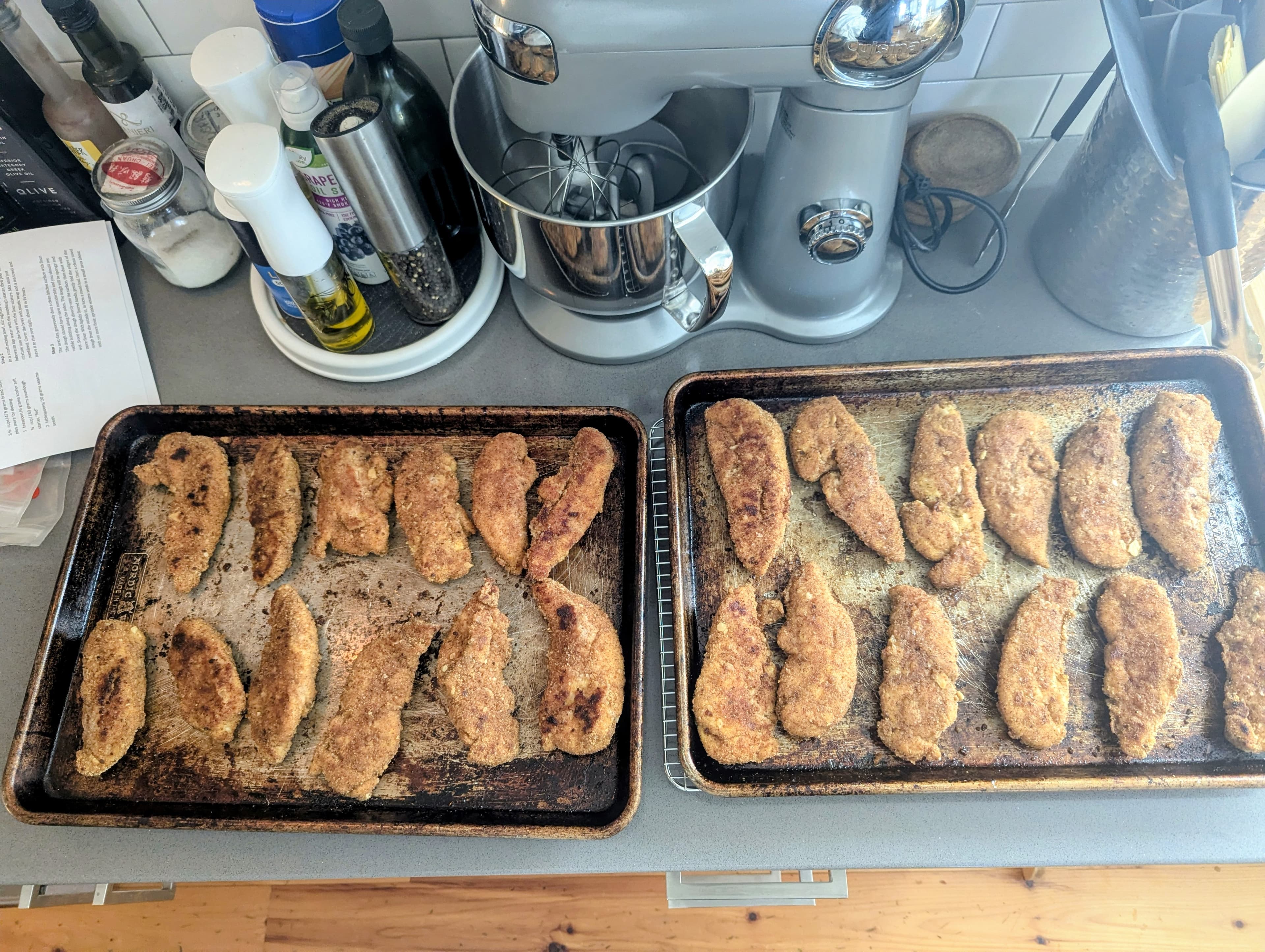 Today I baked up 5 lb of homemade chicken tenders. Did the math and they are slightly more economical than buying pre-made frozen, and hopefully a lot healthier/ tastier.