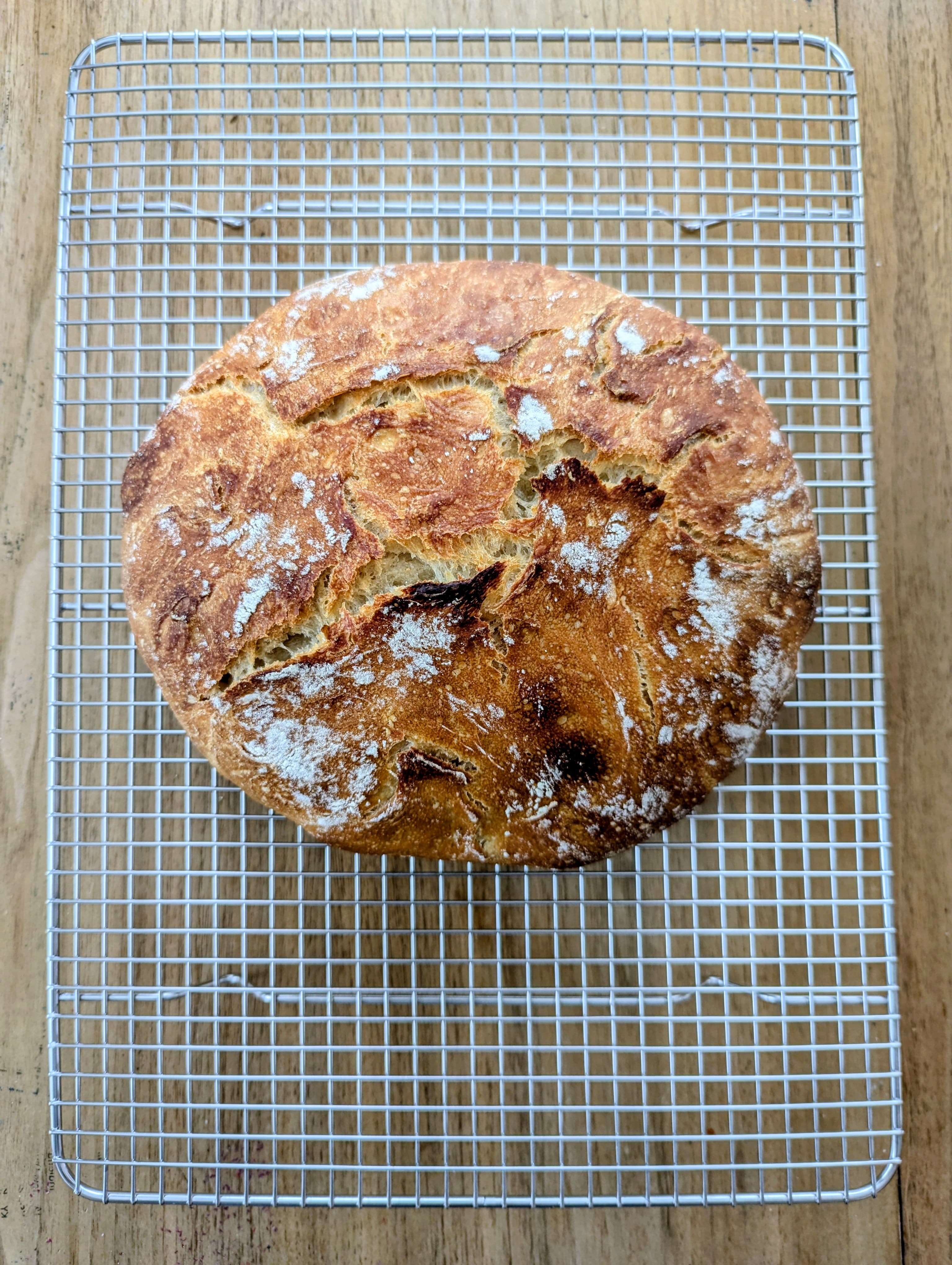 Today I made banana bars with maple-vanilla cream cheese frosting and a no-knead sourdough boule. Not bad for a first time, I hope. This poor starter has been through the ringer!