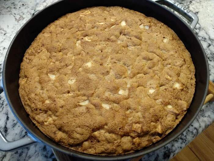 Raw Apple Cake. This is a recipe for a 12" camp oven so I always use my 4 qt Staub Cast Iron, just cuz. The kitchen smells of apples and cinnamon right now, it’s definitely autumn.