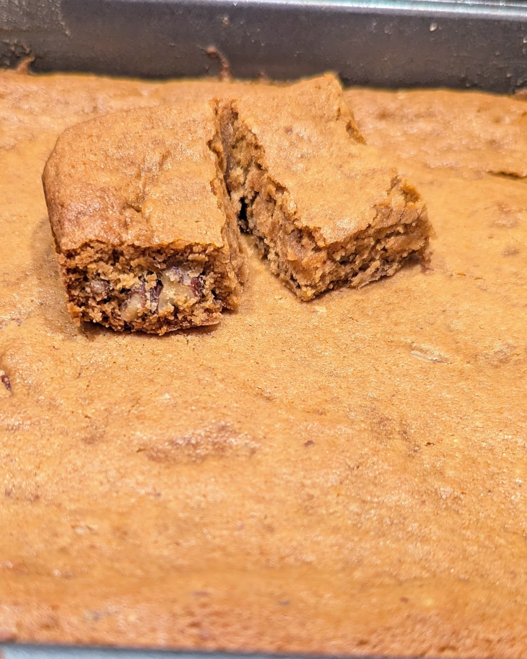 The kiddo and I baked this afternoon to stave off a “there’s no one to play with!” meltdown. Honey bars – subbing melted plant butter and applesauce for some of the oil. I banged the pan the last 8 minutes to make them chewier. Pretty tasty – I omitted the glaze. Might leave the pecans out next time for a more intense honey flavor.