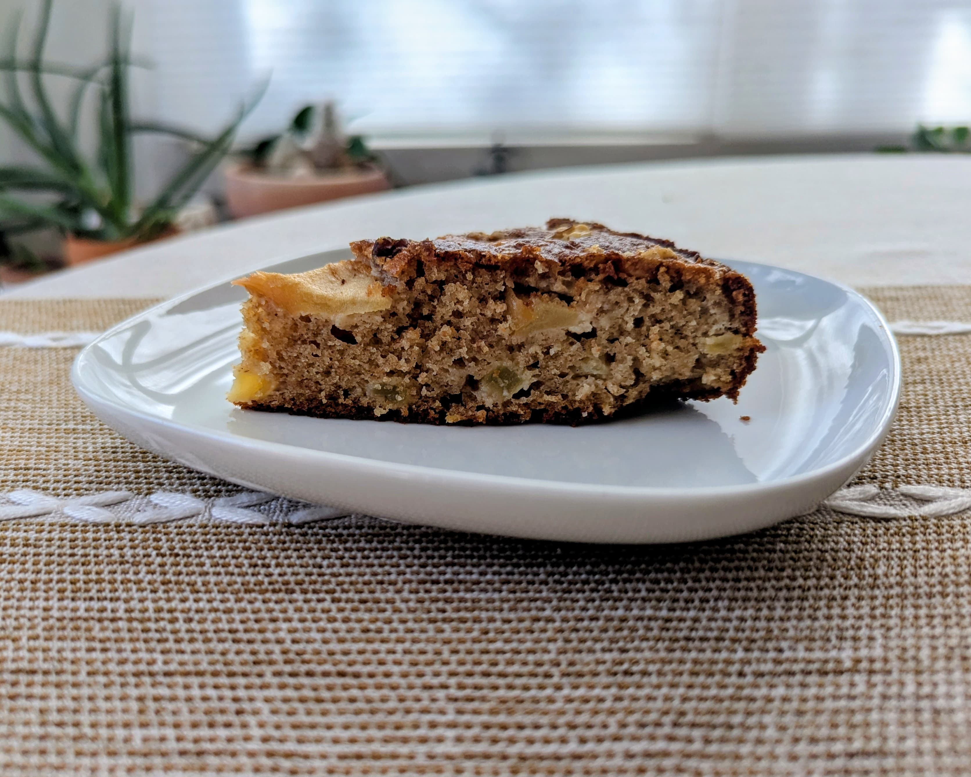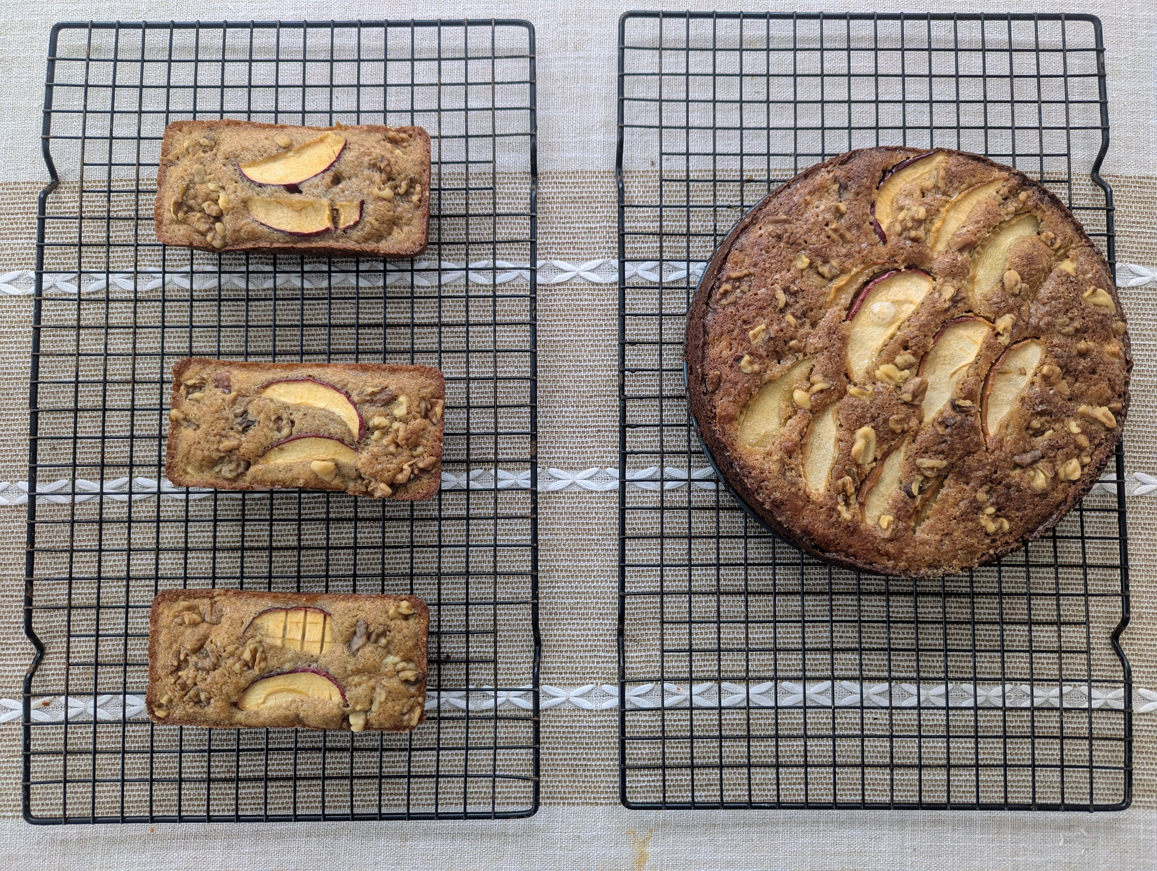 I turned Yossy Arefi’s peach ricotta cake into an apple-walnut yogurt cake. Did my usual tinkering (walnut and canola oil for butter; turbinado sugar for white, 2/3 ww flour) and it turned out well. Minis are for the teachers.