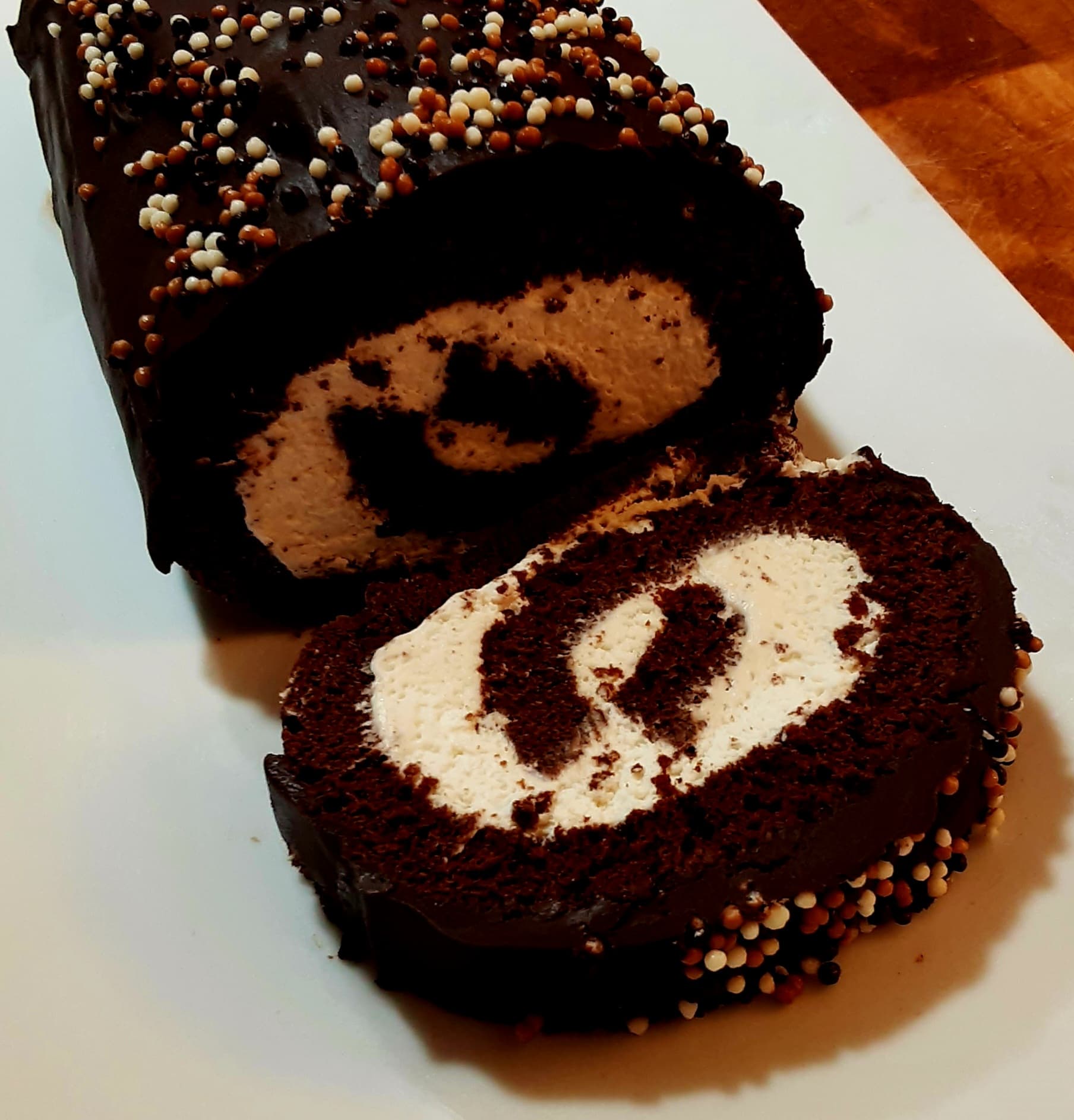 Thanksgiving dessert was a soft chocolate swiss roll cake. I stabilized the whip cream with cream cheese and it took some if the sweertness of the icing sugar off. Very delicious.